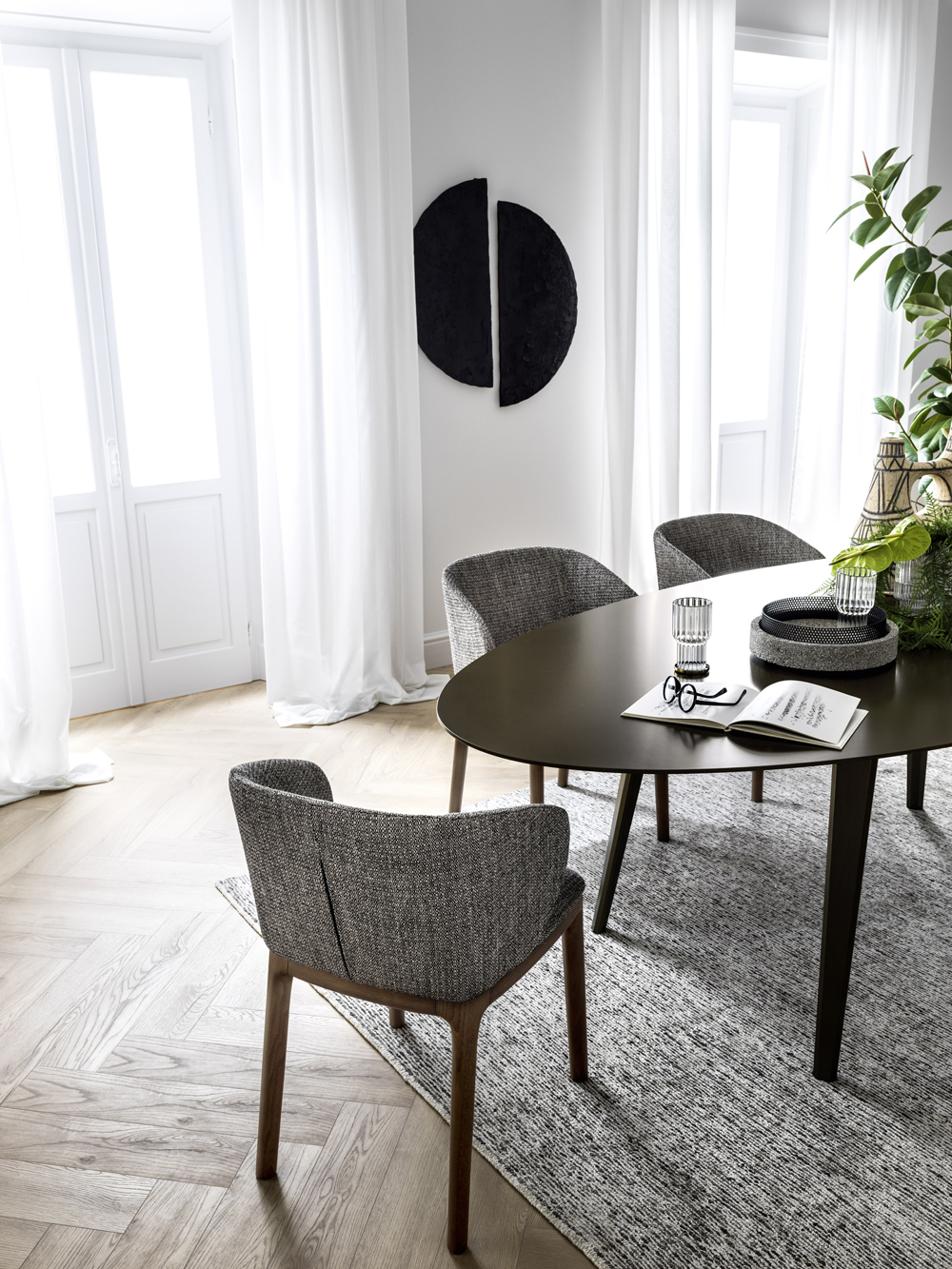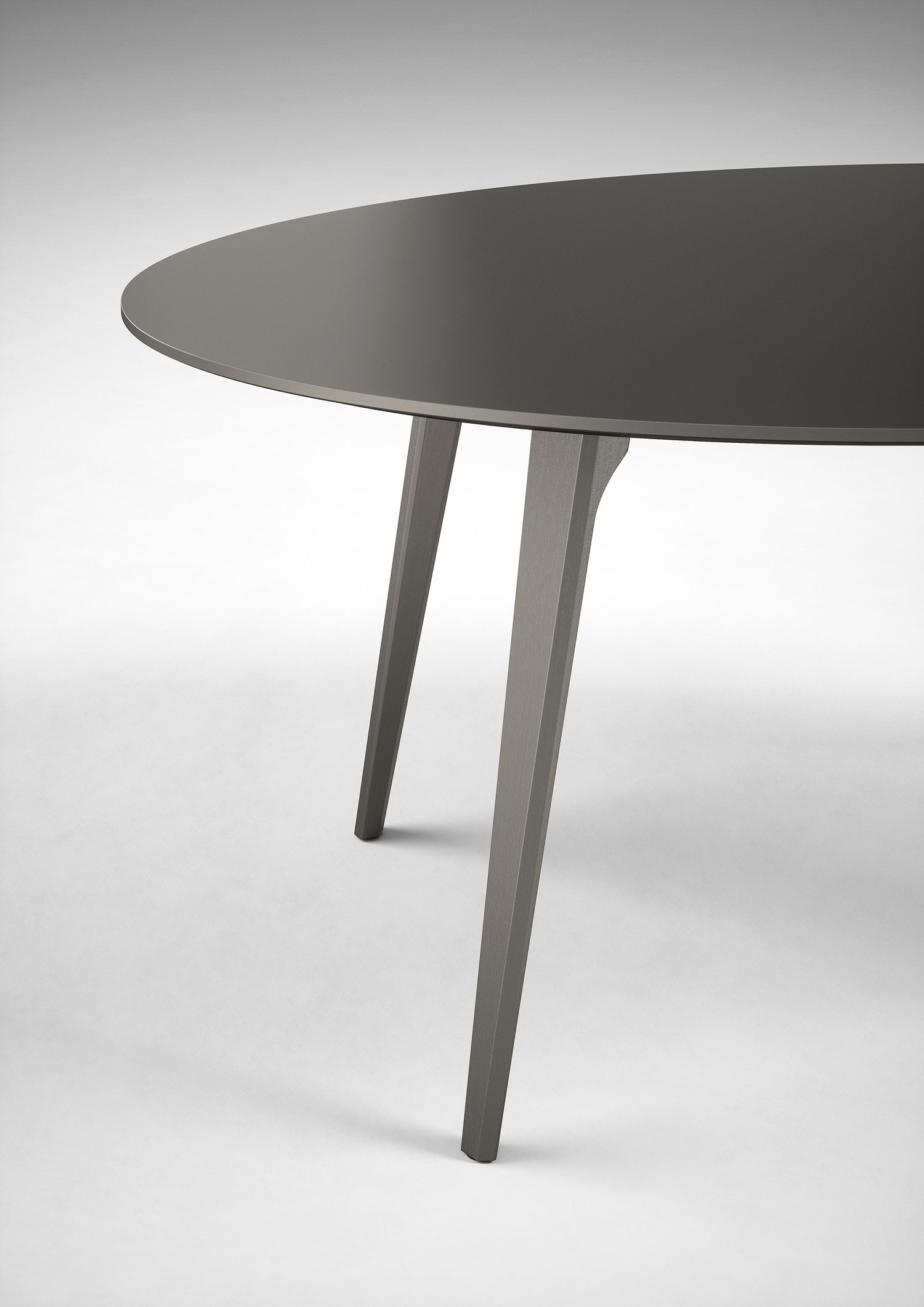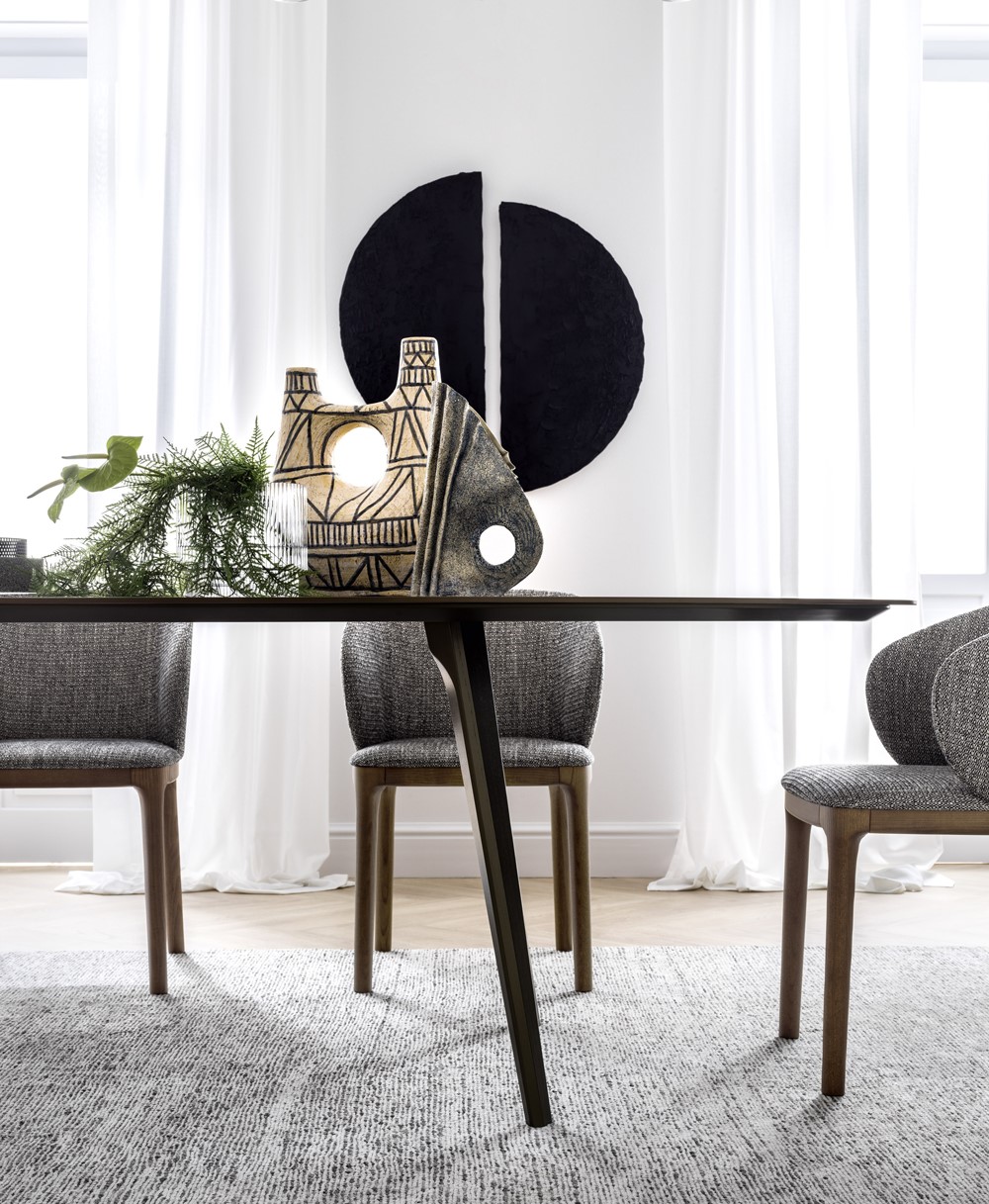 The Rea table, crafted by Novamobili Studio, combines minimalist influence with contemporary functionality. Its oval shape and subtly flared legs create a light and streamlined aesthetic, available with matching or contrasting finishes.
