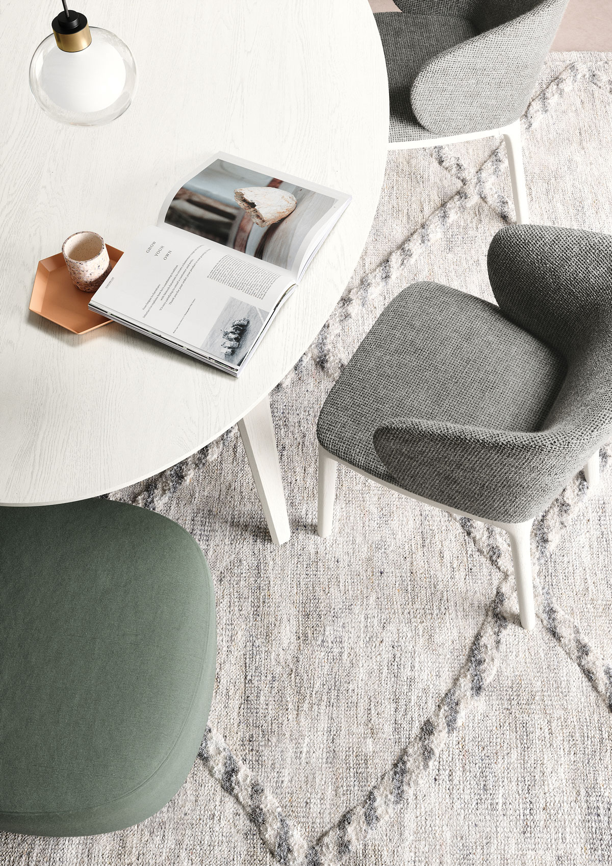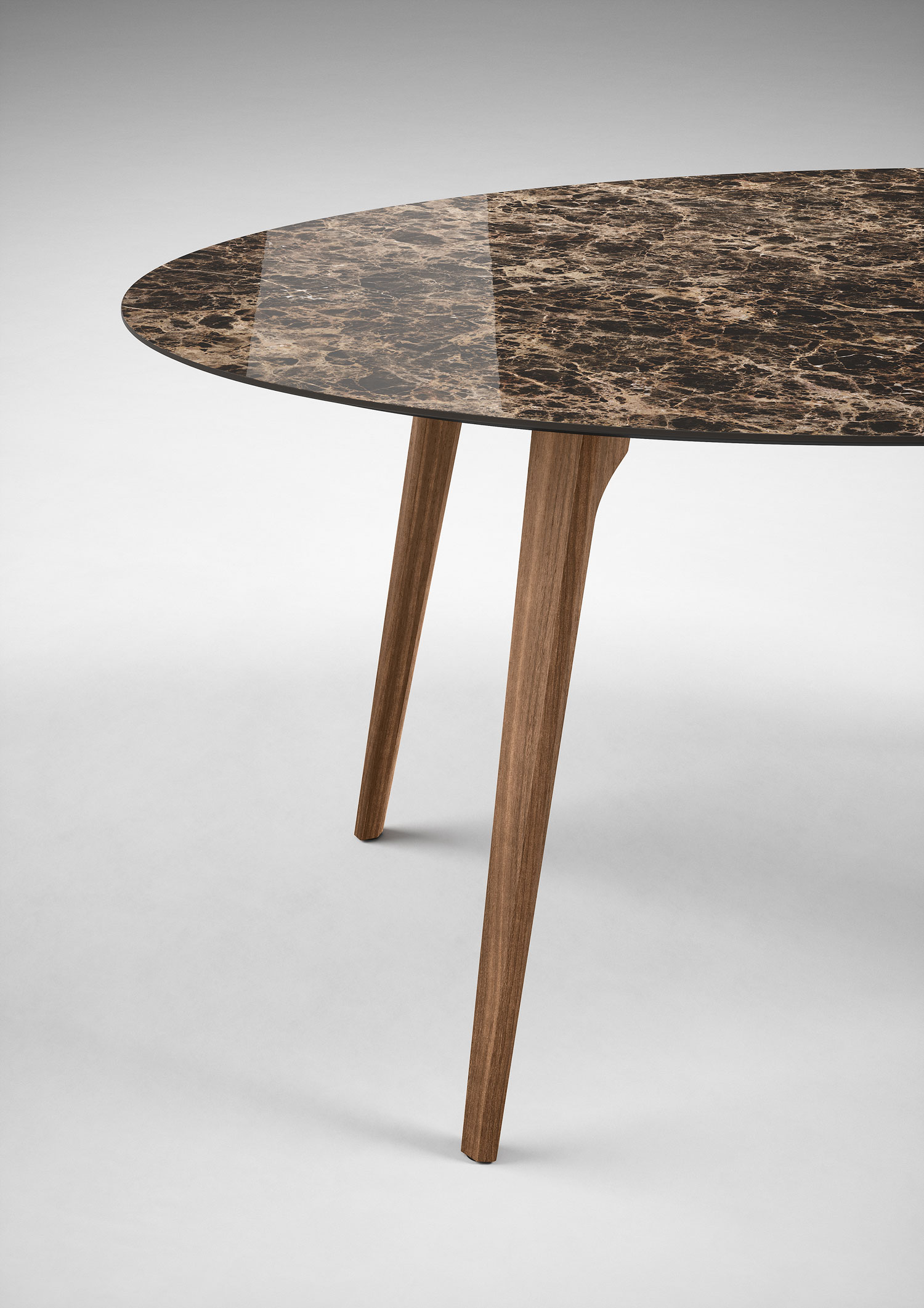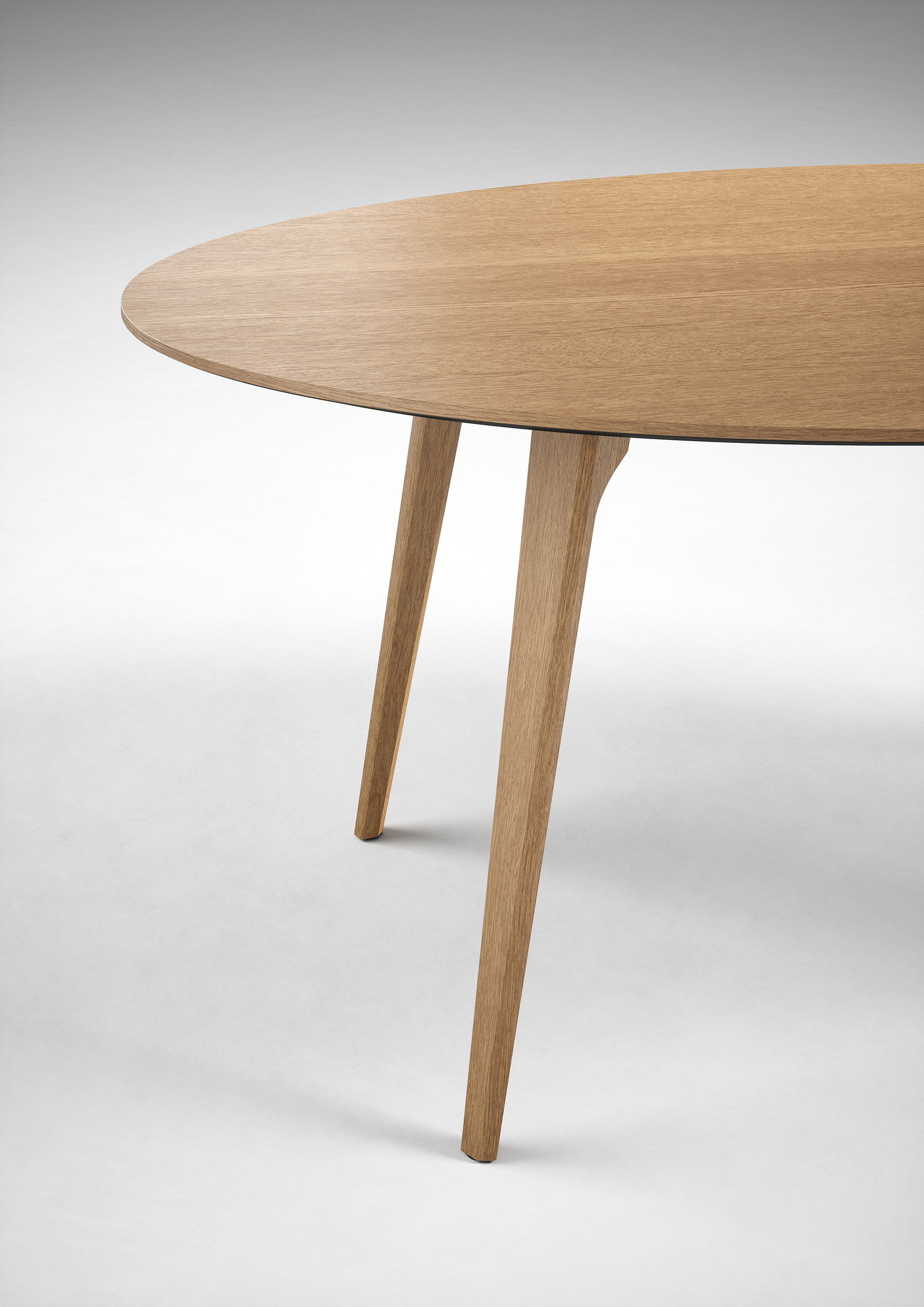The Rea table, crafted by Novamobili Studio, combines minimalist influence with contemporary functionality. Its oval shape and subtly flared legs create a light and streamlined aesthetic, available with matching or contrasting finishes.