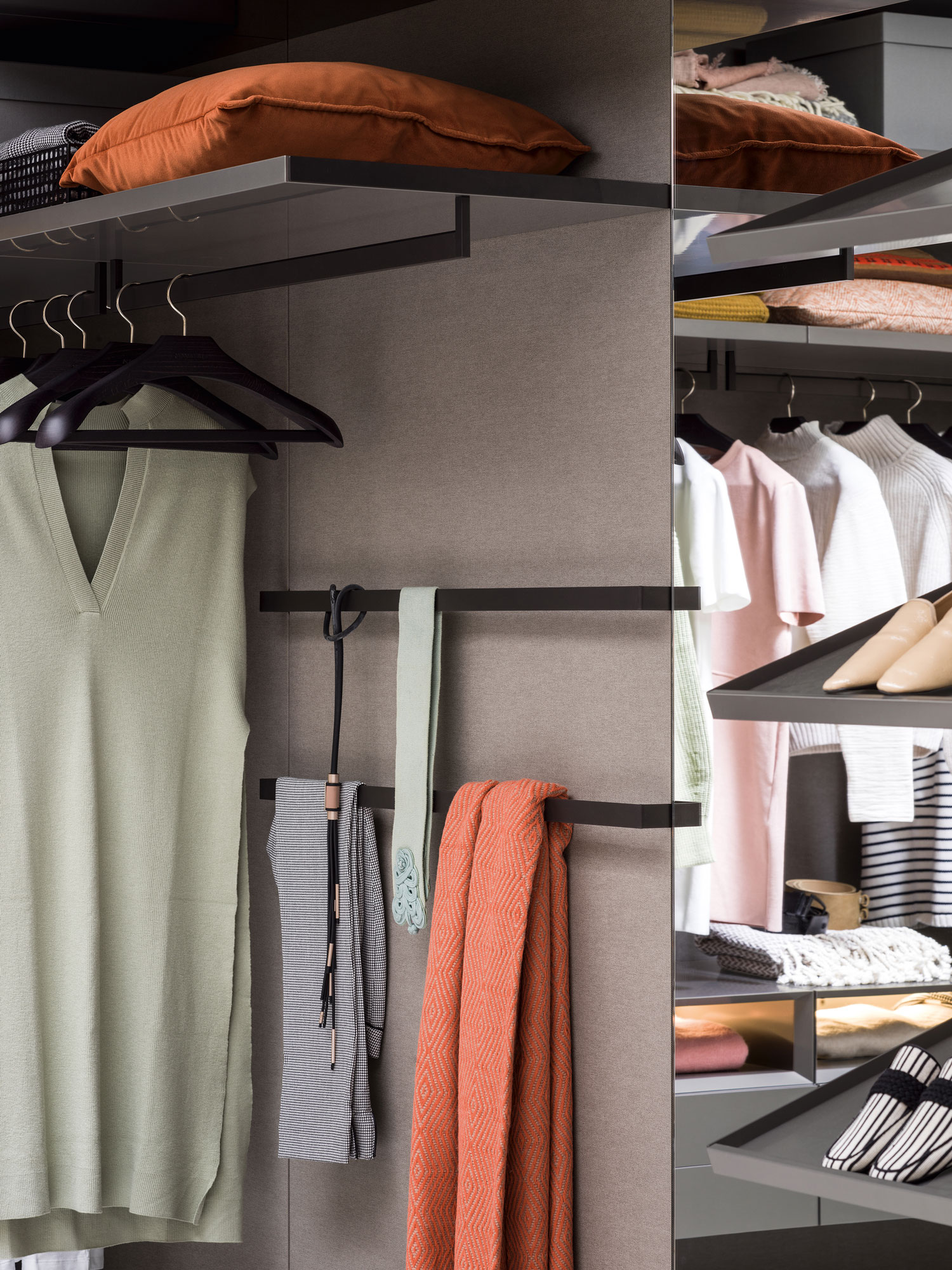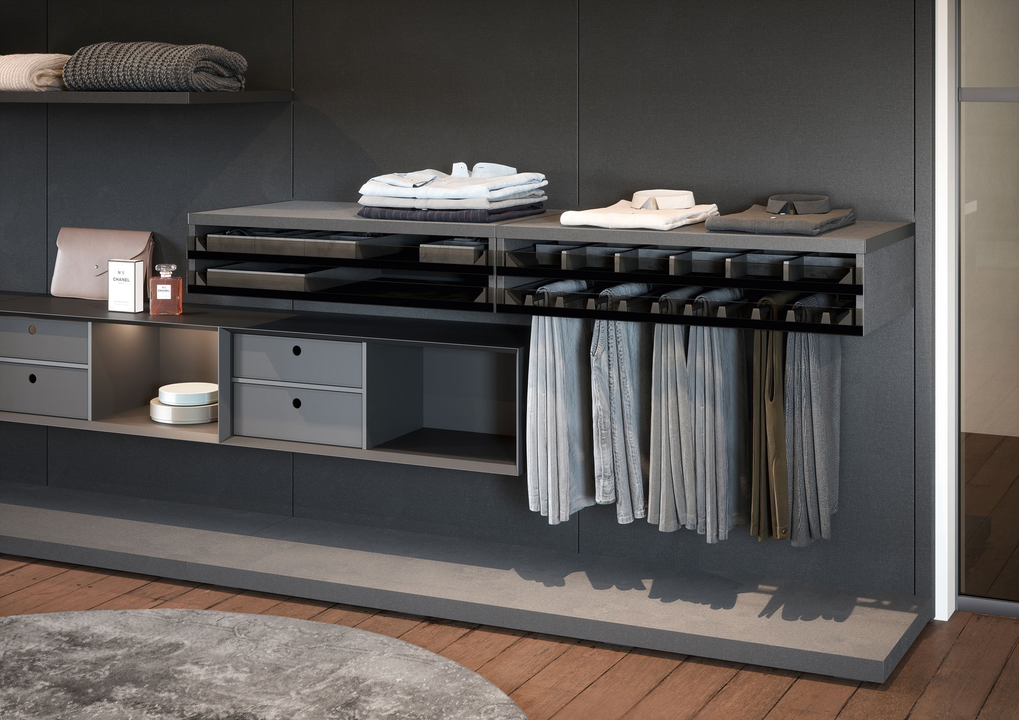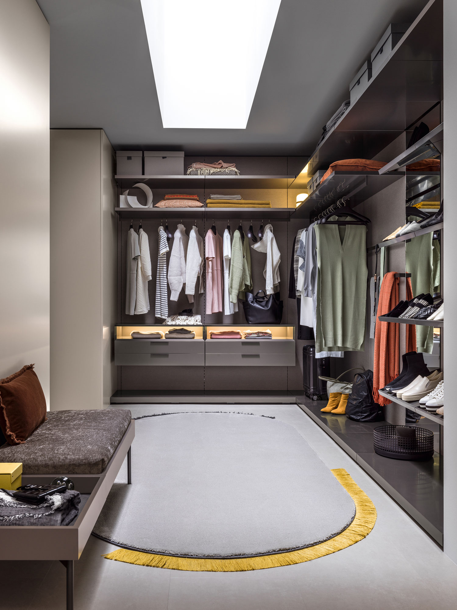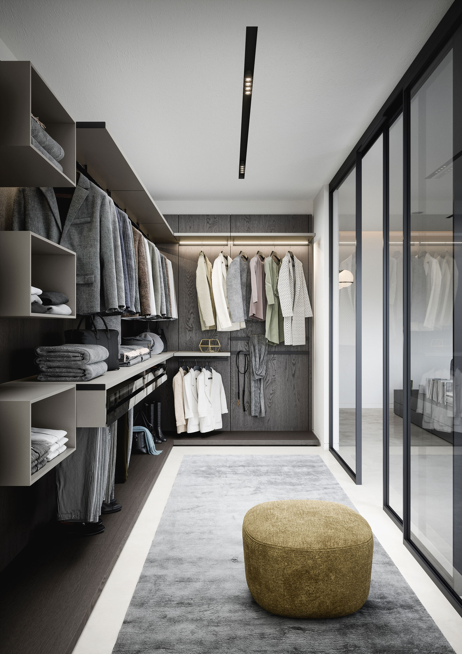 Spacious, functional, and modular, the Break walk-in closet can be fitted with corner modules, LED lighting on the back of shelves, smoked glass drawers, hanging rails, and accessories in bronze finish. Thanks to its slotted rail system, which requires no supporting side panels, it has a beautiful, visually light appearance.