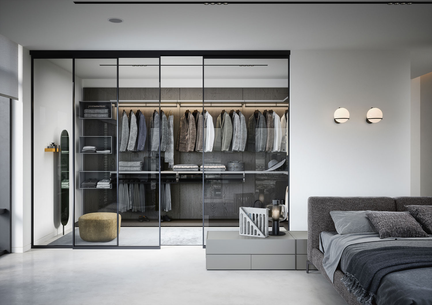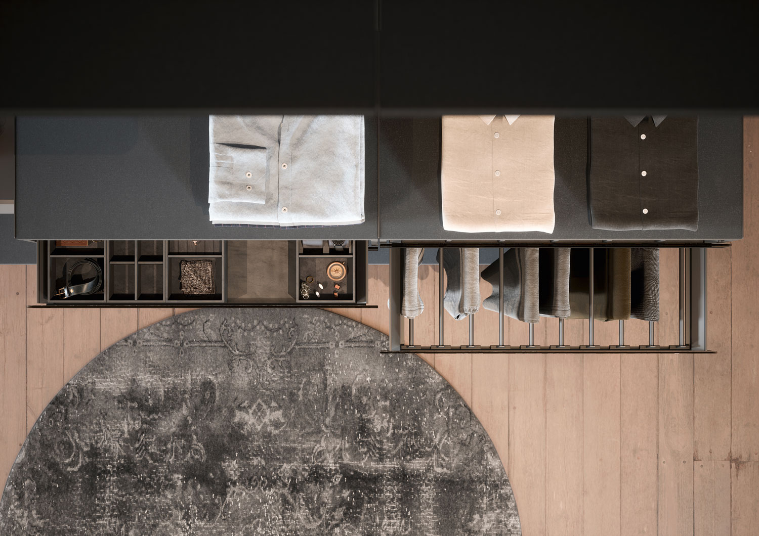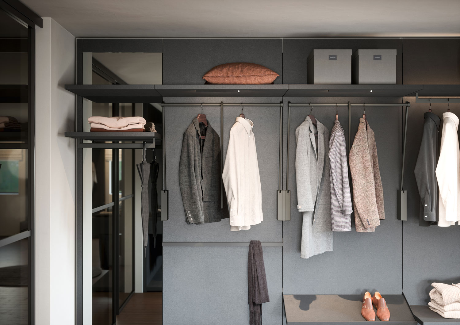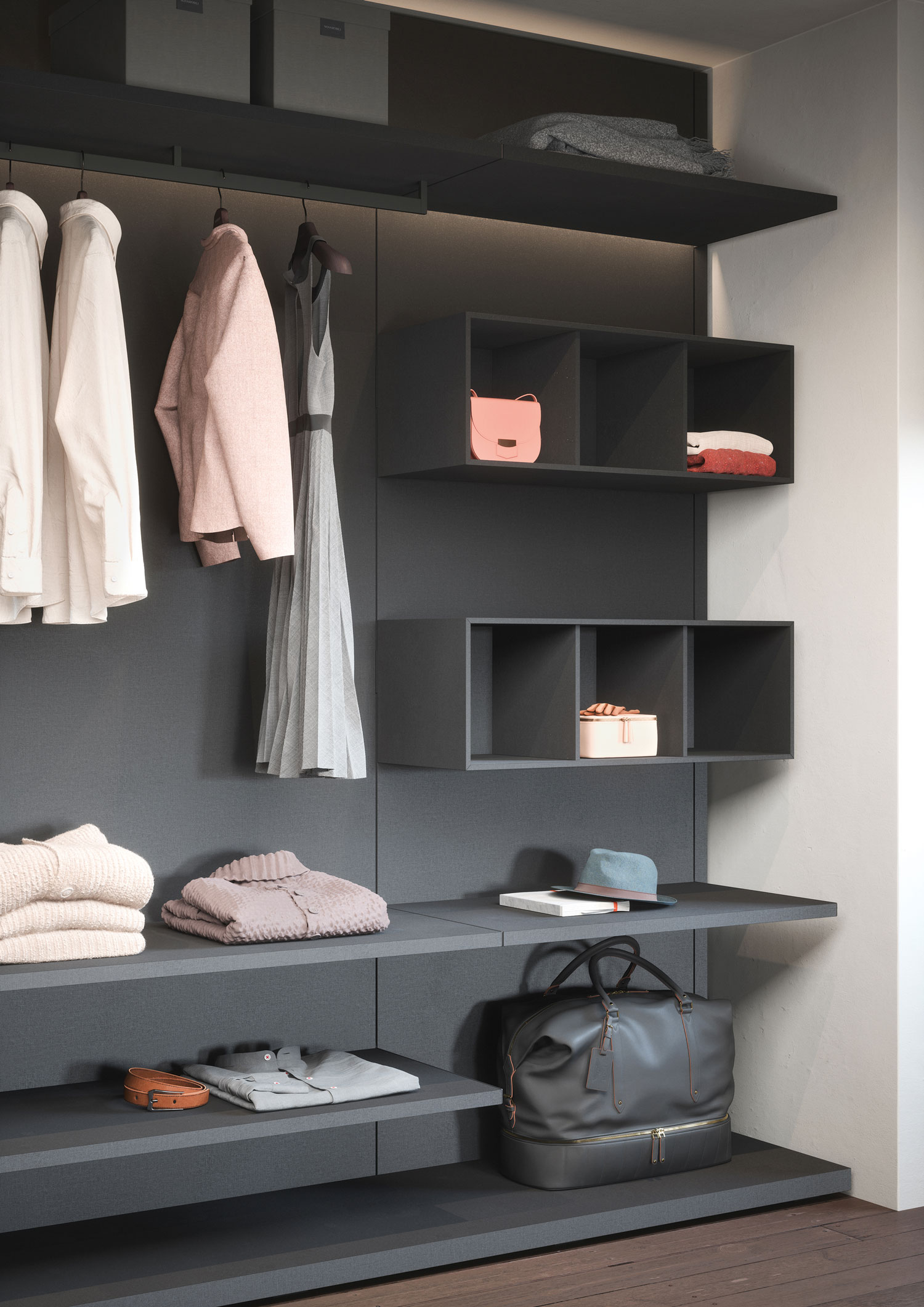 Spacious, functional, and modular, the Break walk-in closet can be fitted with corner modules, LED lighting on the back of shelves, smoked glass drawers, hanging rails, and accessories in bronze finish. Thanks to its slotted rail system, which requires no supporting side panels, it has a beautiful, visually light appearance.