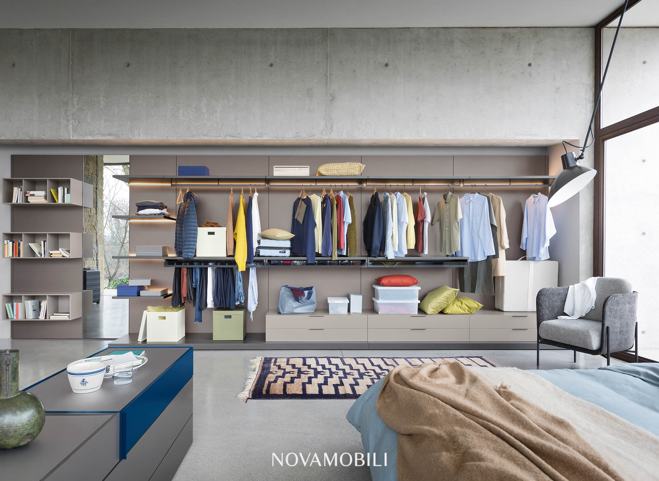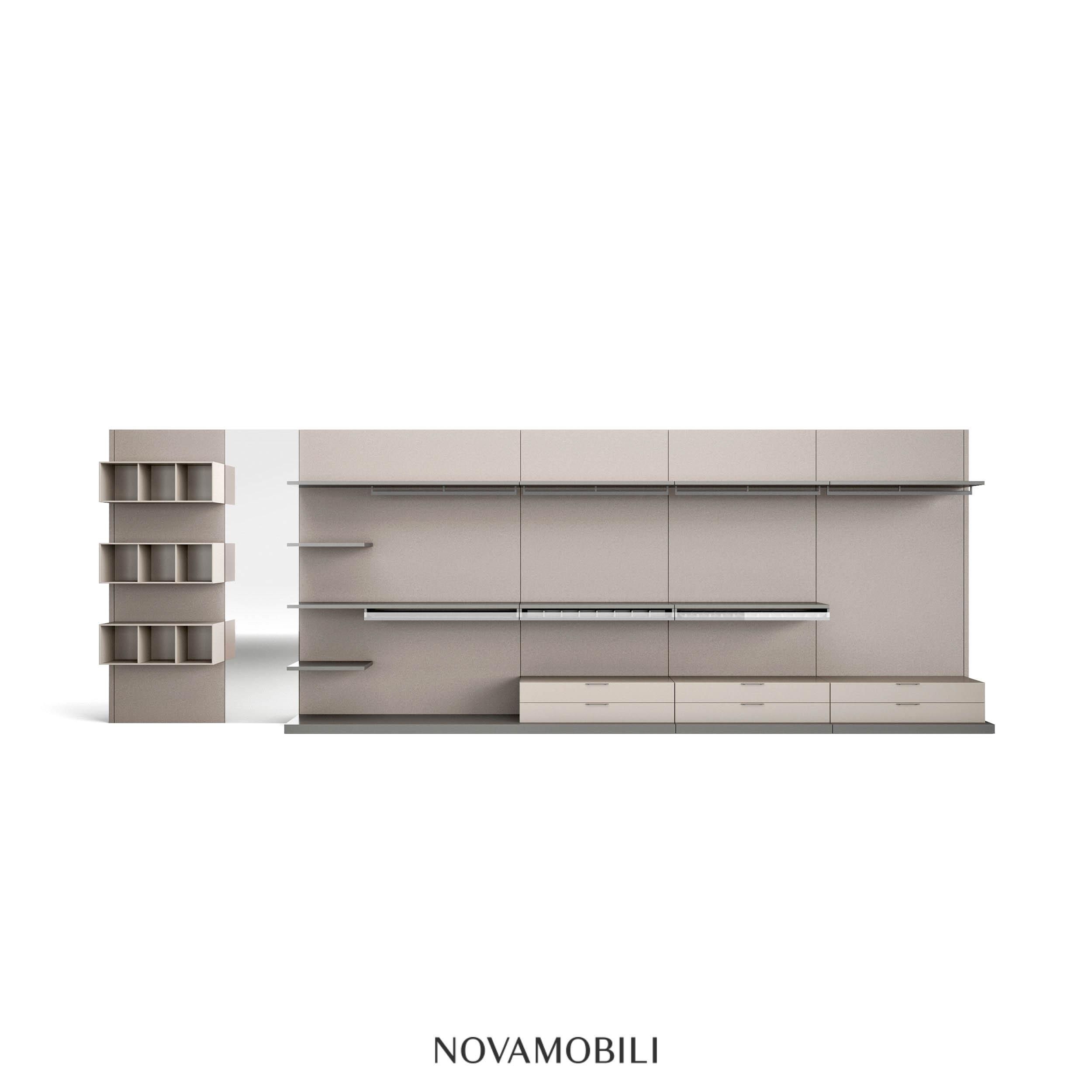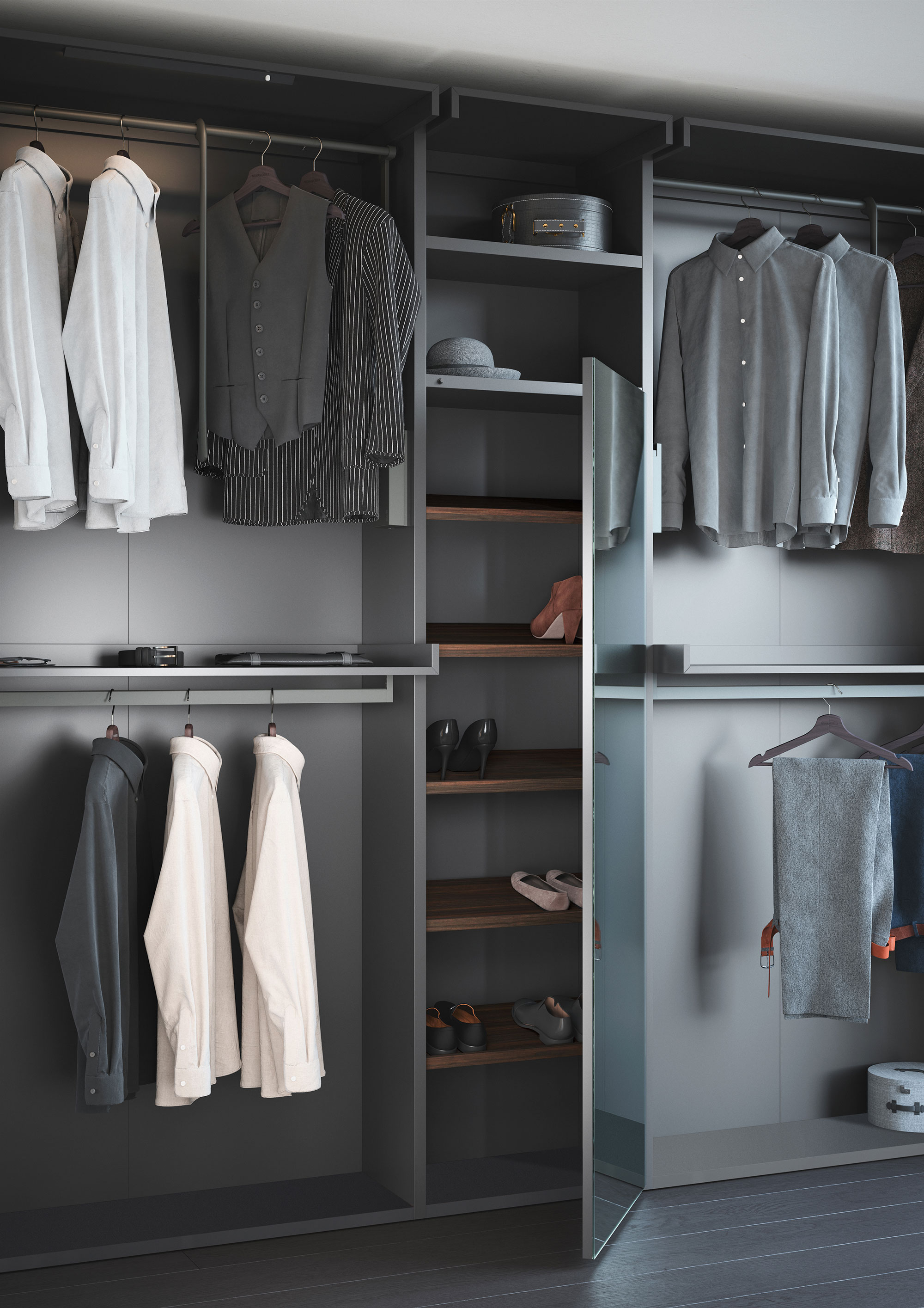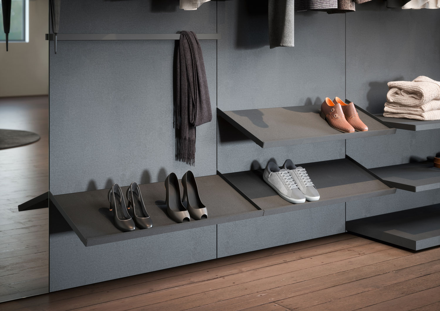 Spacious, functional, and modular, the Break walk-in closet can be fitted with corner modules, LED lighting on the back of shelves, smoked glass drawers, hanging rails, and accessories in bronze finish. Thanks to its slotted rail system, which requires no supporting side panels, it has a beautiful, visually light appearance.