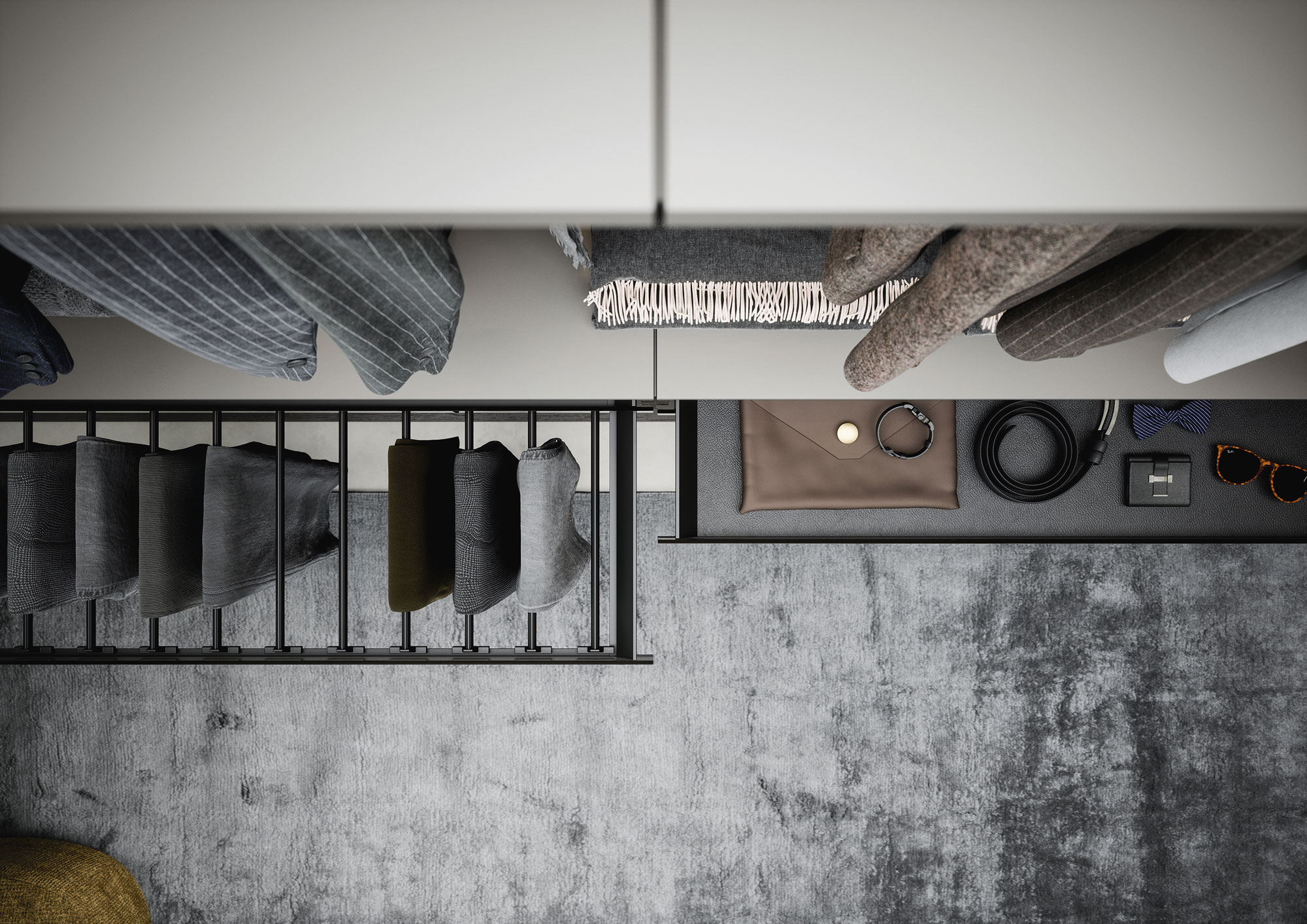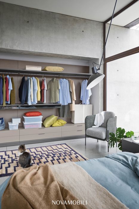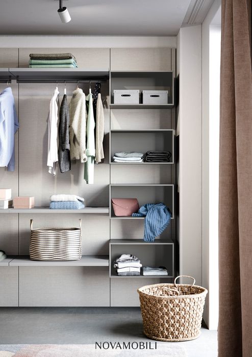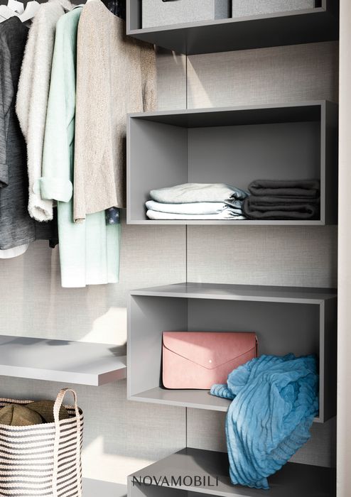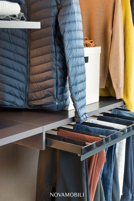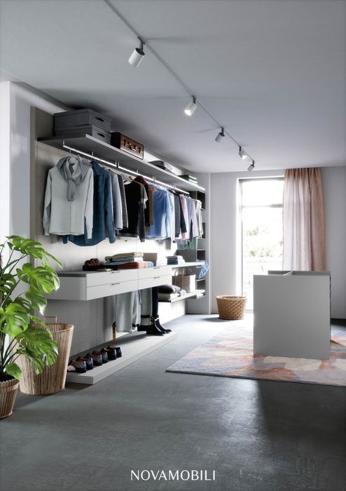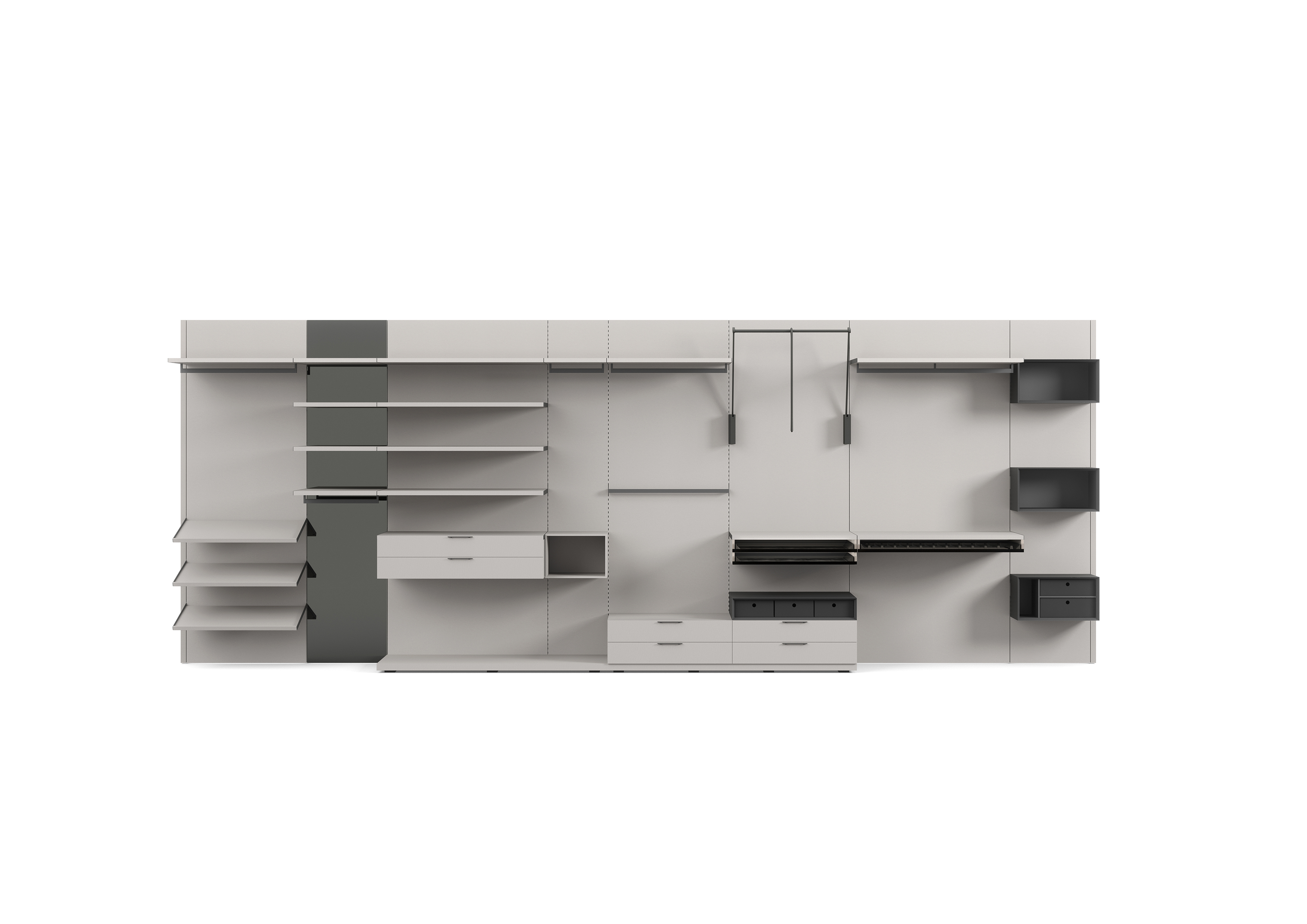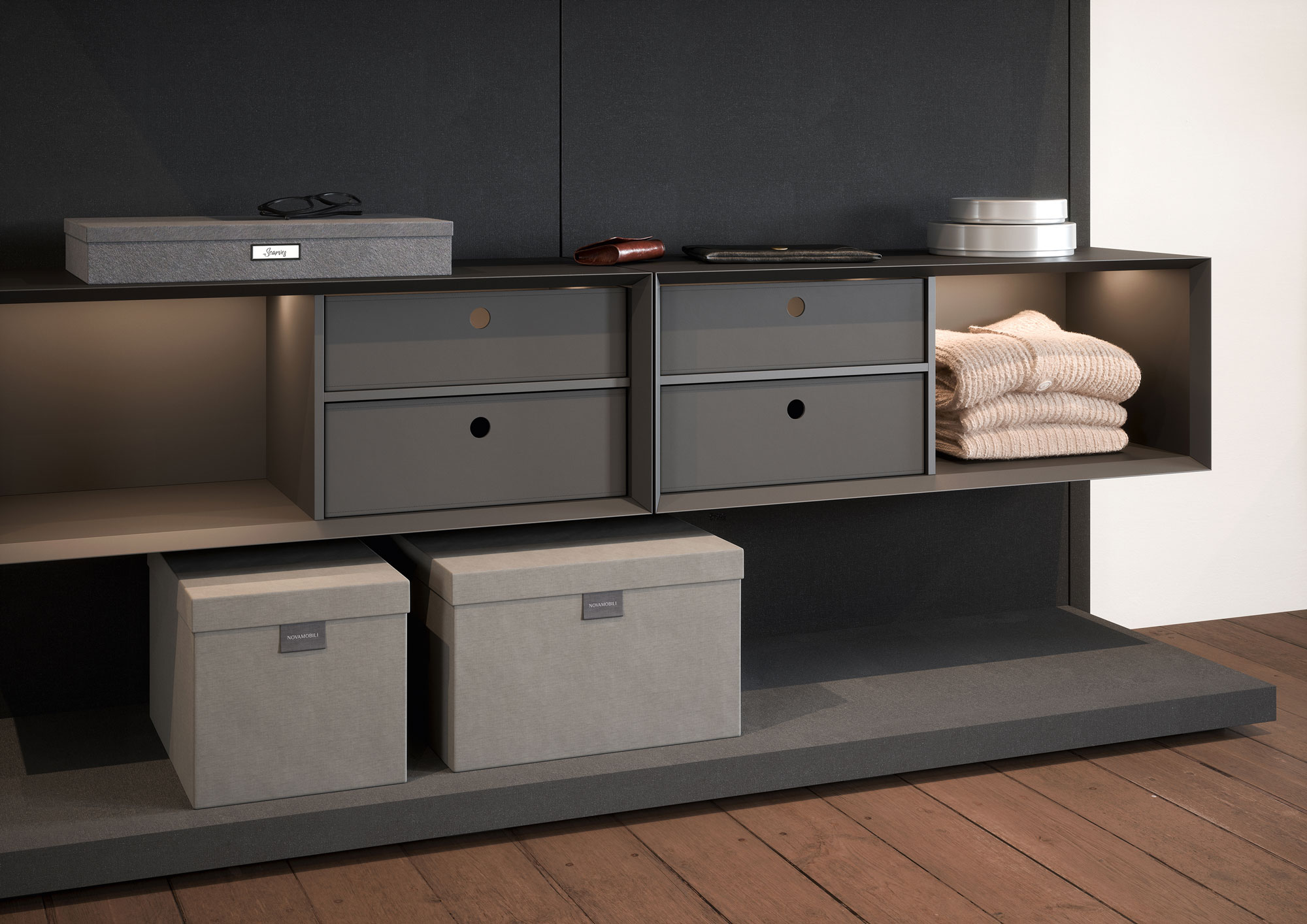 Spacious, functional, and modular, the Break walk-in closet can be fitted with corner modules, LED lighting on the back of shelves, smoked glass drawers, hanging rails, and accessories in bronze finish. Thanks to its slotted rail system, which requires no supporting side panels, it has a beautiful, visually light appearance.