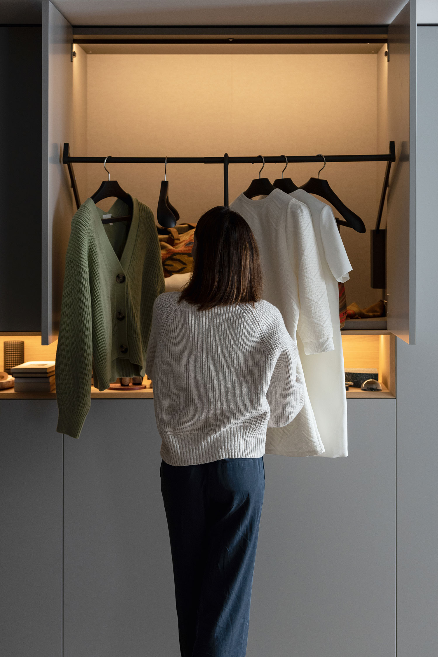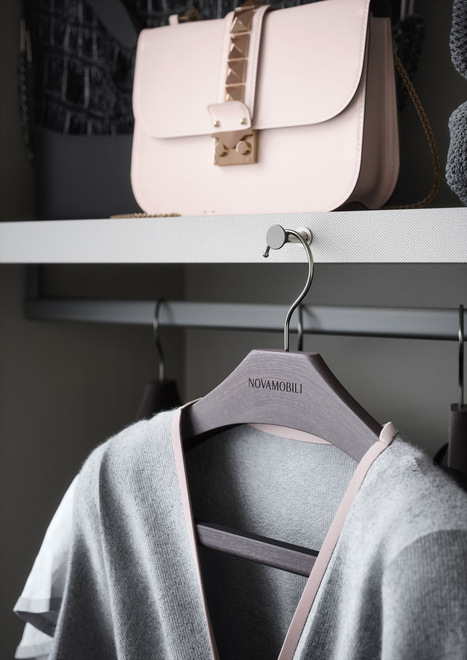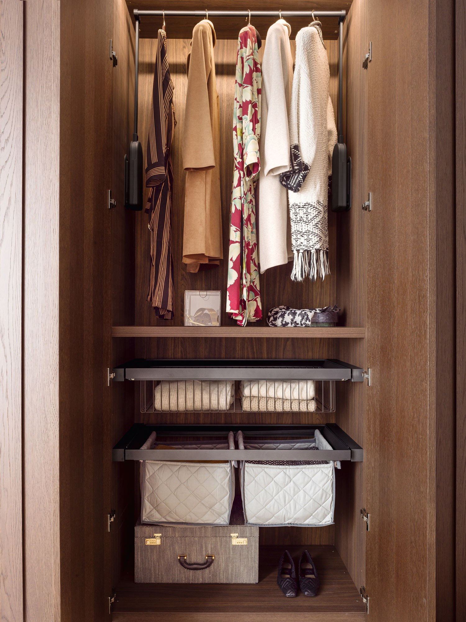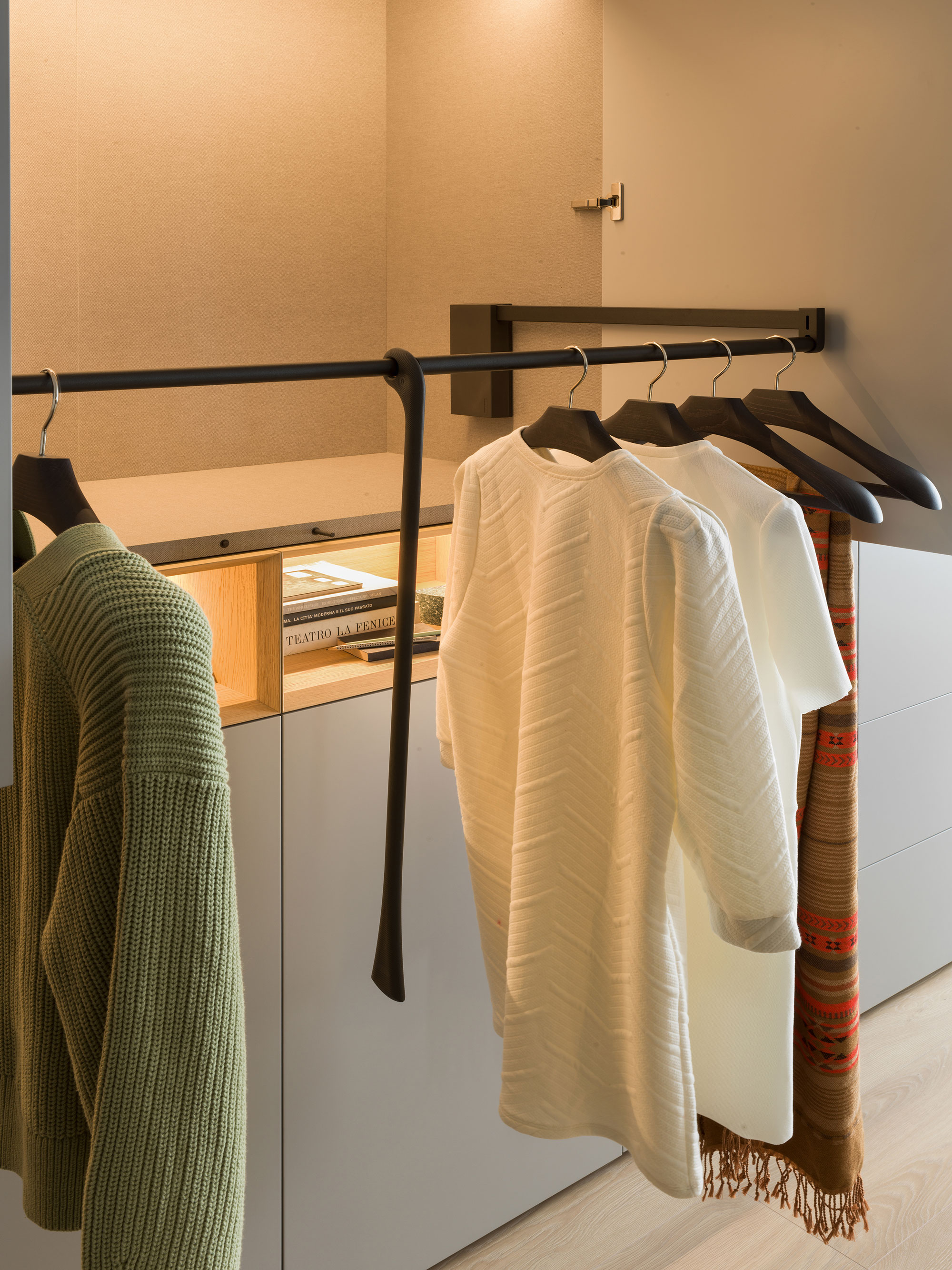 Novamobili clothes racks and hanging rails optimize wardrobe interiors, ideal for walk-in closets or standard wardrobes. They provide a stylish and efficient way to organize clothing, including innovative options like motorized clothes lifts.