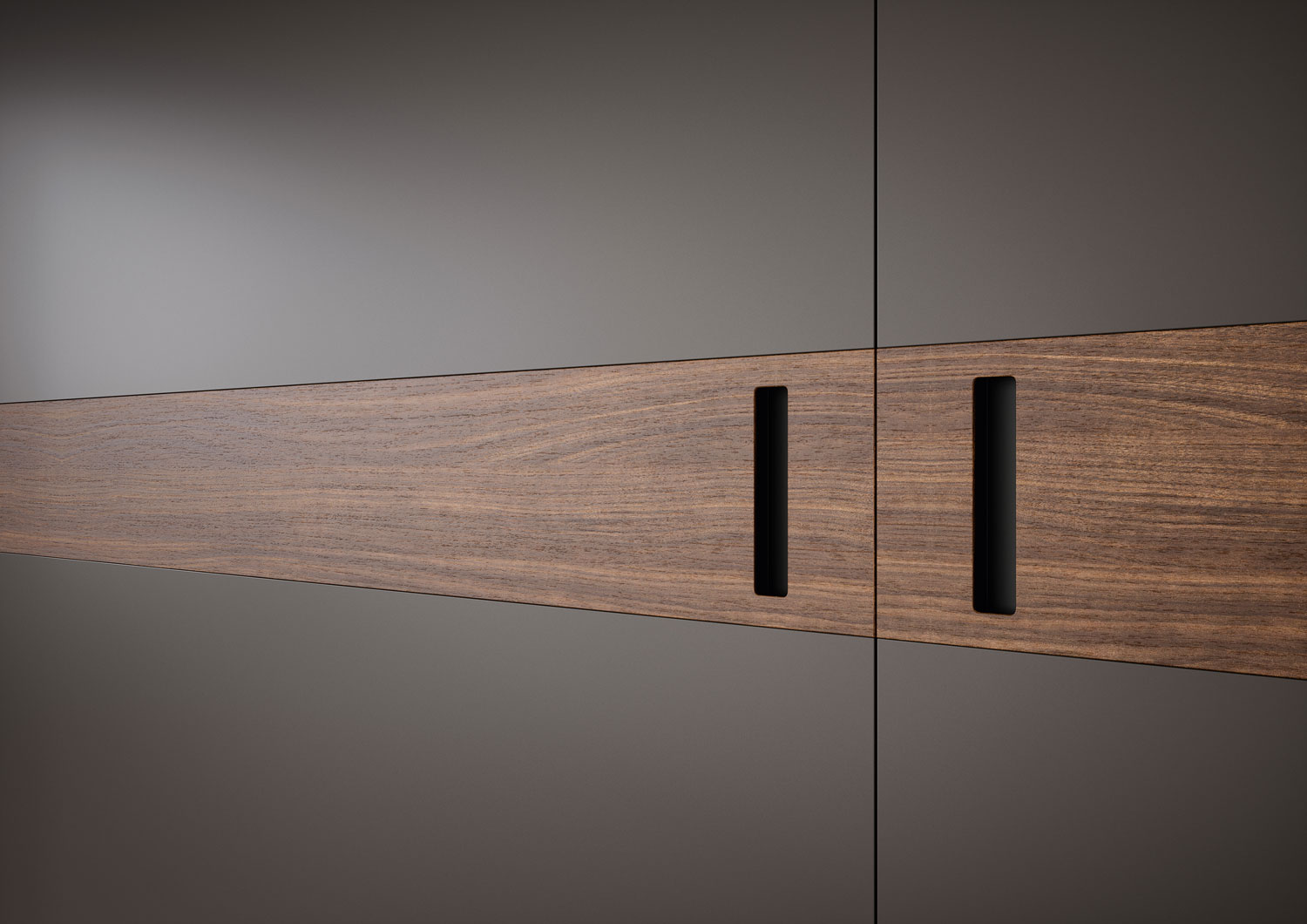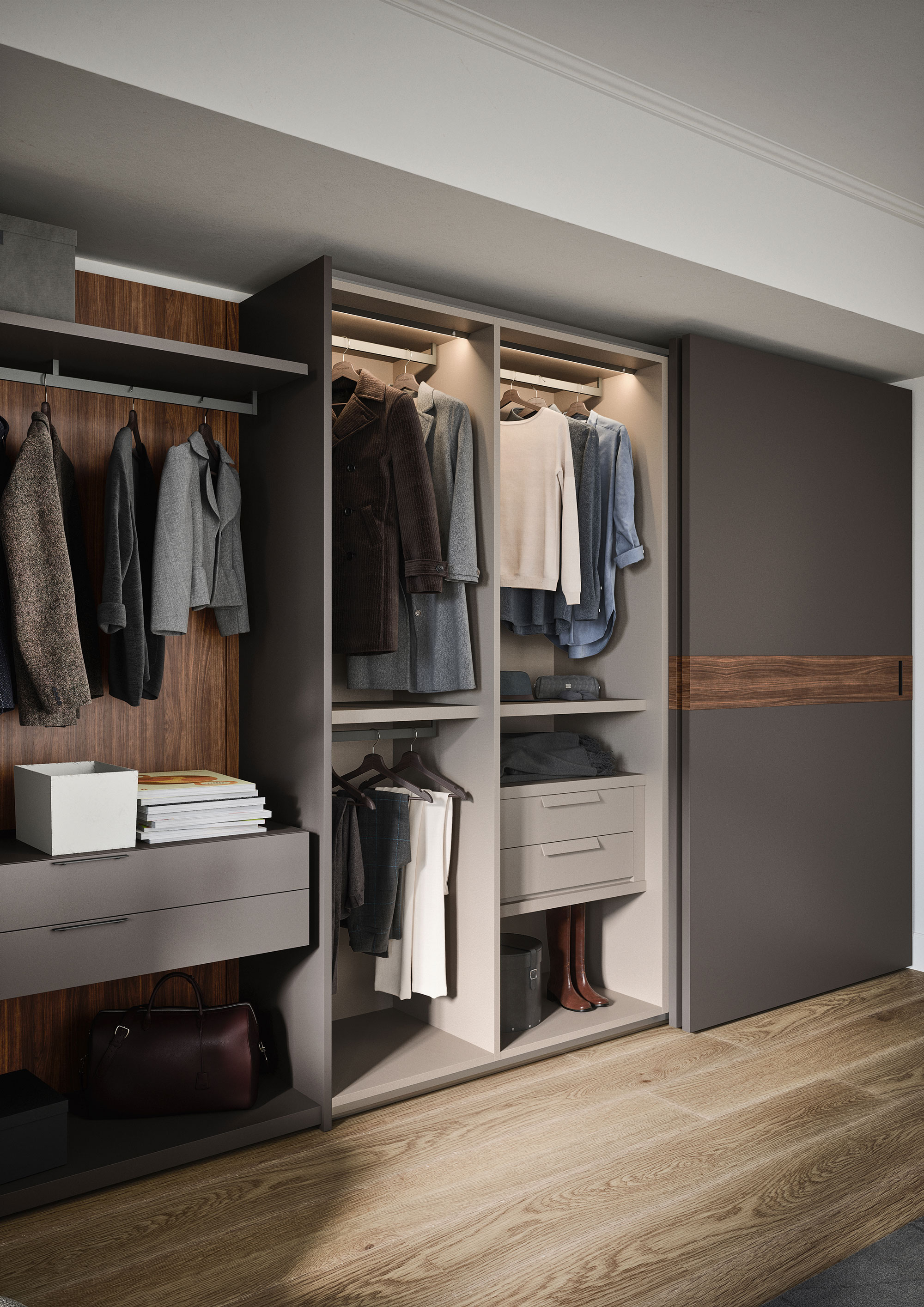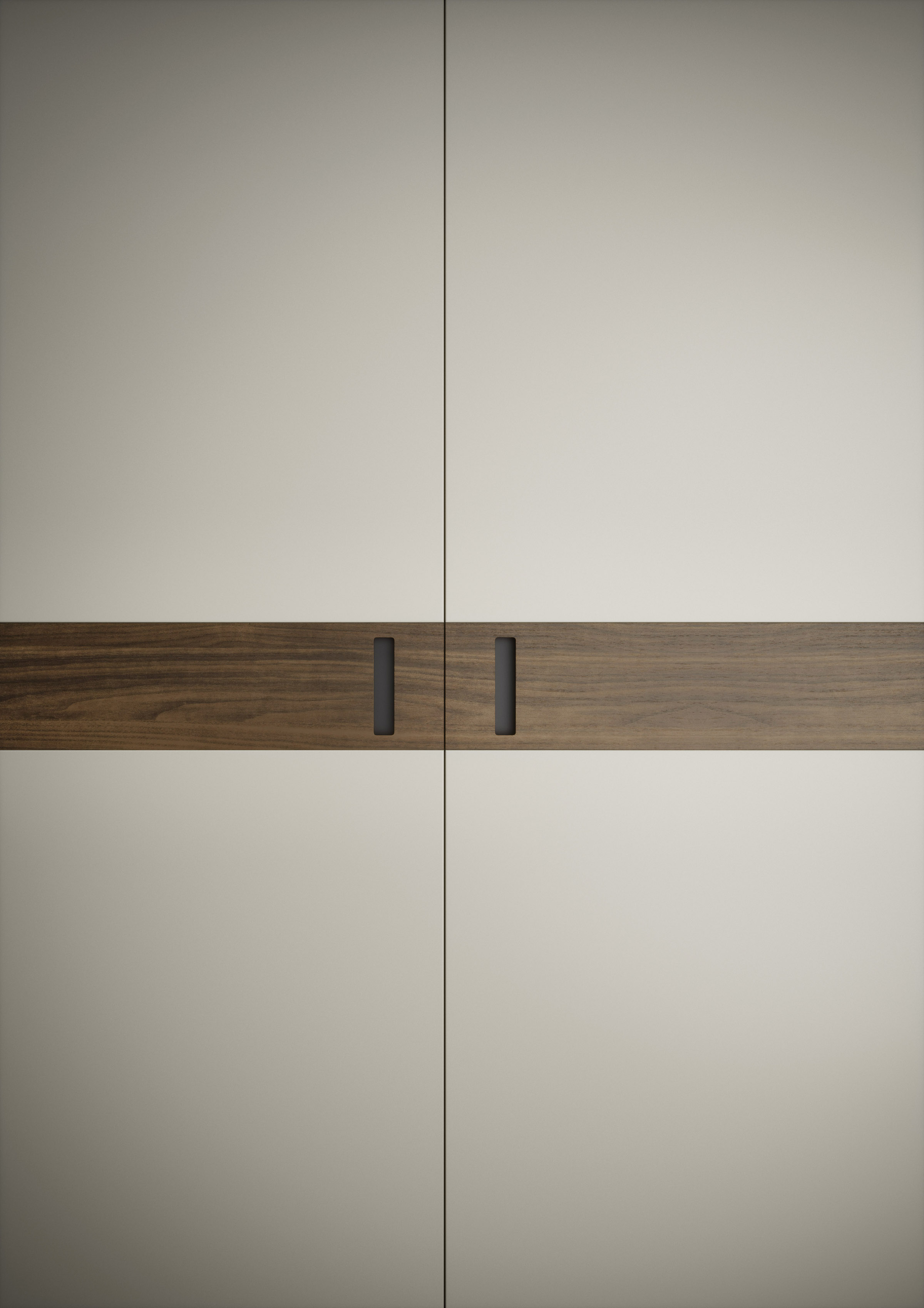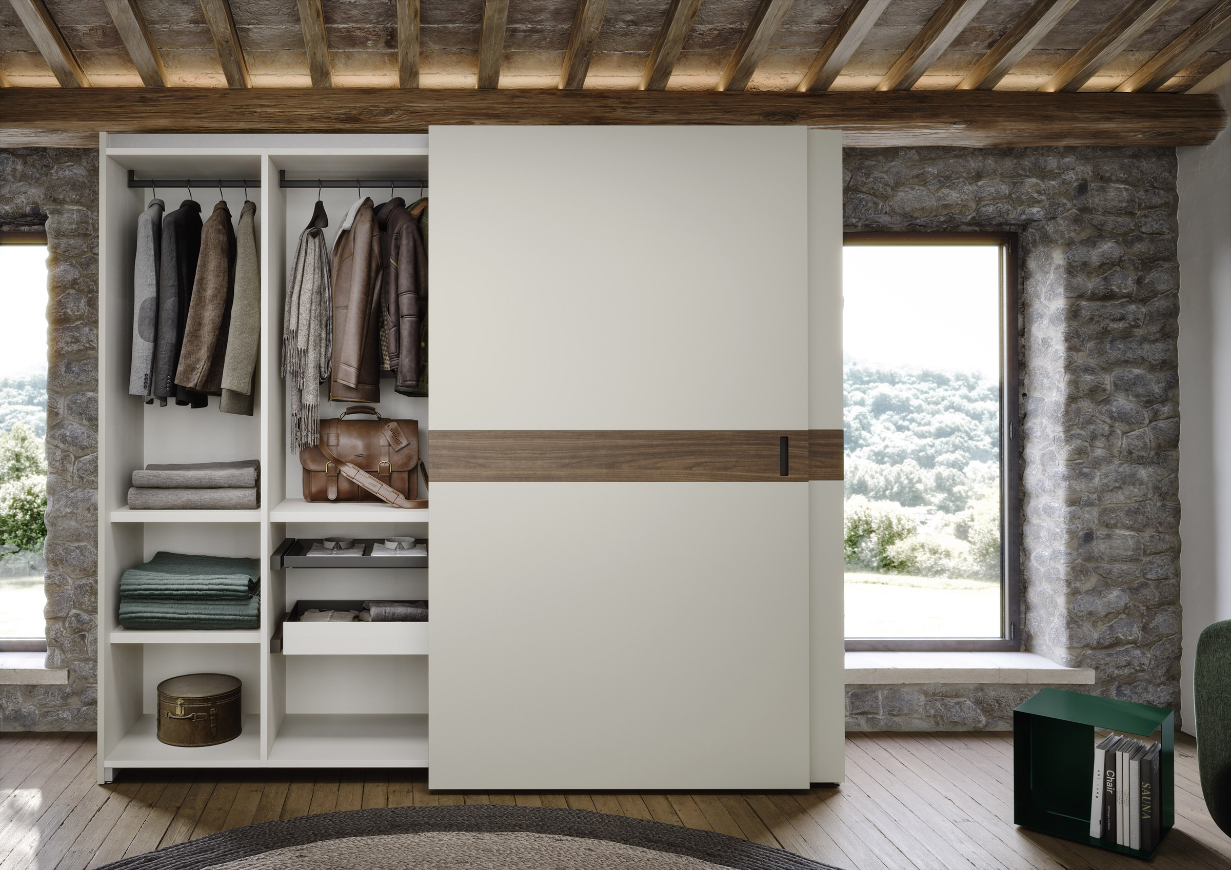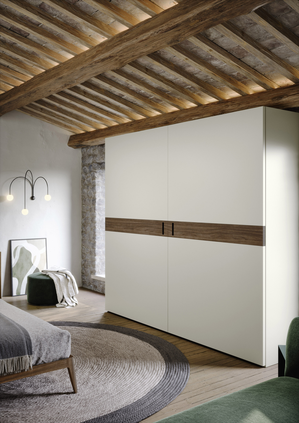 The Class wardrobe exudes elegance with its sleek, flush-closing doors and color-coordinated handles. Available in various lacquered colors with a noce canaletto central insert, it offers versatile installation options.