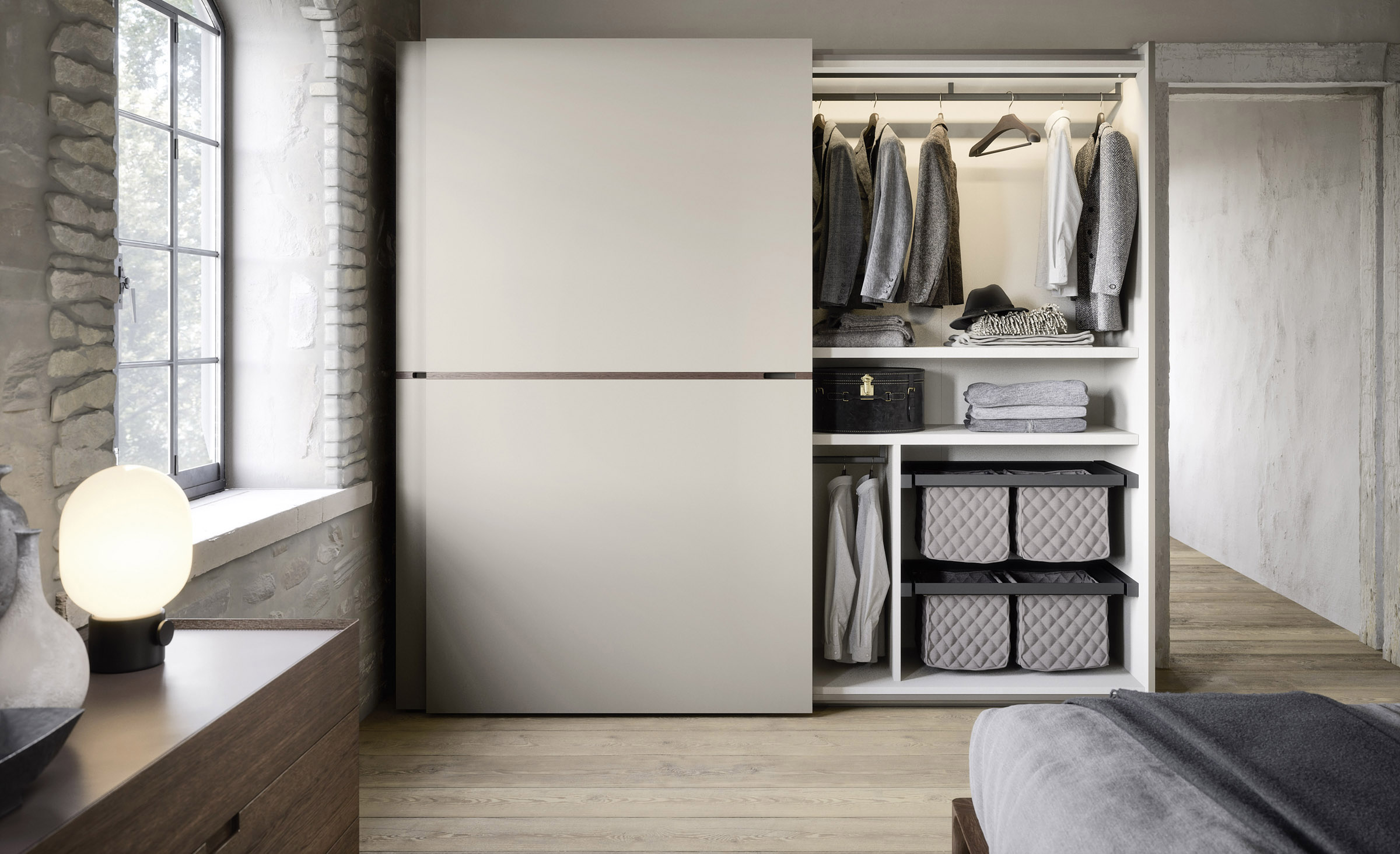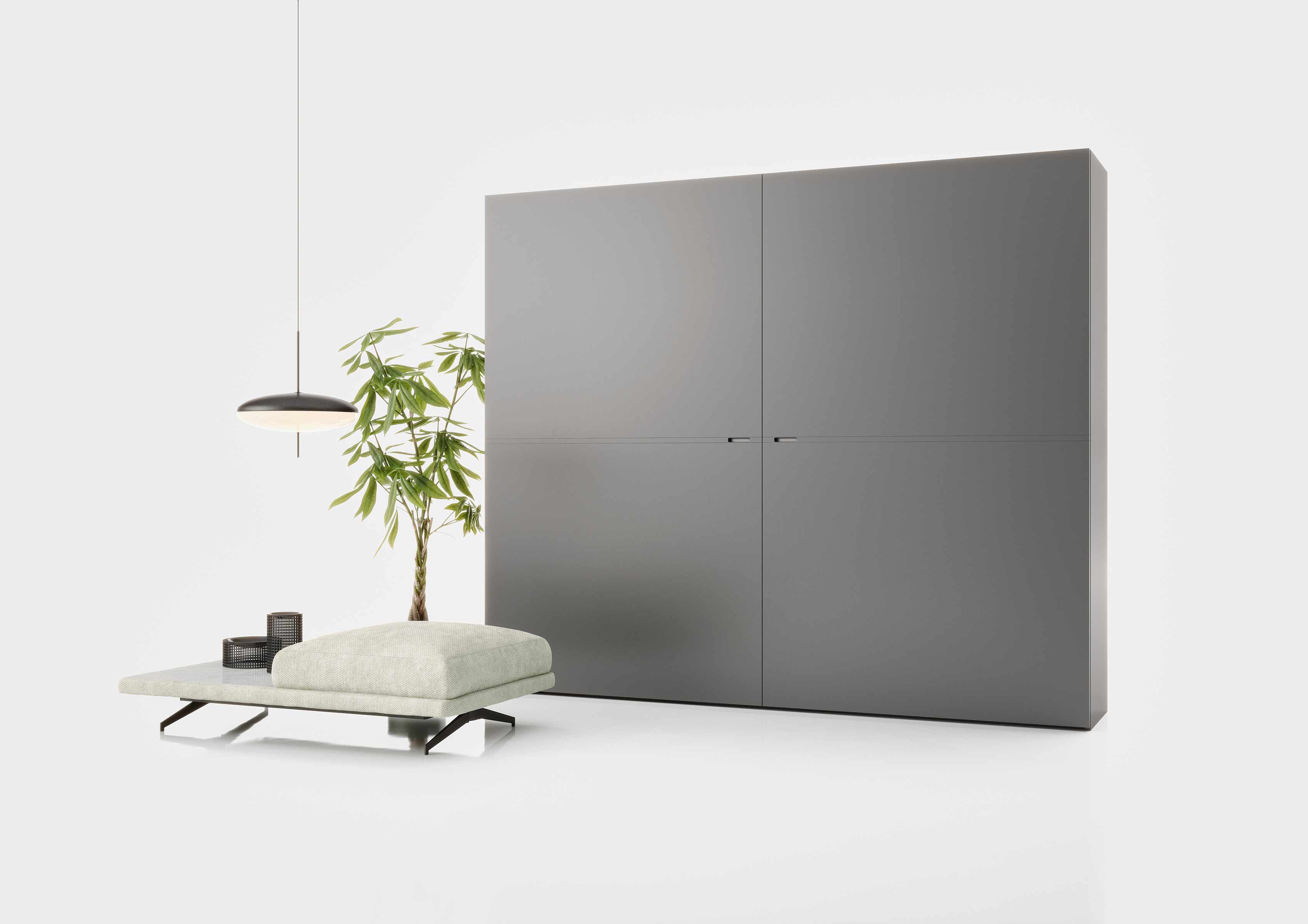 The Middle wardrobe exudes a refined elegance with its flush-closing doors and a choice of panels in matte, gloss, or oxidized lacquered colors, complemented by veneered central inserts. It offers flexible installation options.
