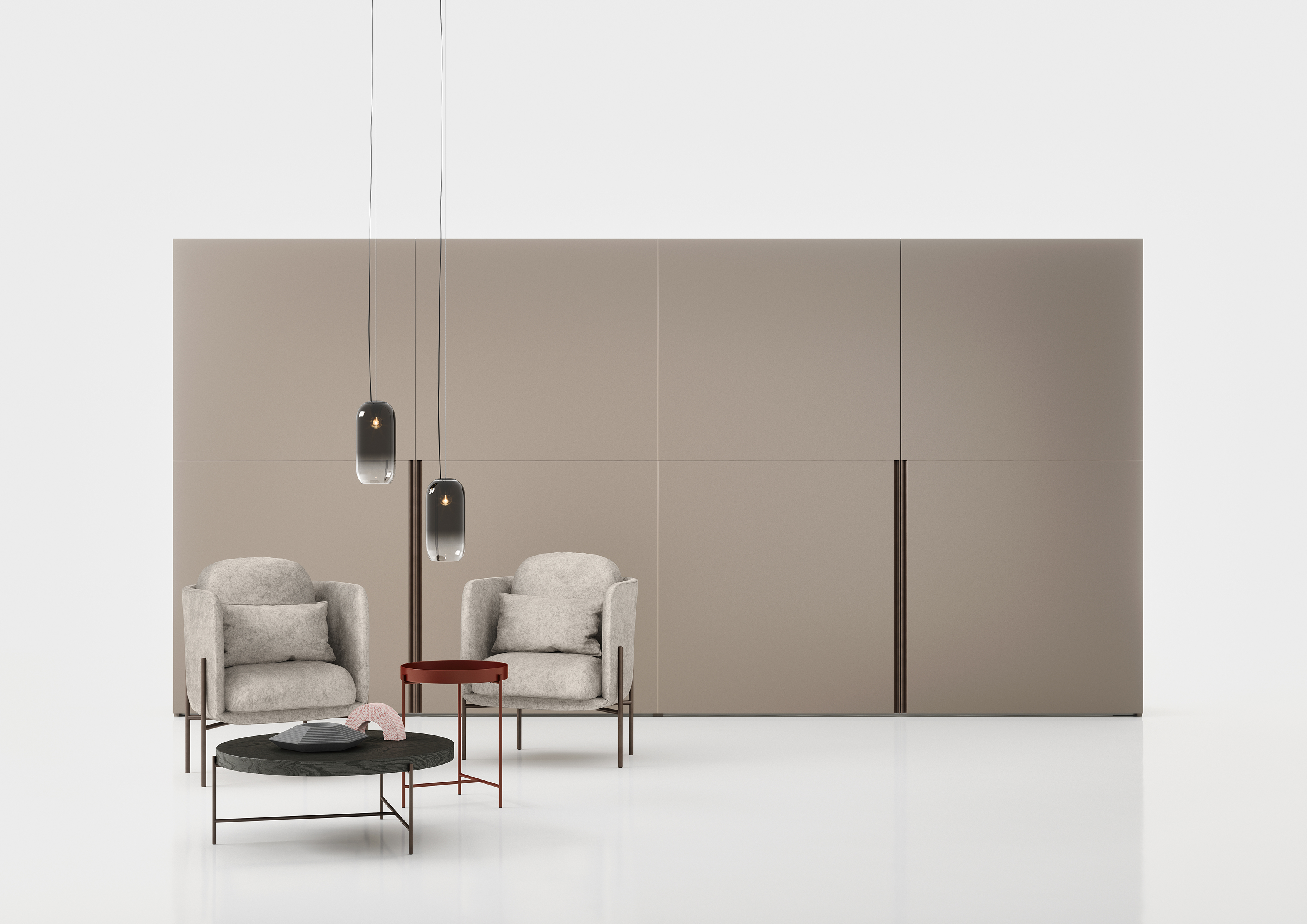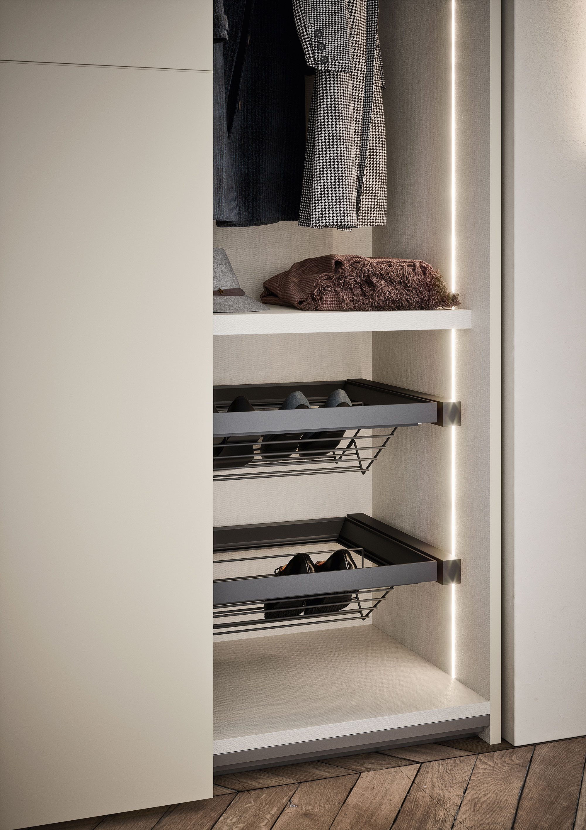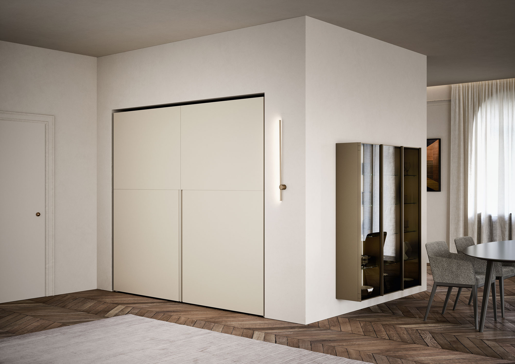 The Picture wardrobe features a symmetrical design highlighted by flush-closing sliding doors where the contrasting profile handle seamlessly integrates with the door itself.