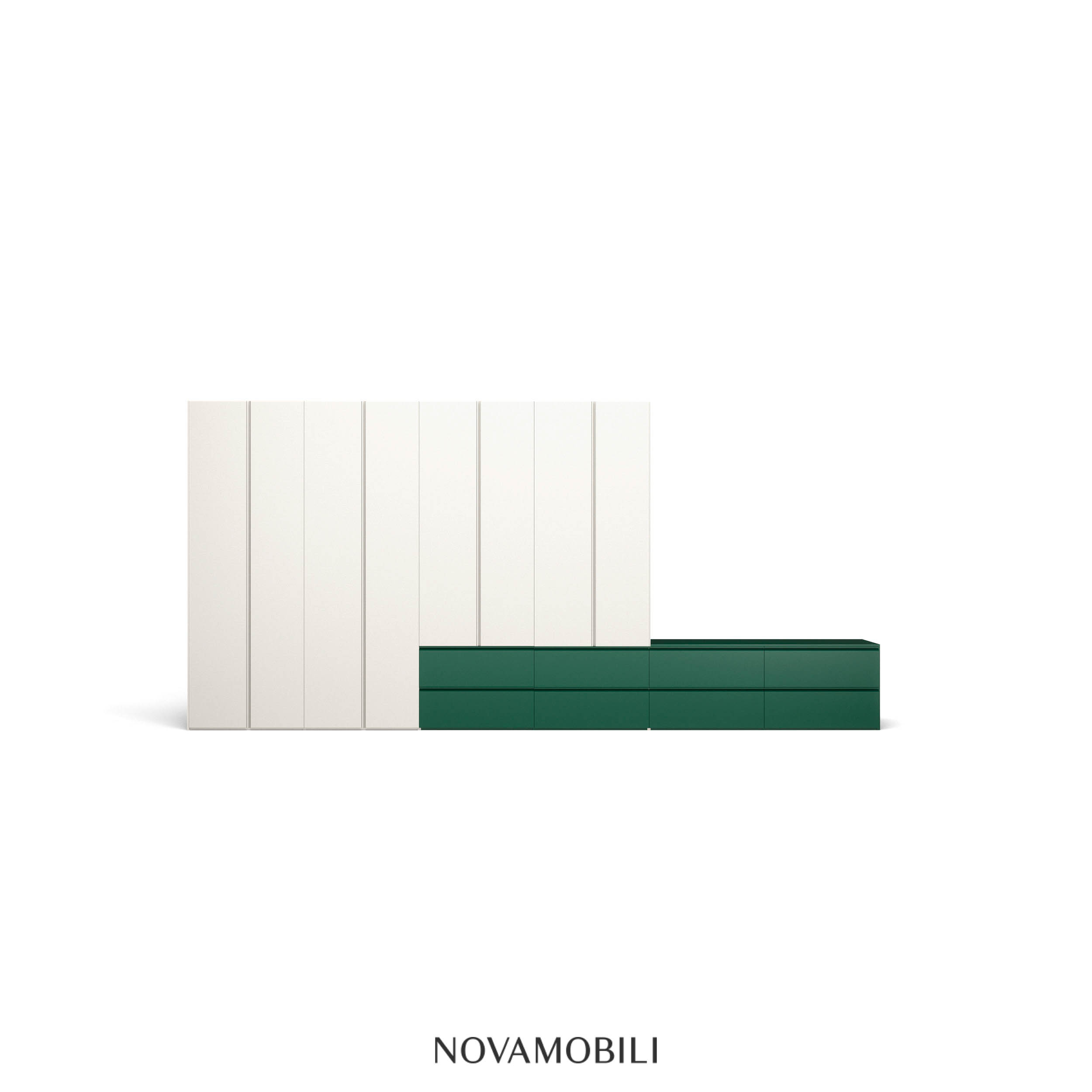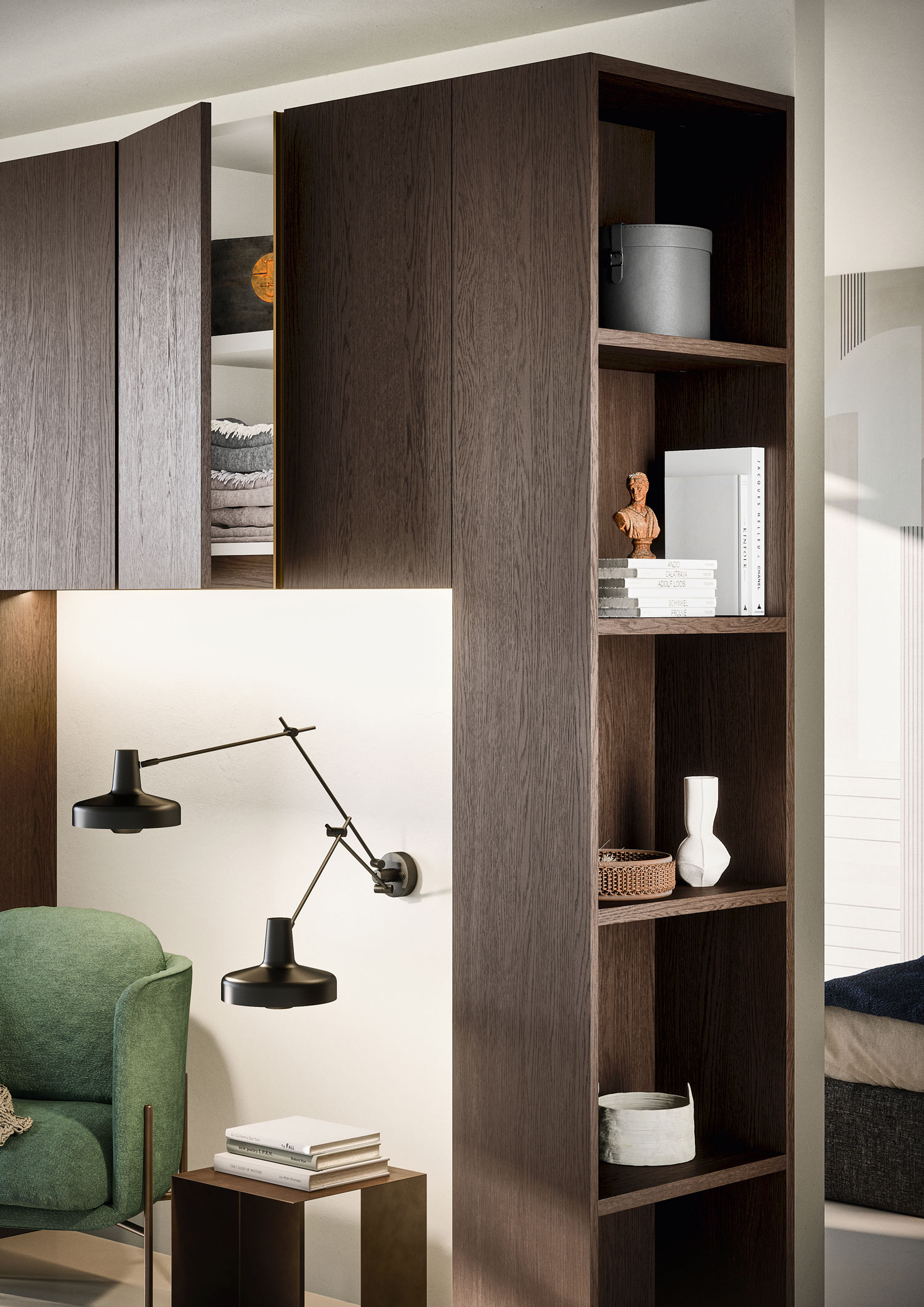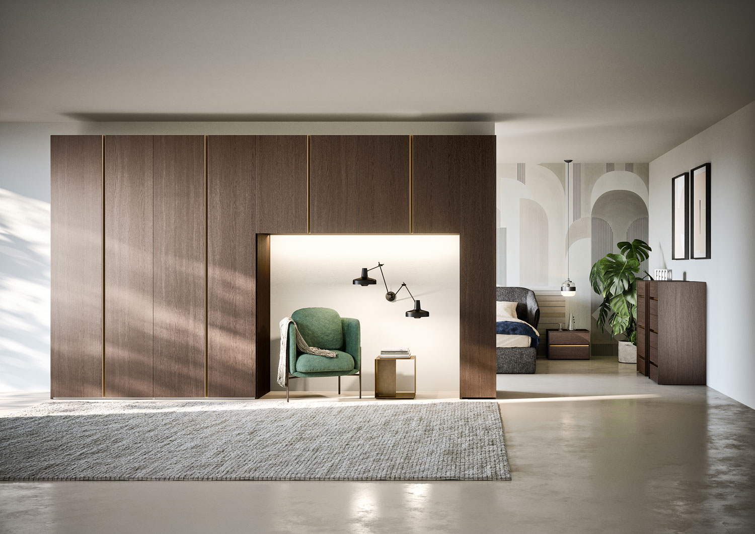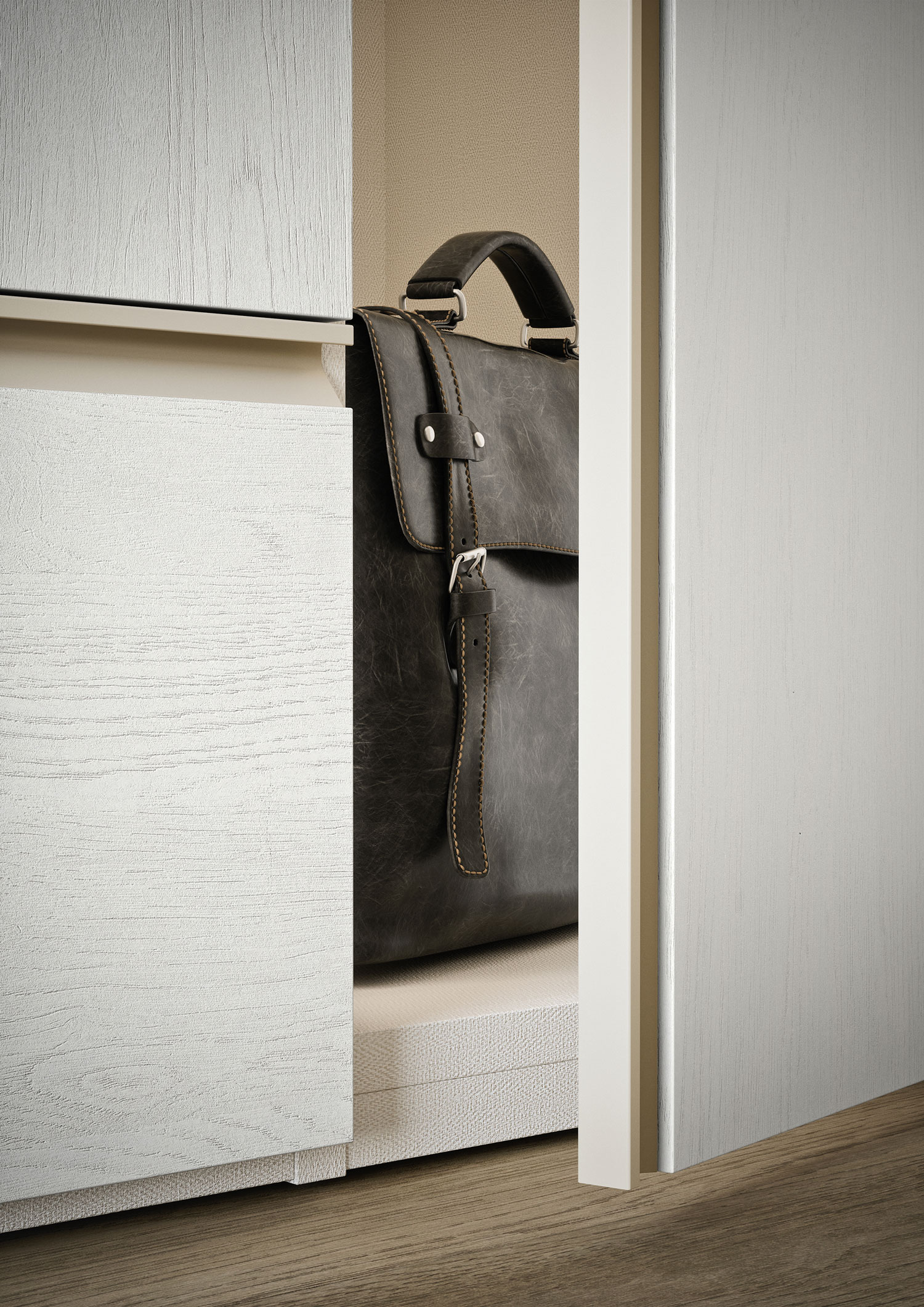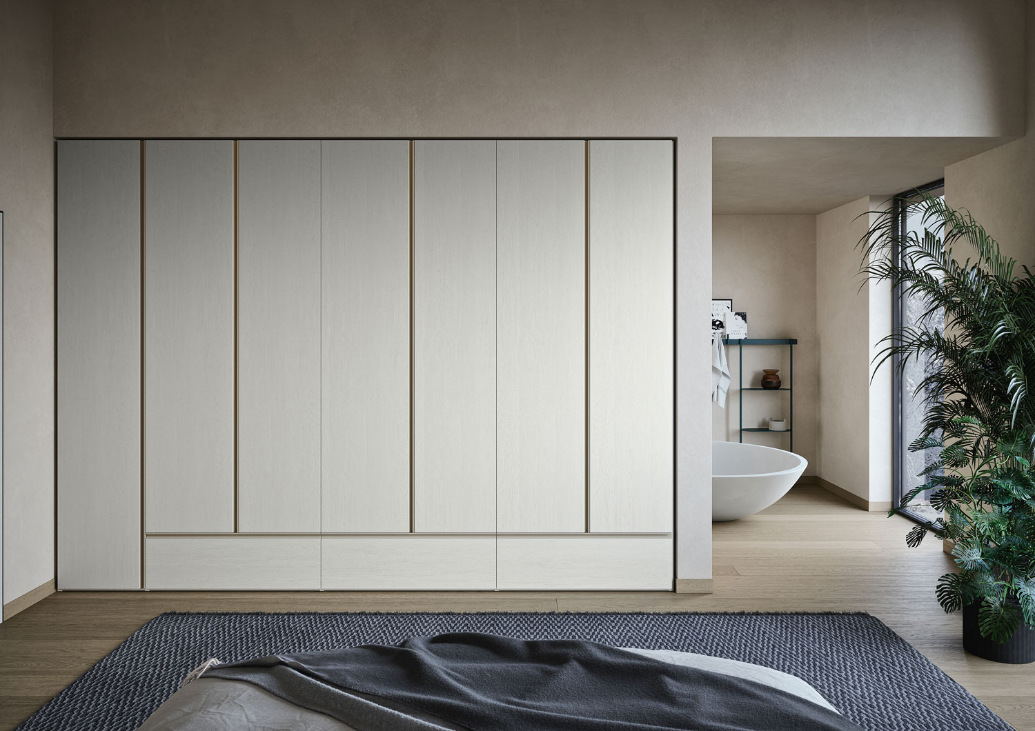 The Gola hinged door wardrobe comes in various widths, which gives the rhythm of the composition a certain variety. The profile handle built into the door can be positioned on the right or left. The Gola wardrobe can be recessed, set against a wall or fitted in a corner arrangement. The Gola Wardrobe comes in a variety of finishes: Matte Lacquered, Eco-wood, Decor, Super Matte, Textured, and Melamine.