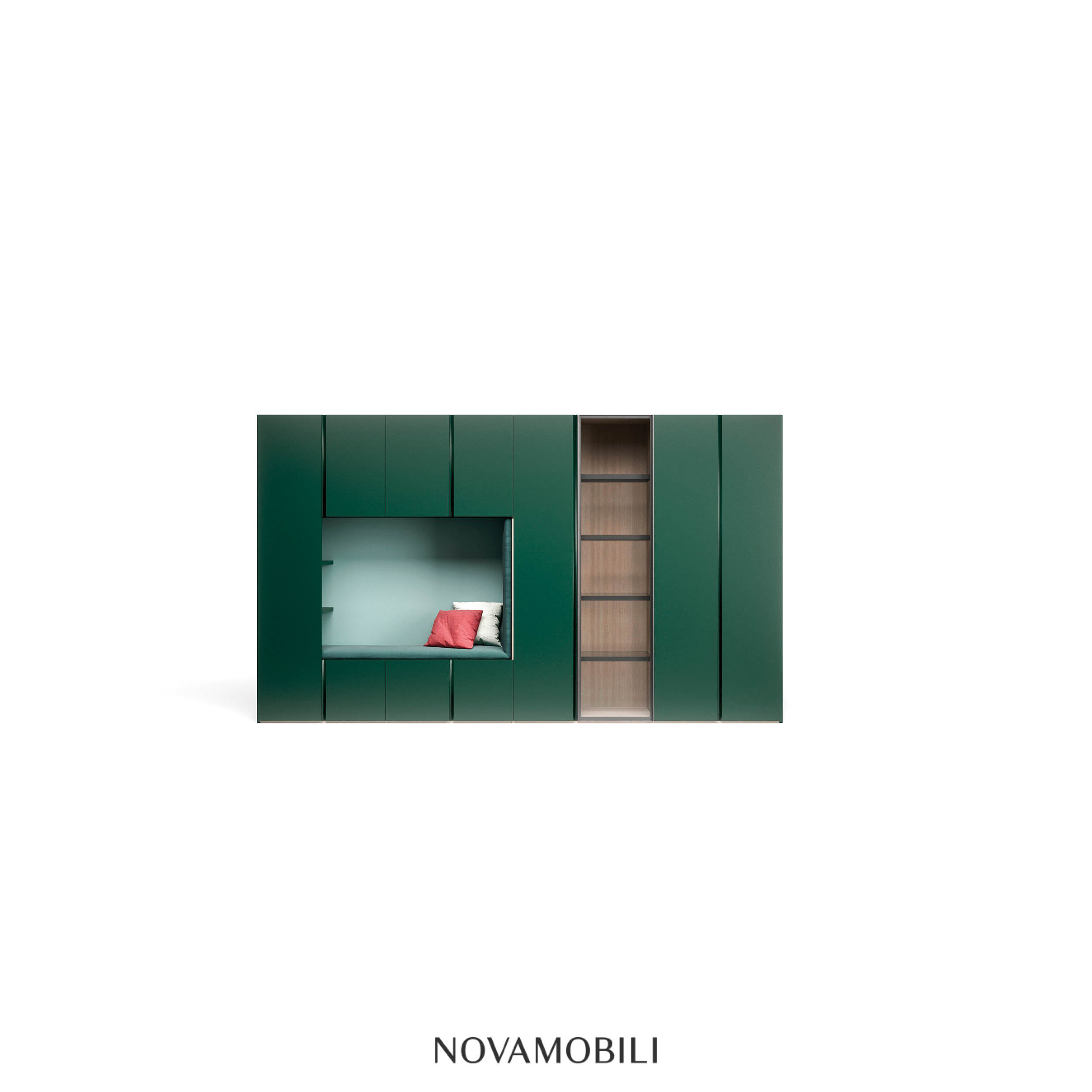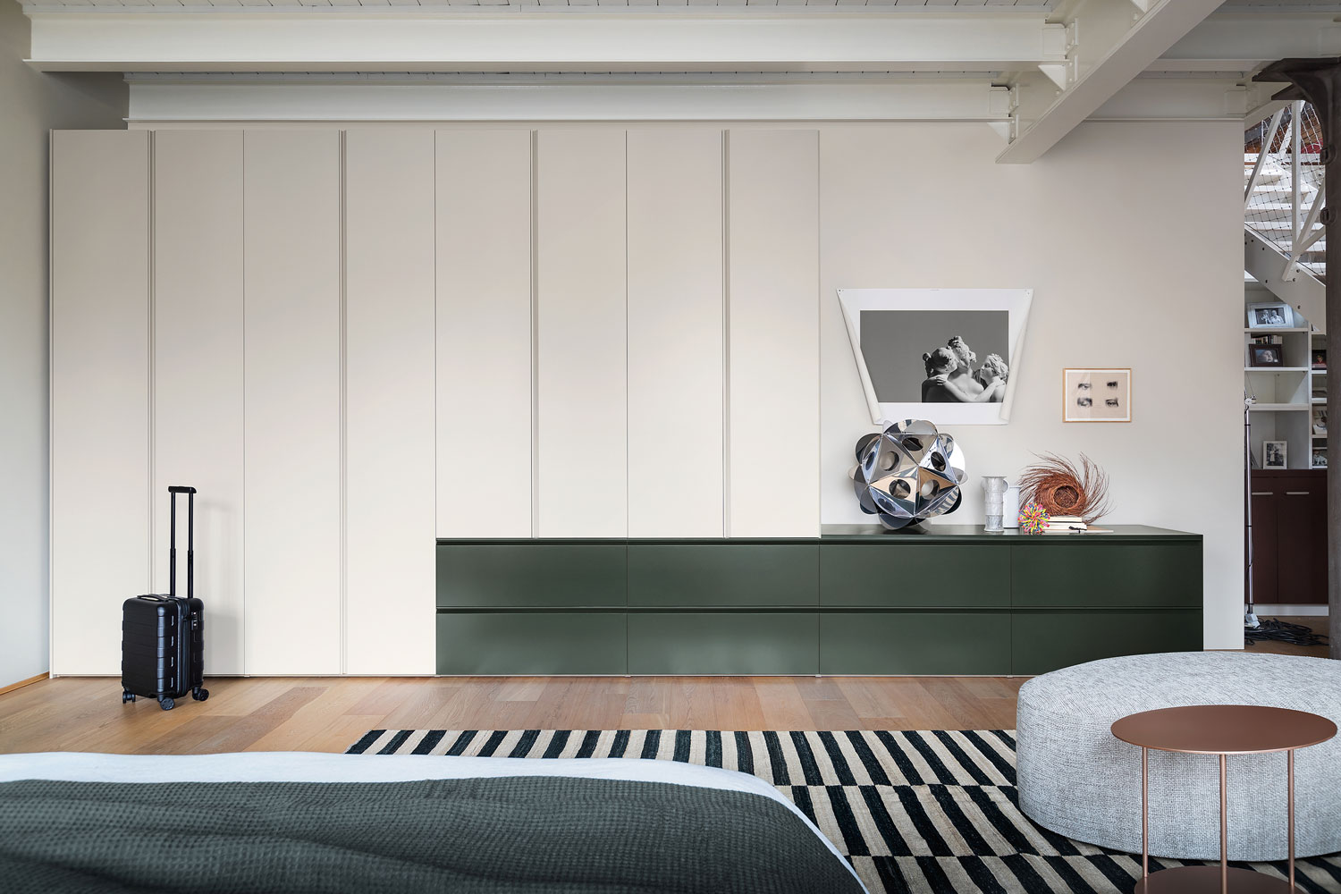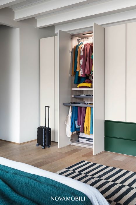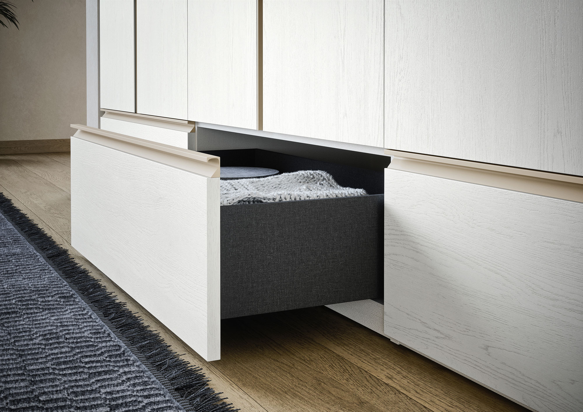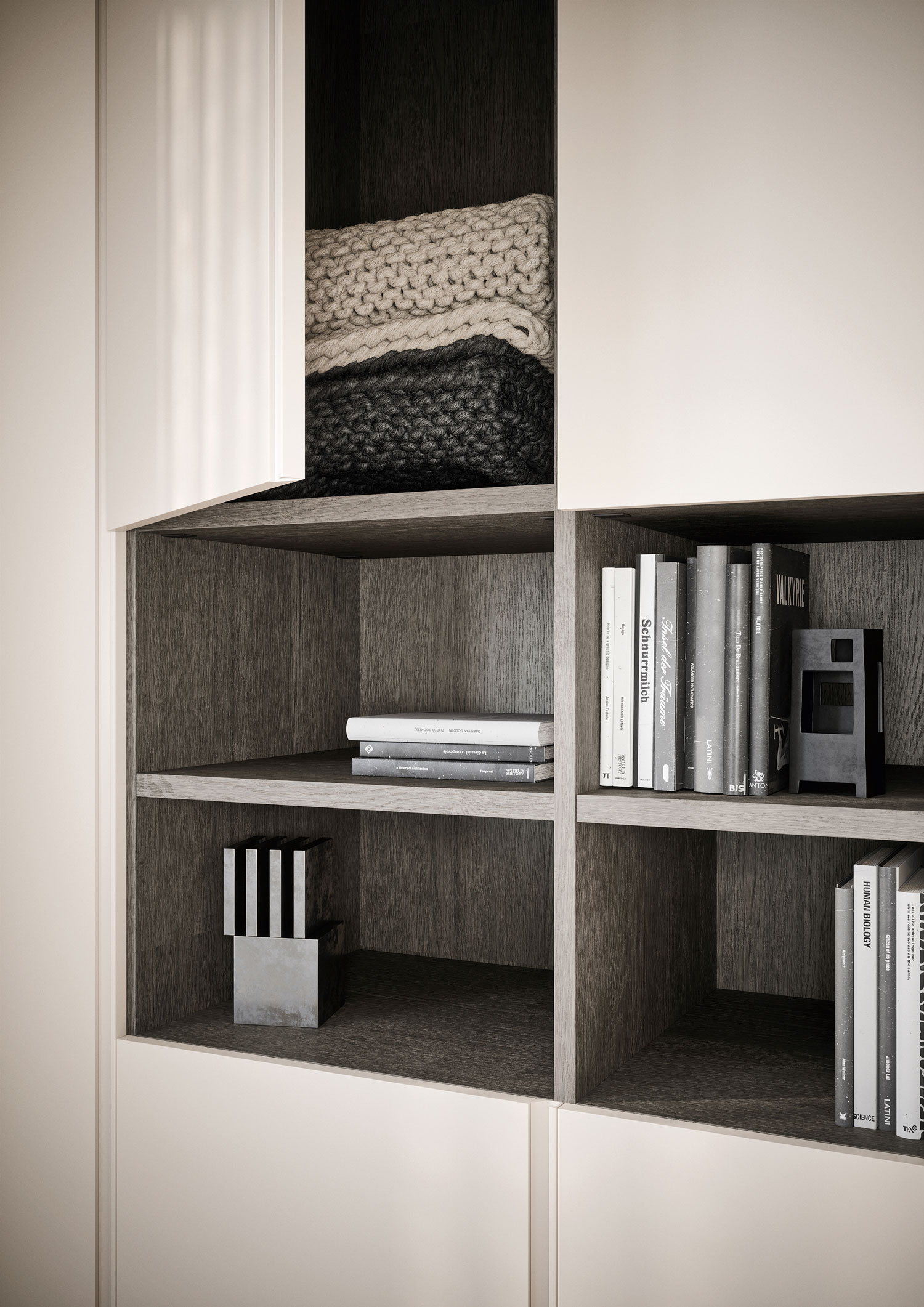 The Gola hinged door wardrobe comes in various widths, which gives the rhythm of the composition a certain variety. The profile handle built into the door can be positioned on the right or left. The Gola wardrobe can be recessed, set against a wall or fitted in a corner arrangement. The Gola Wardrobe comes in a variety of finishes: Matte Lacquered, Eco-wood, Decor, Super Matte, Textured, and Melamine.