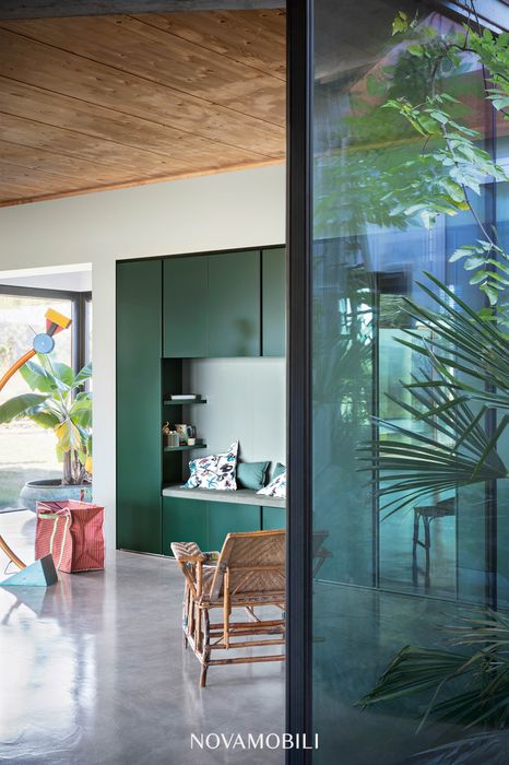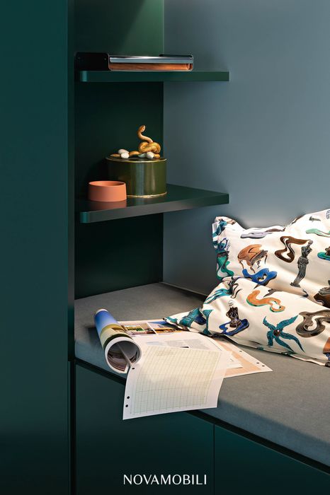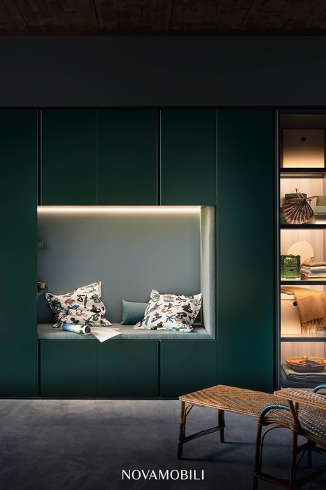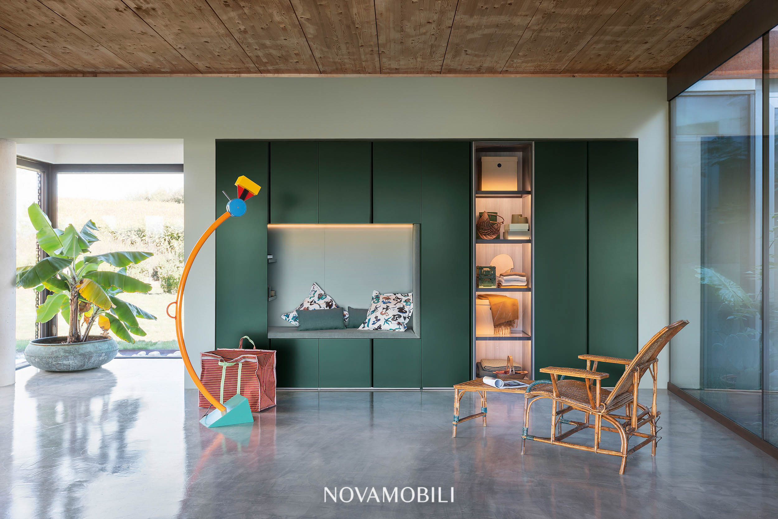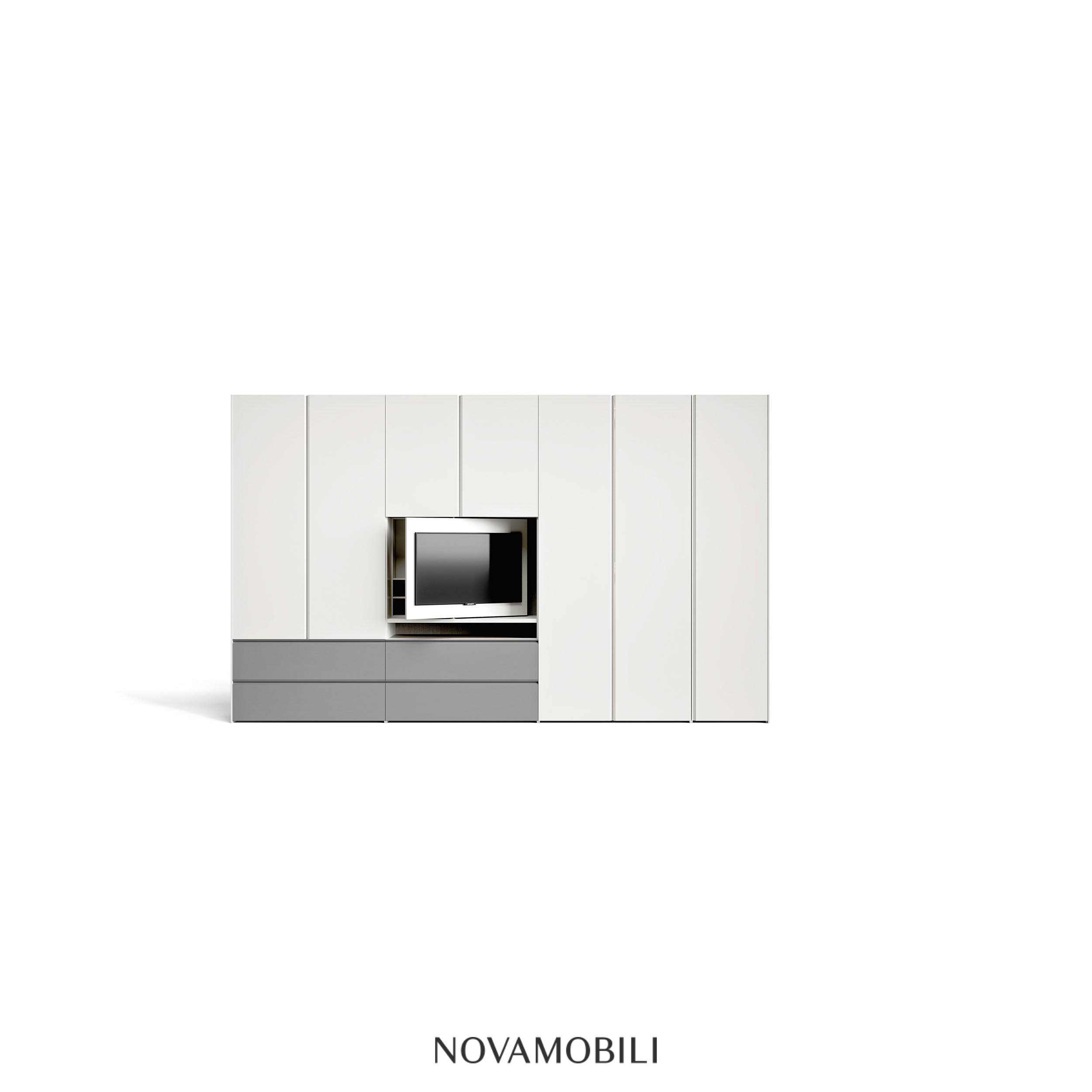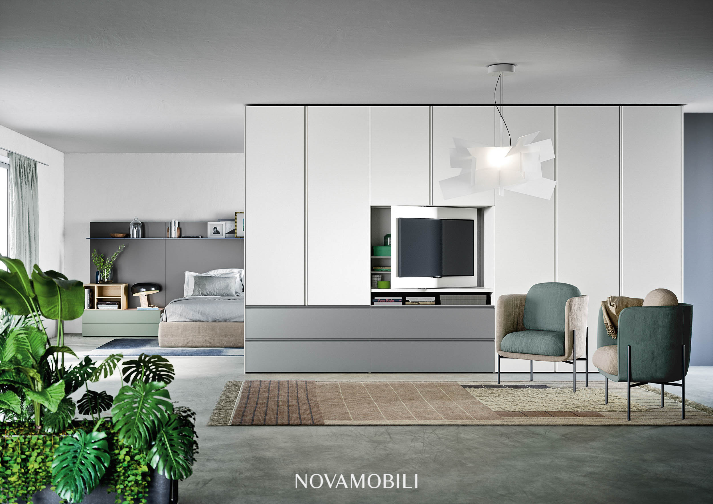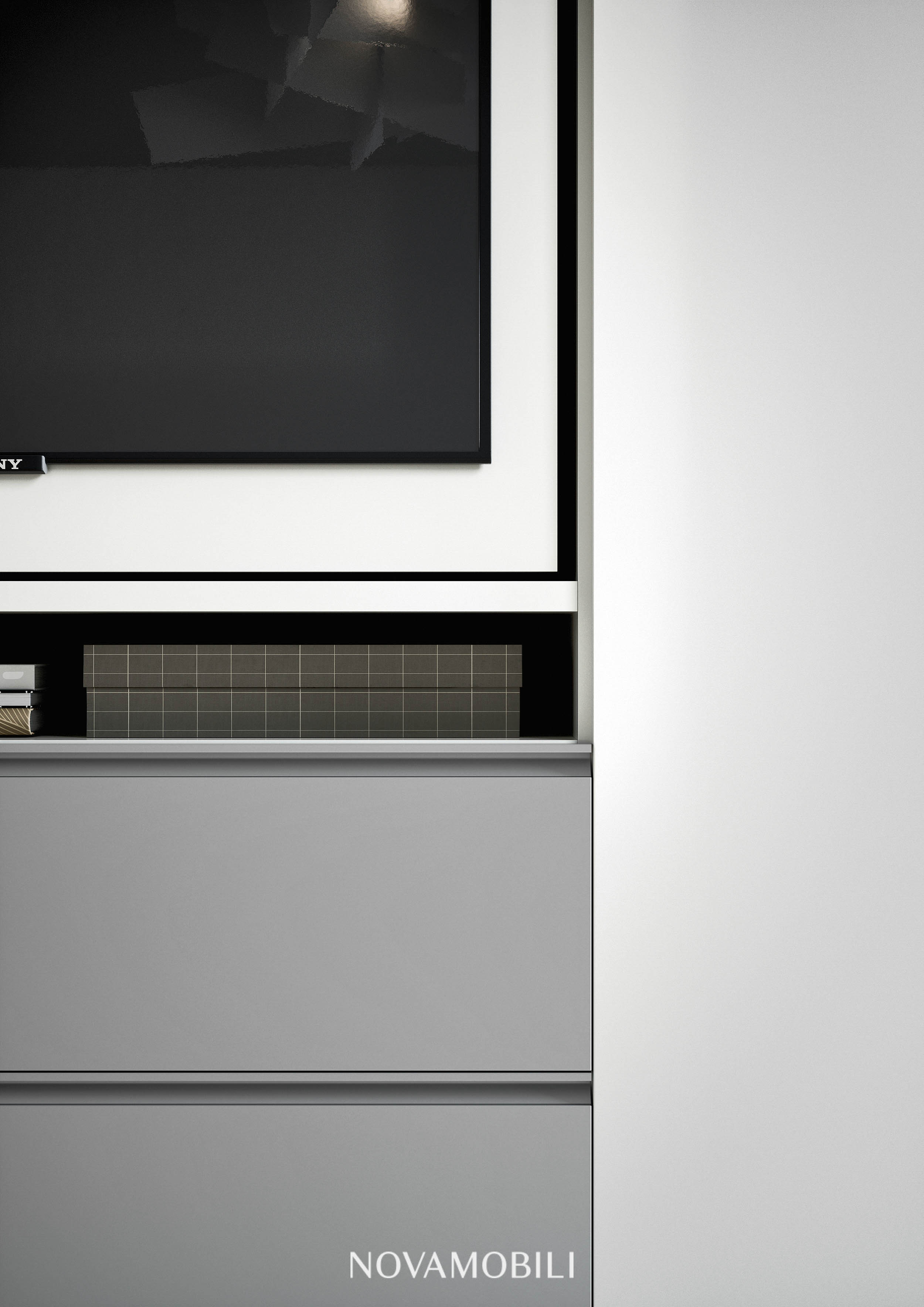 The Gola hinged door wardrobe comes in various widths, which gives the rhythm of the composition a certain variety. The profile handle built into the door can be positioned on the right or left. The Gola wardrobe can be recessed, set against a wall or fitted in a corner arrangement. The Gola Wardrobe comes in a variety of finishes: Matte Lacquered, Eco-wood, Decor, Super Matte, Textured, and Melamine.