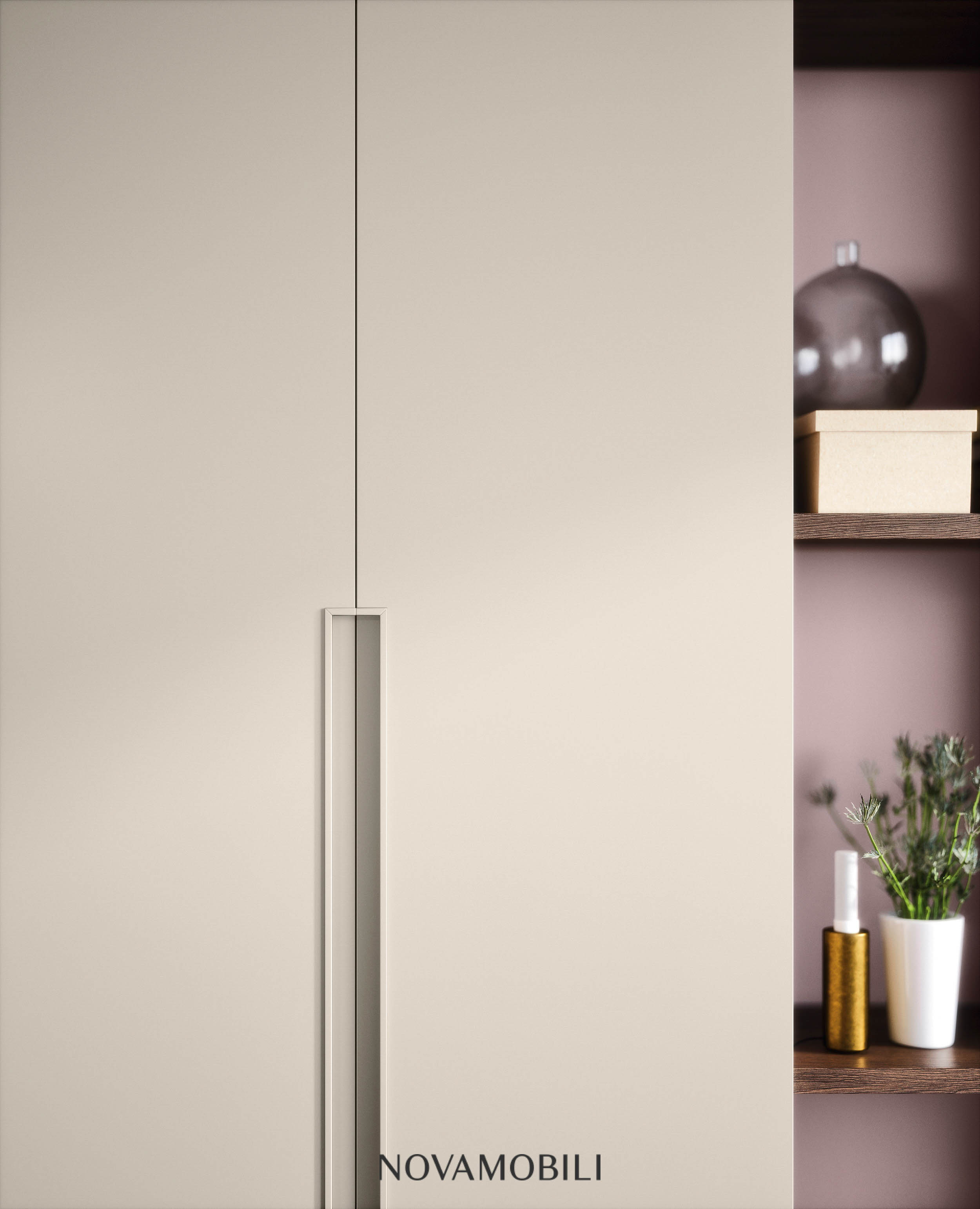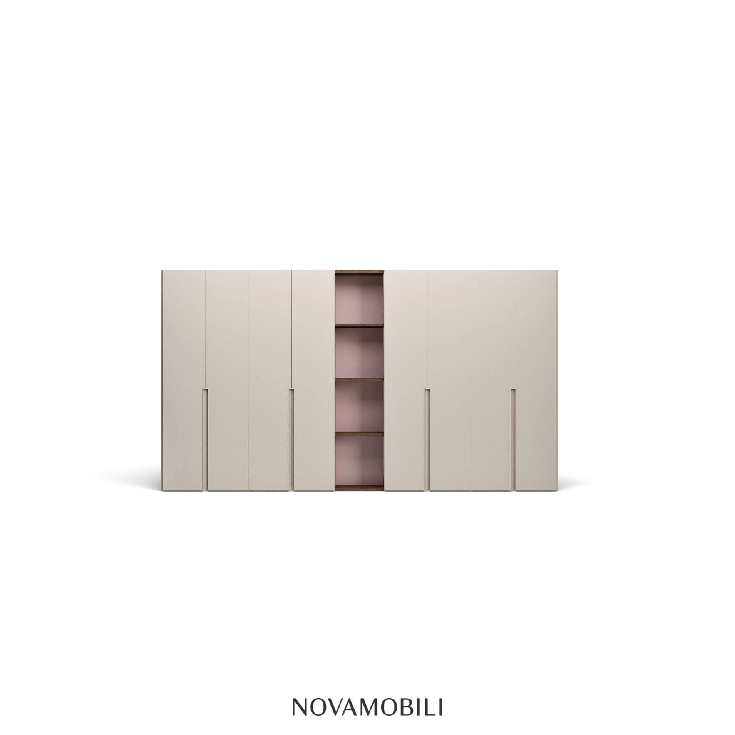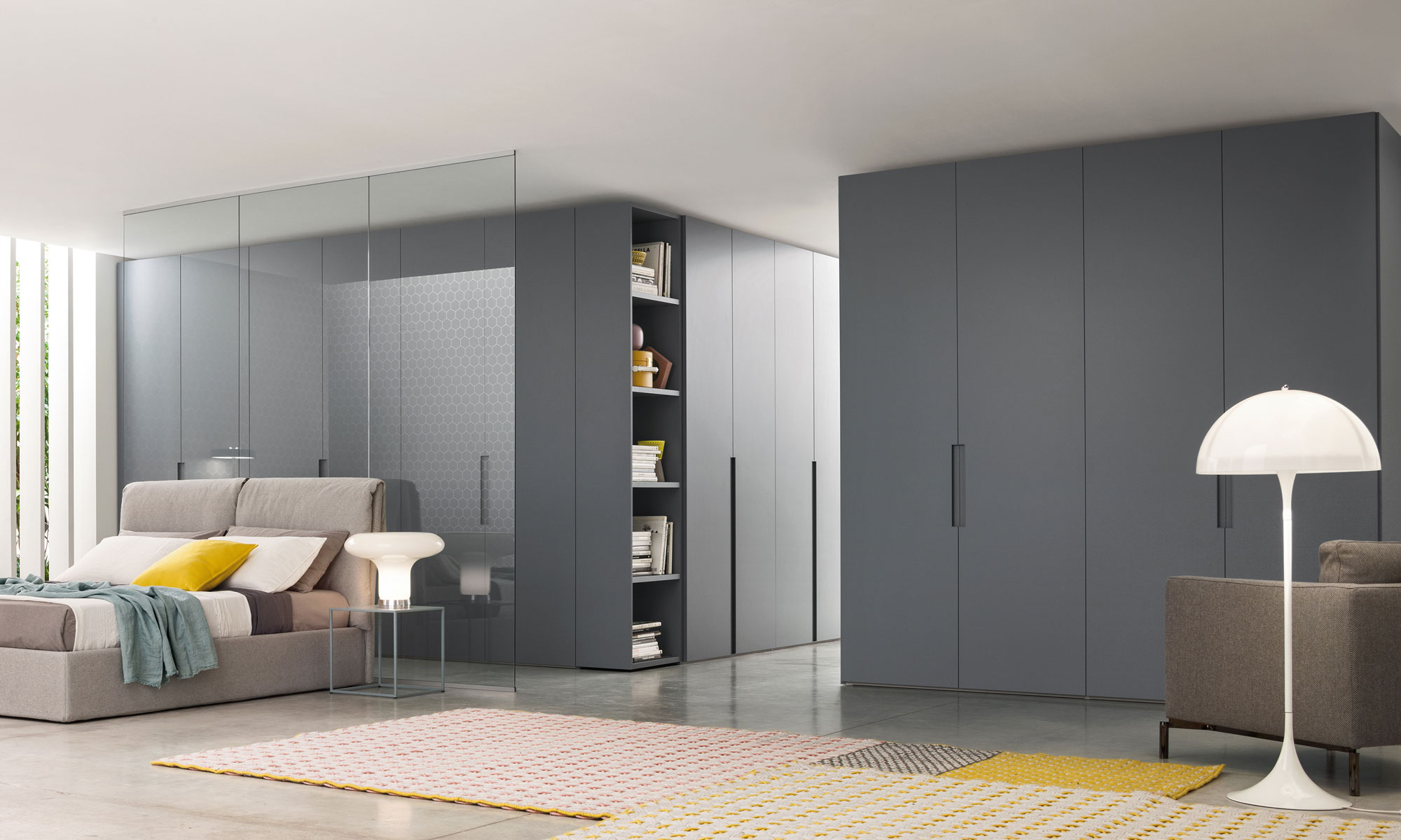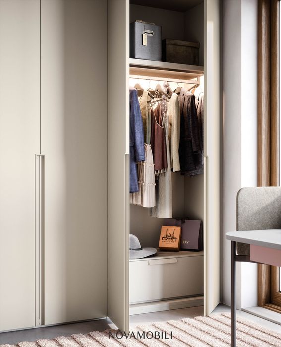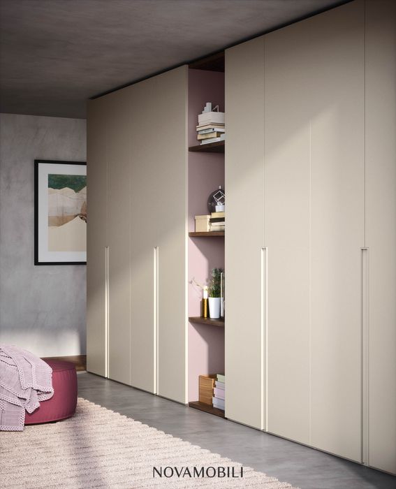 With its handle recessed into the side of the door, the Unika hinged door wardrobe stands out from the other hinged door models and injects personality for a distinctive look. Available in two sizes – running all the way to the floor or shorter – the handle can be customized in any of the matt lacquered colors, to match or contrast with the door. Suitable also for a corridor, it features a bookcase end unit and can be recessed or set against a wall.
