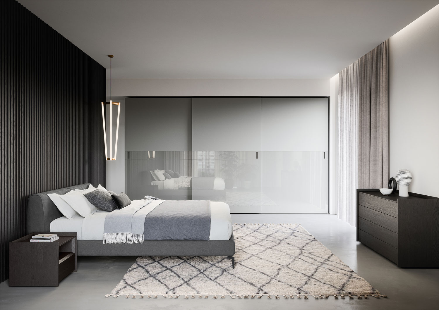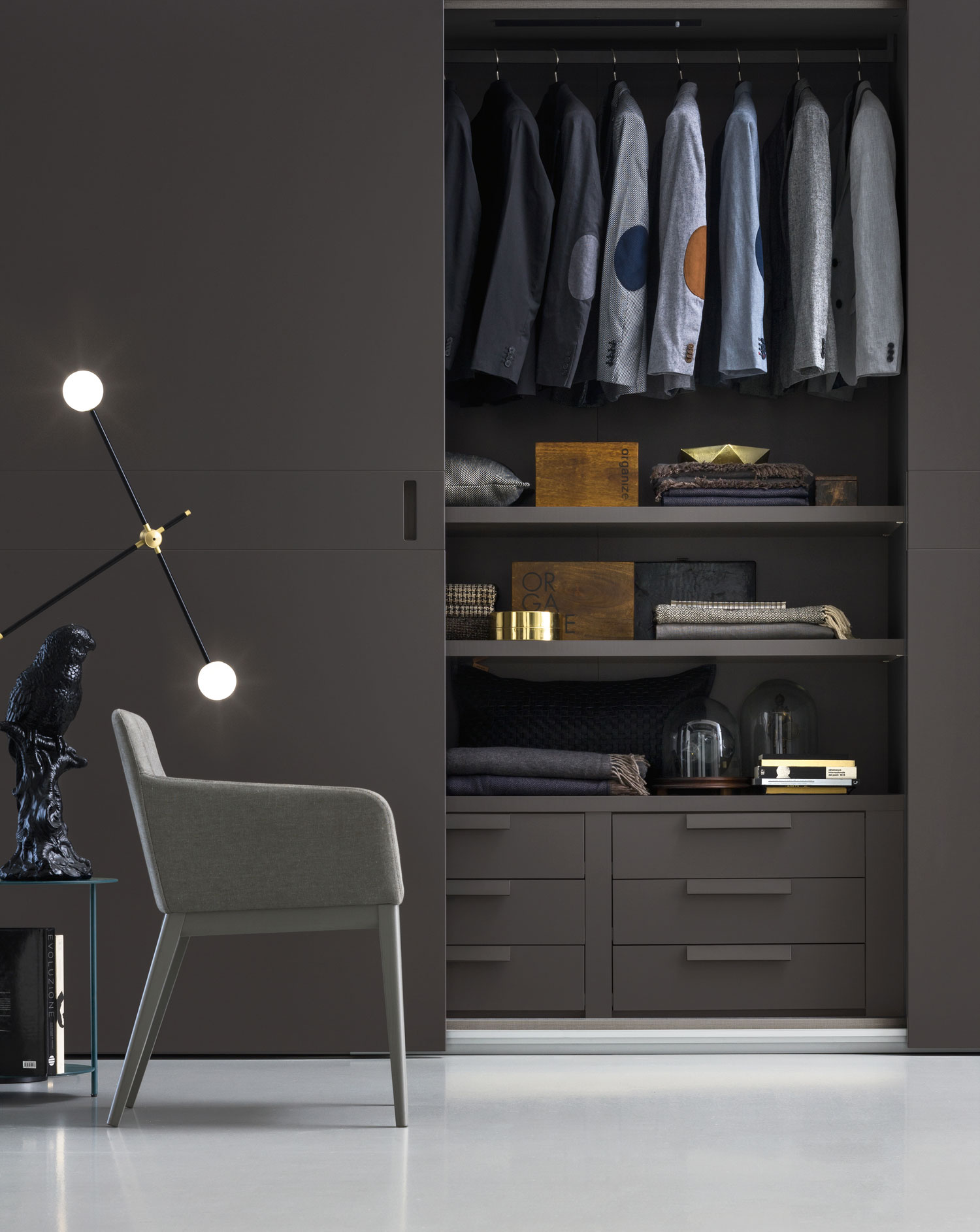 The refined, yet functional Class sliding door offers a practical solution for finishing off the wardrobe with sizeable moving surfaces, optimizing the available space. The door features a grip carved into the solid wood insert - a detail of an authentic handcrafted quality with a natural touch of added warmth.
