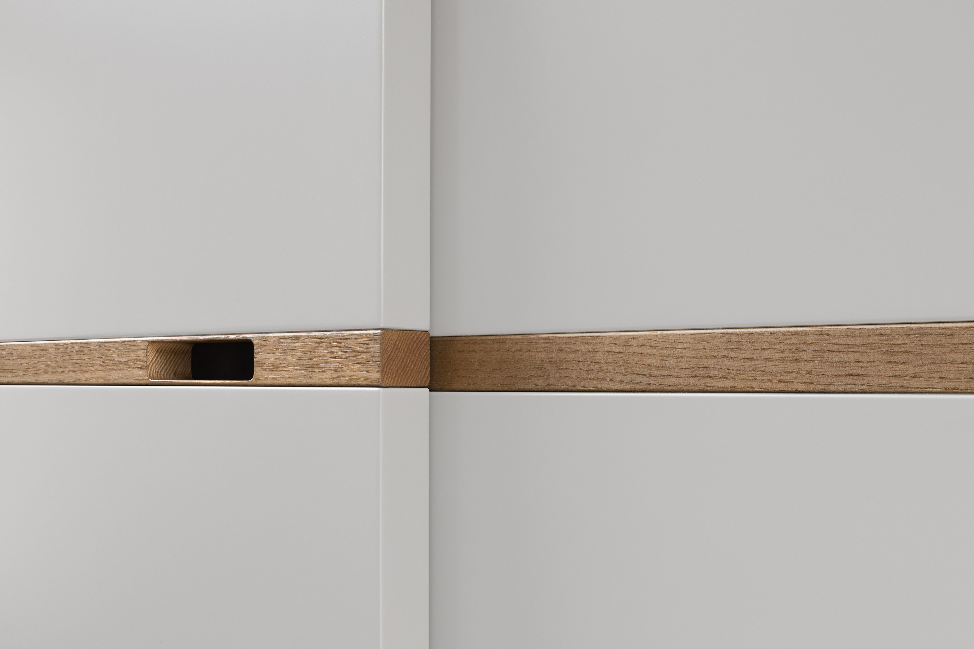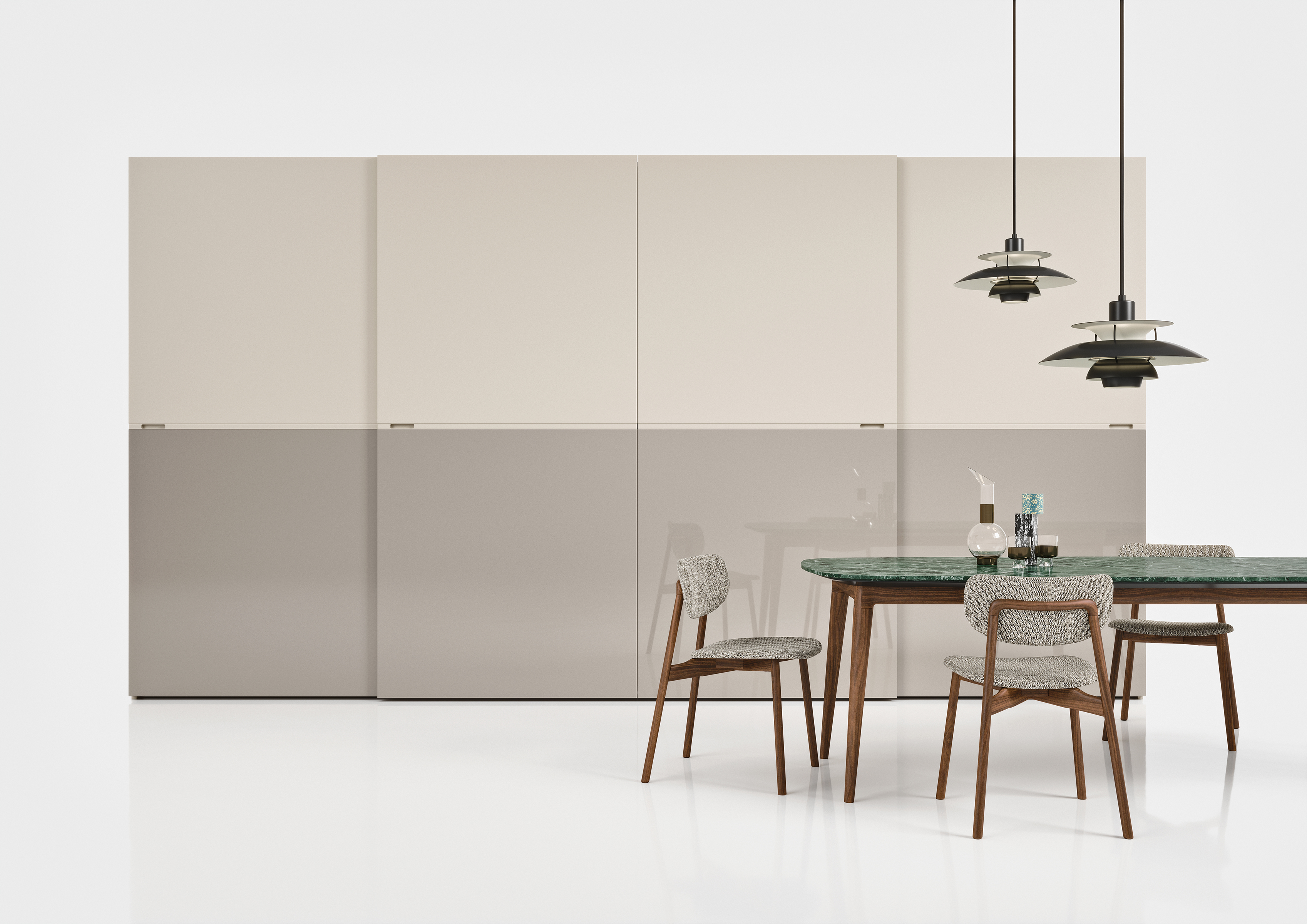 The Middle sliding door wardrobe features a distinctive central wood insert with integrated handle. The door configuration allows you to customize the wardrobe to the fullest: the panel is available in all matt and gloss lacquered colors, while the central insert is also available in veneered finishes. The wardrobe can be recessed, set against a wall, or fitted in a corner arrangement.