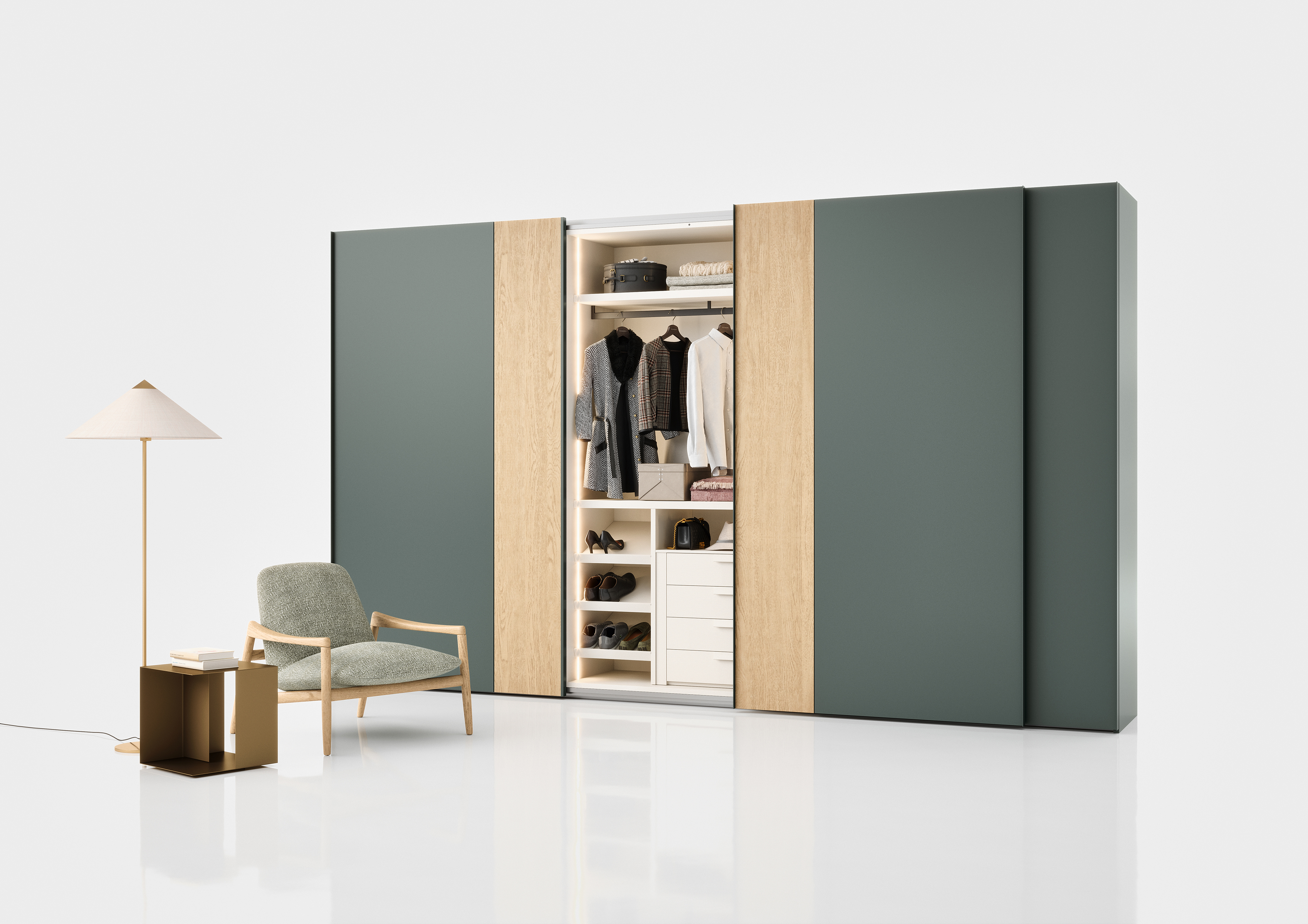 Contemporary Offset is a fresh and versatile sliding door wardrobe. Its panels and inserts can be customized in all matt lacquered colors, and in melamine, eco-wood, décor, and super matt finishes. The insert comes in mirror and lacquered glass finishes while the frame is available in matt lacquered finishes and bronze finish or brushed steel.