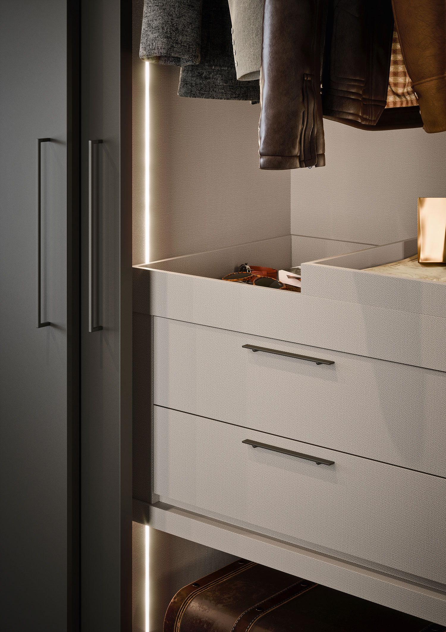The Thick sliding door wardrobe offers a sleek, modern design with 3cm-thick doors, combining practicality and style. Available in matt or oxidized lacquer finishes, customizable with various handles.