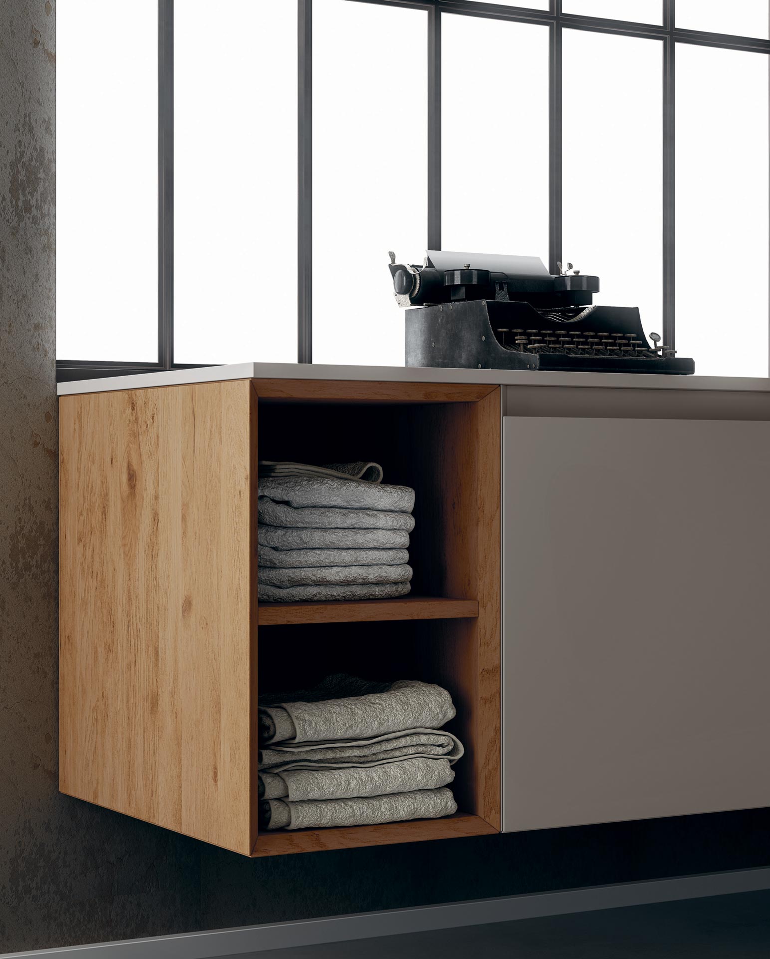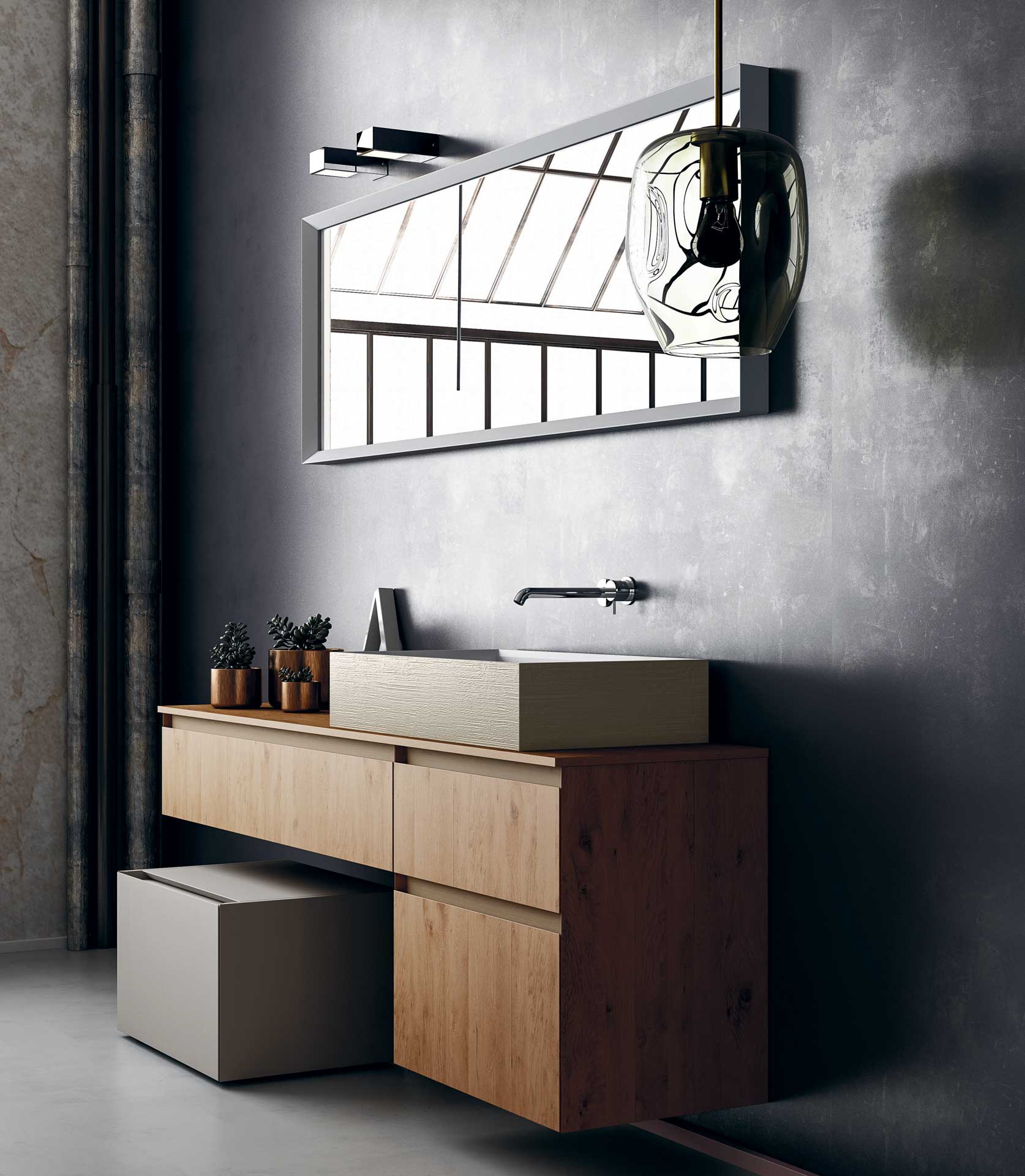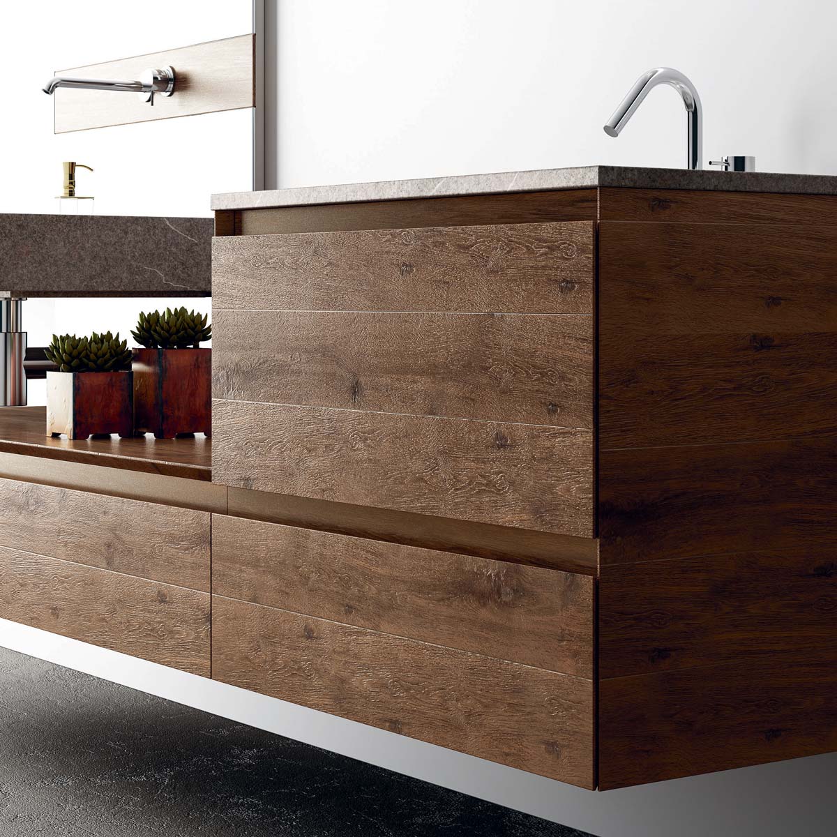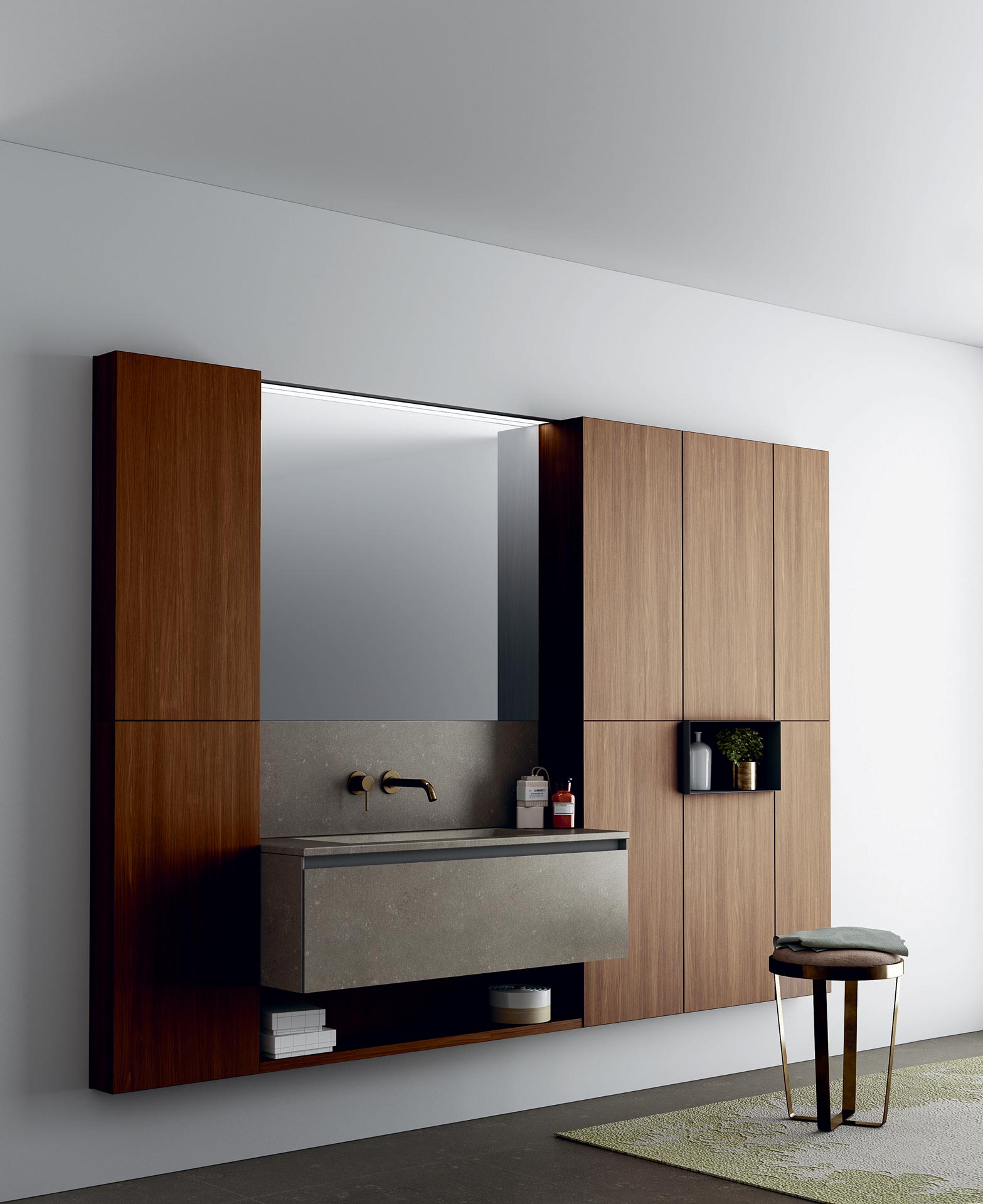 360 is a modular configuration system that’s offers a completely customisable bathroom solution. This very contemporary collection harmonises the balance of hand-planed laths of parquet and the contemporary style lines of the surfaces perfectly. Each cabinet becomes a piece of art through meticulous design, which makes every detail special. 360 Gradi modular system is extremely versatile in its materials; sand lacquers, glossy, woods or Kerlite®, Fenix NTM®, marbles, stones, metal, Koral, and varnished glass cladding and even slabs of parquet floor are used. The main feature of the Loft collection is the curved washbasin complimented by stylish hidden pull out storage spaces available in lacquered or wood finish. This bathroom collection ignites the feeling of living amongst a work of art.