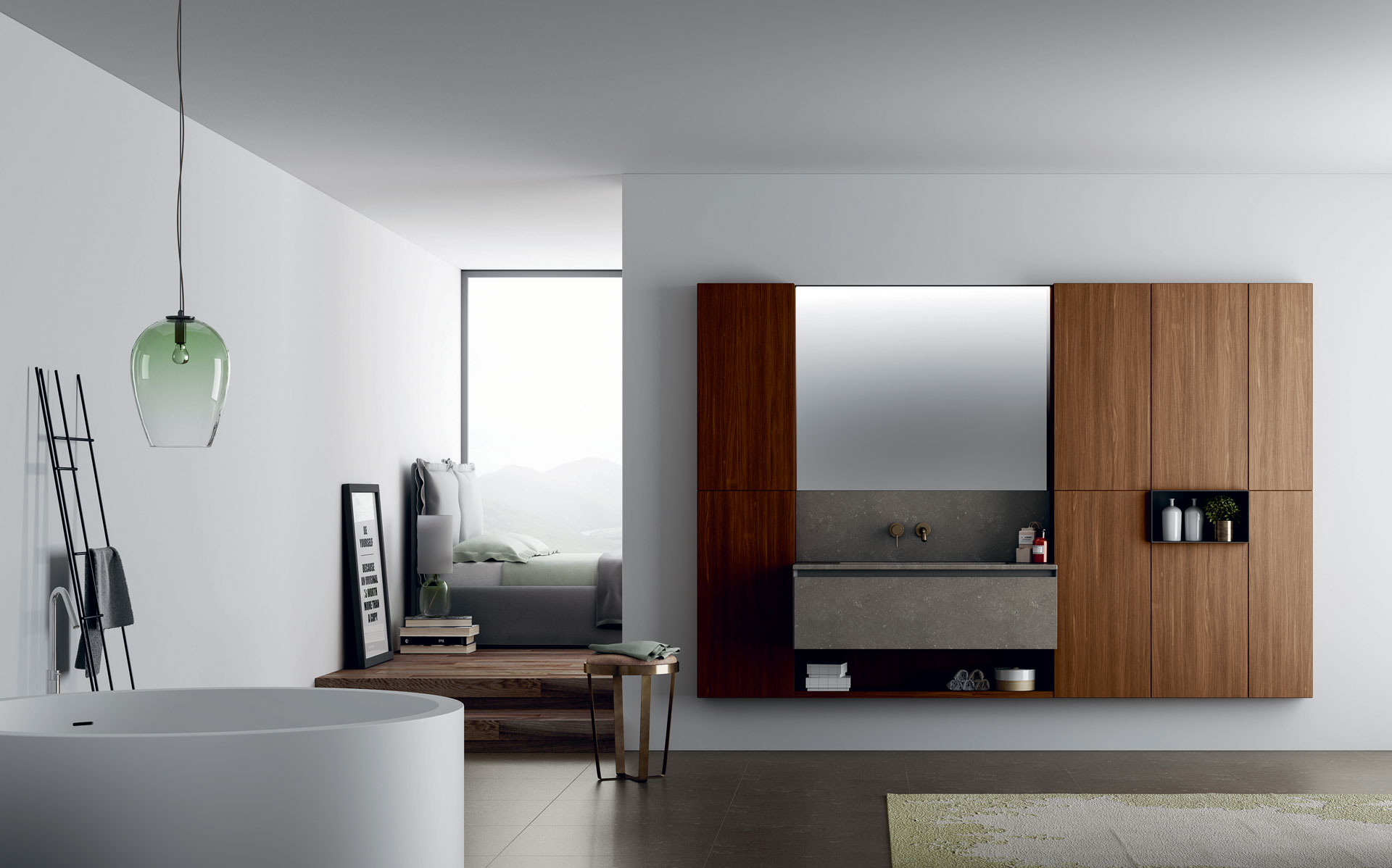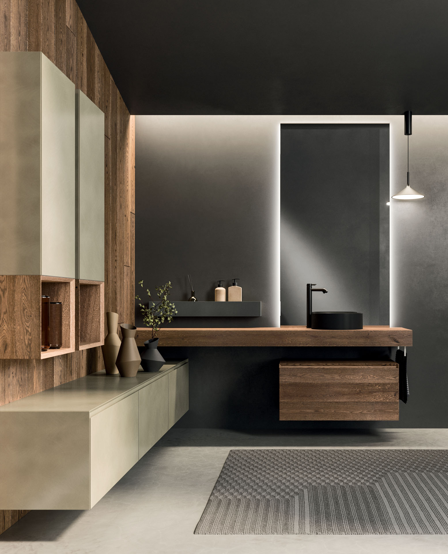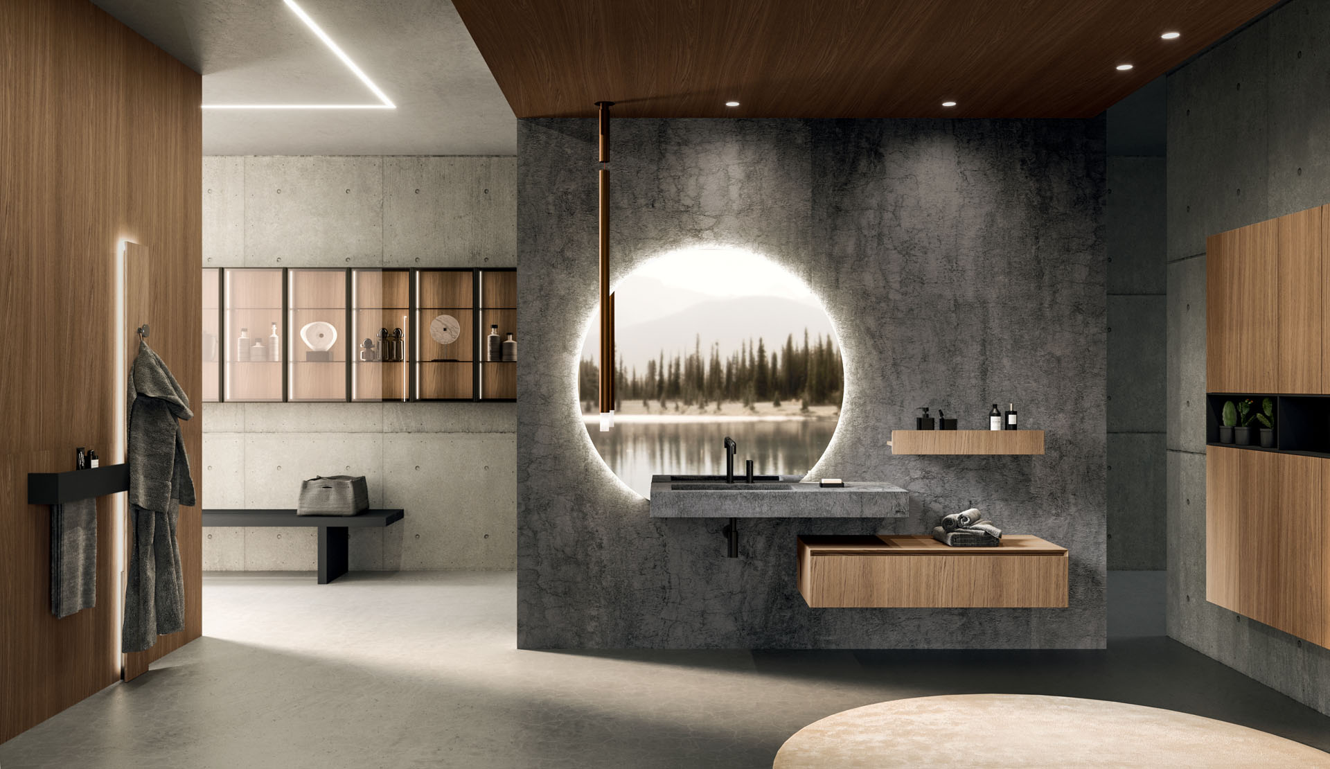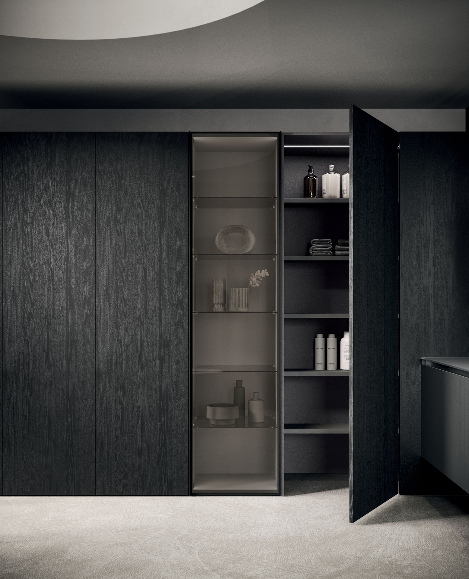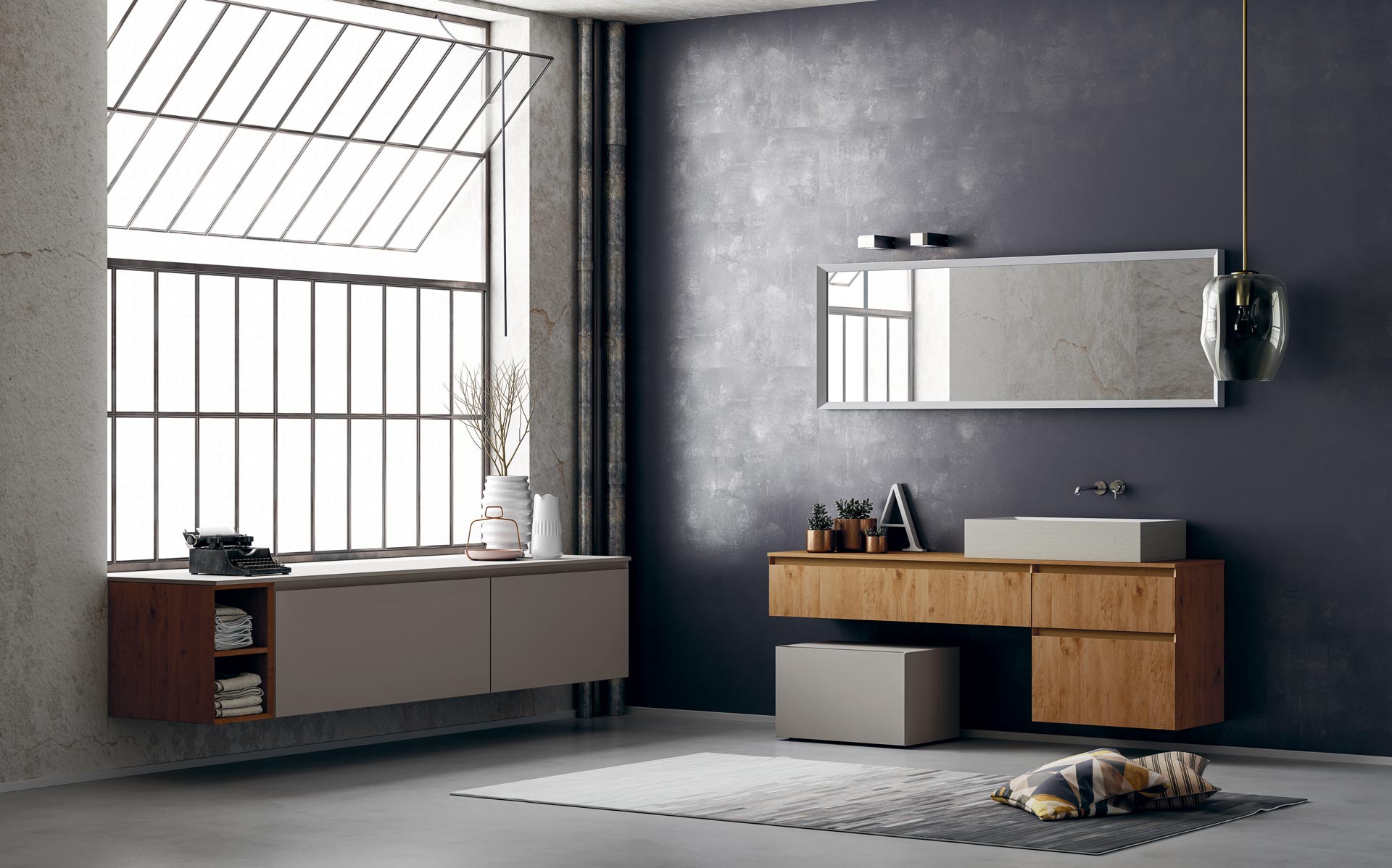 360 is a modular configuration system that’s offers a completely customisable bathroom solution. This very contemporary collection harmonises the balance of hand-planed laths of parquet and the contemporary style lines of the surfaces perfectly. Each cabinet becomes a piece of art through meticulous design, which makes every detail special. 360 Gradi modular system is extremely versatile in its materials; sand lacquers, glossy, woods or Kerlite®, Fenix NTM®, marbles, stones, metal, Koral, and varnished glass cladding and even slabs of parquet floor are used. The main feature of the Loft collection is the curved washbasin complimented by stylish hidden pull out storage spaces available in lacquered or wood finish. This bathroom collection ignites the feeling of living amongst a work of art.