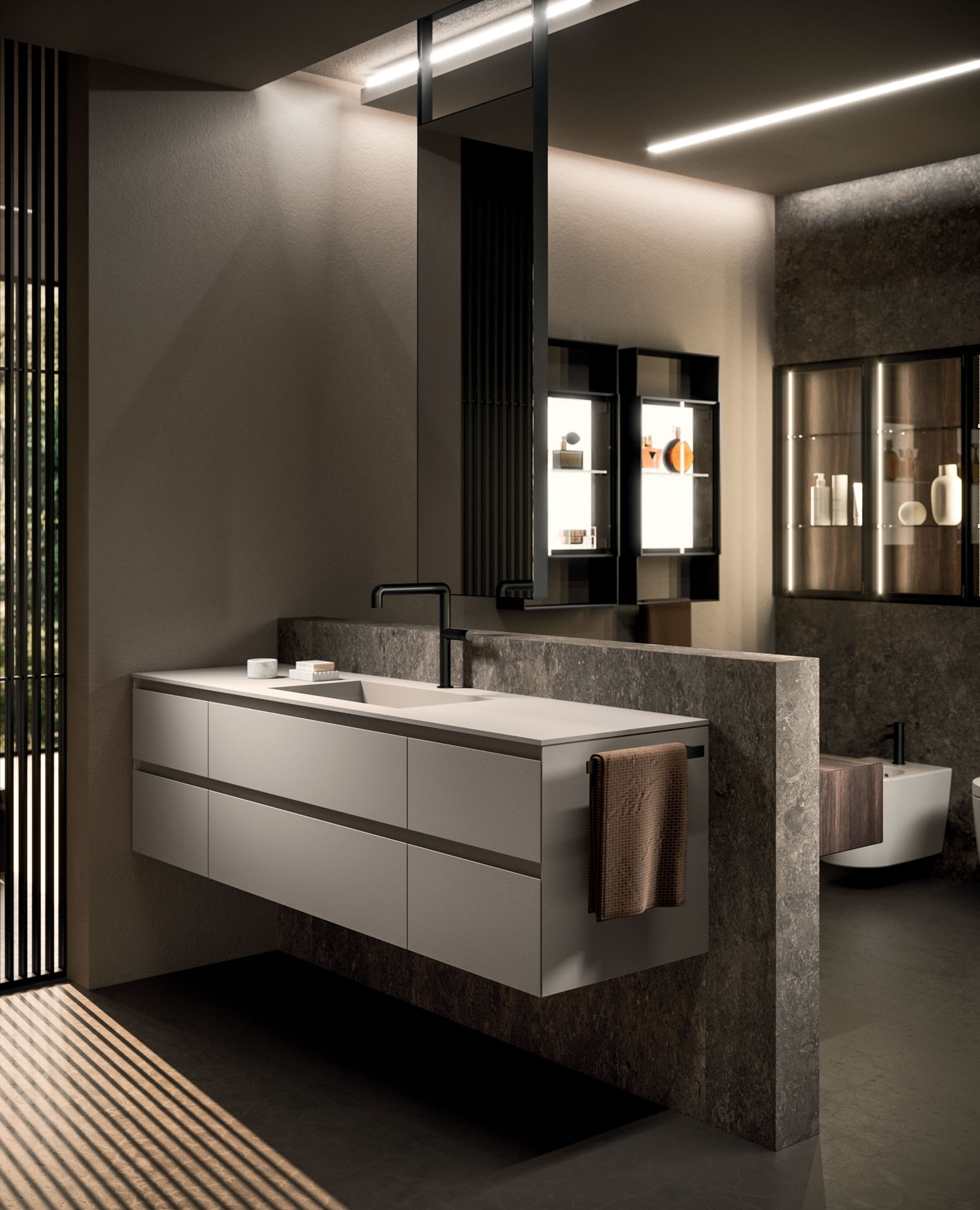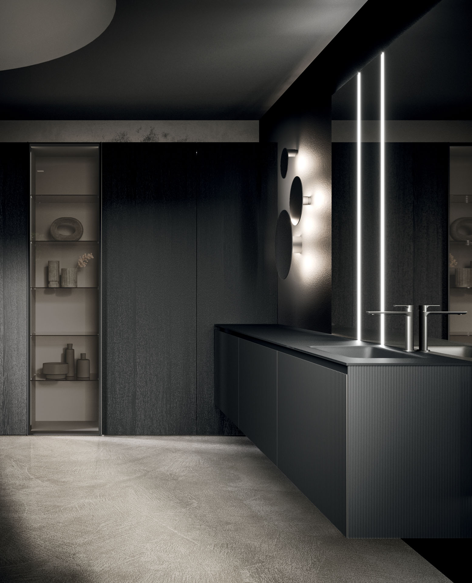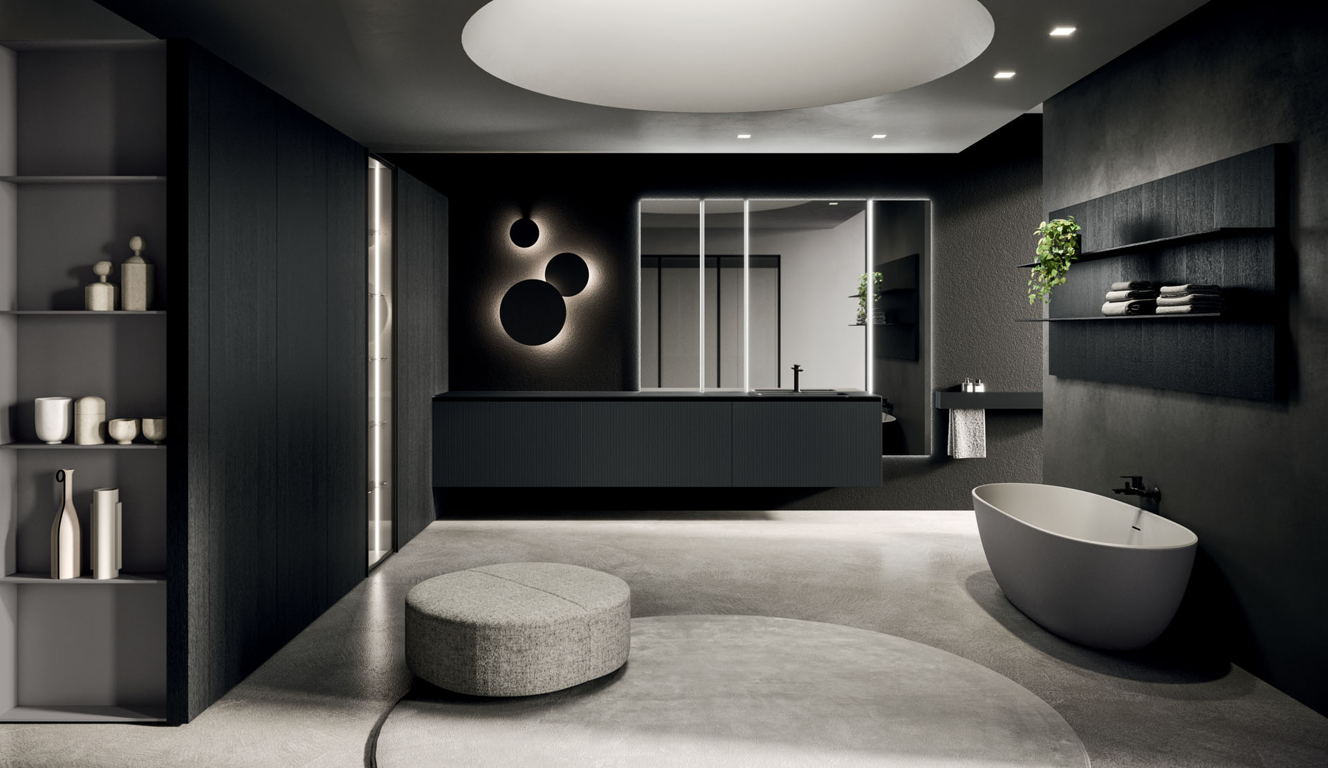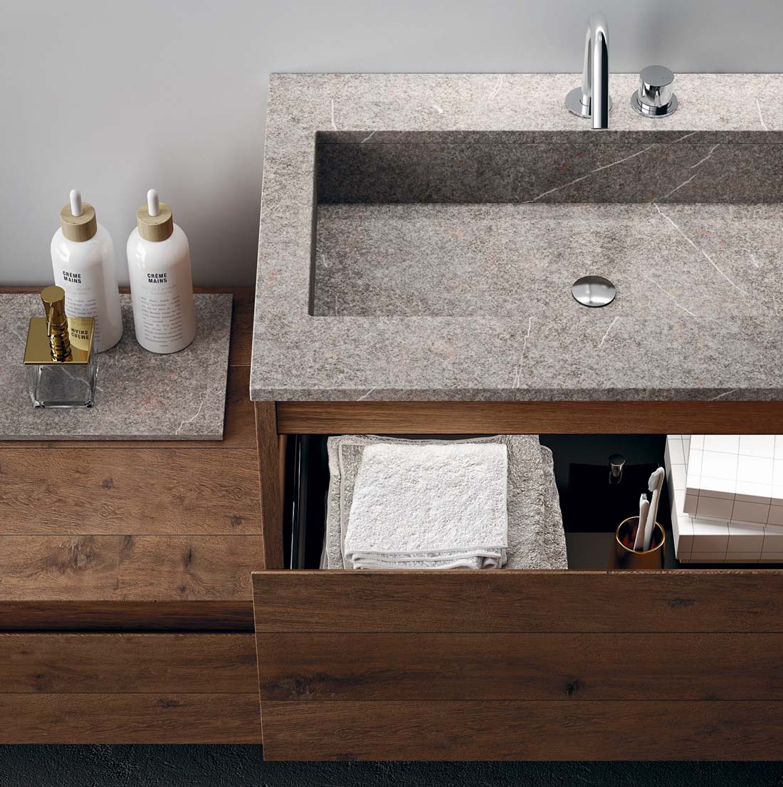 360 is a modular configuration system that’s offers a completely customisable bathroom solution. This very contemporary collection harmonises the balance of hand-planed laths of parquet and the contemporary style lines of the surfaces perfectly. Each cabinet becomes a piece of art through meticulous design, which makes every detail special. 360 Gradi modular system is extremely versatile in its materials; sand lacquers, glossy, woods or Kerlite®, Fenix NTM®, marbles, stones, metal, Koral, and varnished glass cladding and even slabs of parquet floor are used. The main feature of the Loft collection is the curved washbasin complimented by stylish hidden pull out storage spaces available in lacquered or wood finish. This bathroom collection ignites the feeling of living amongst a work of art.