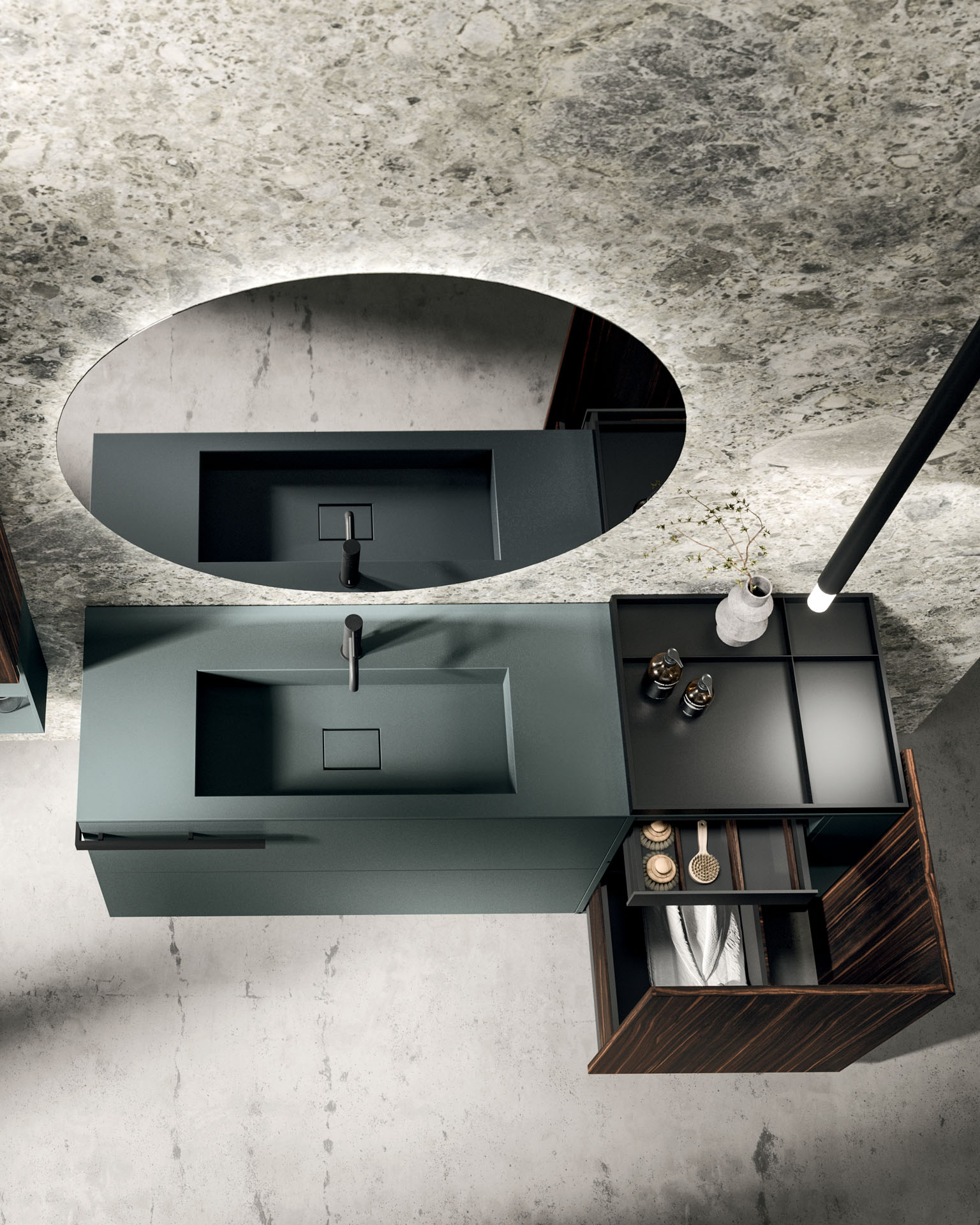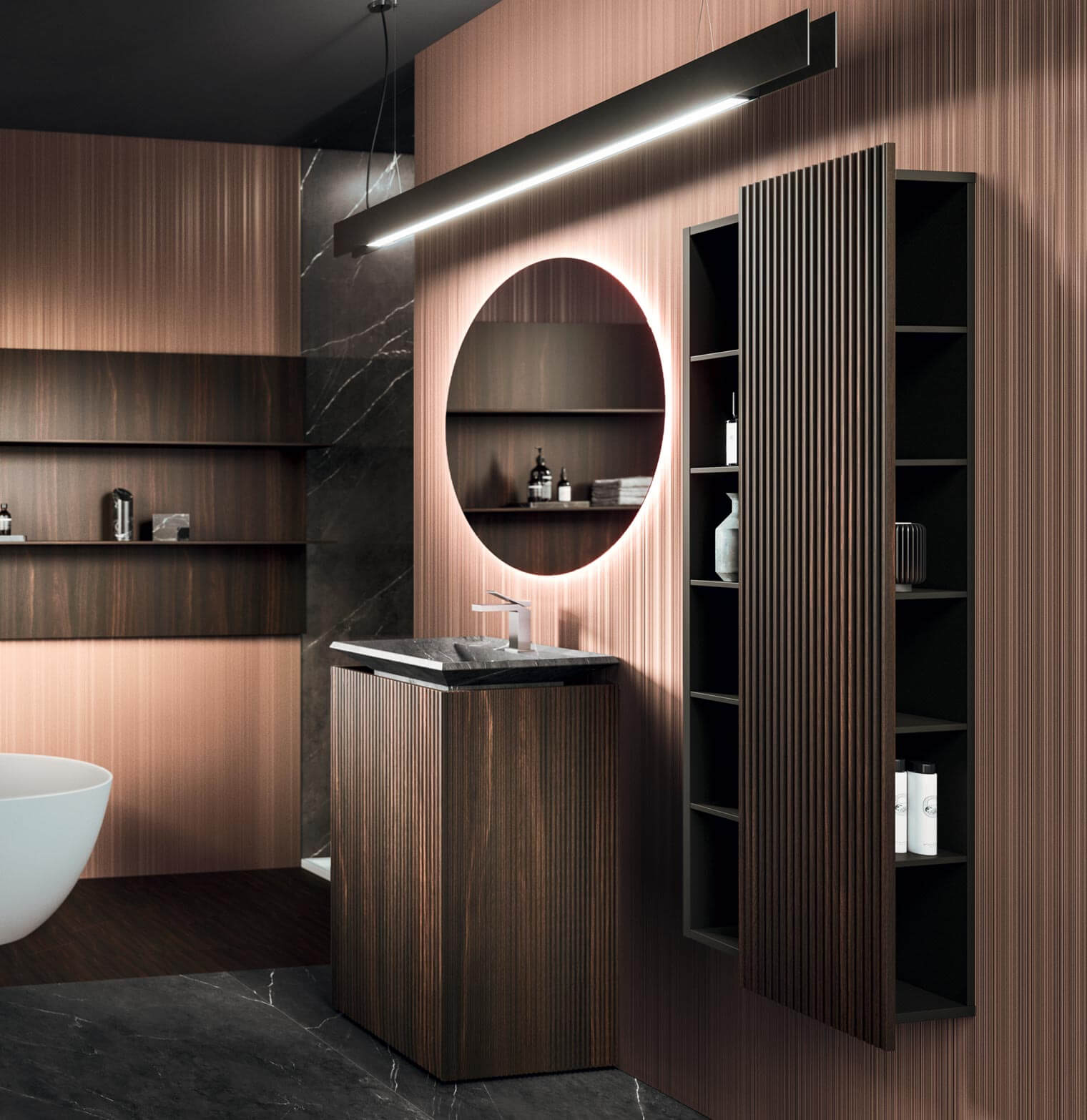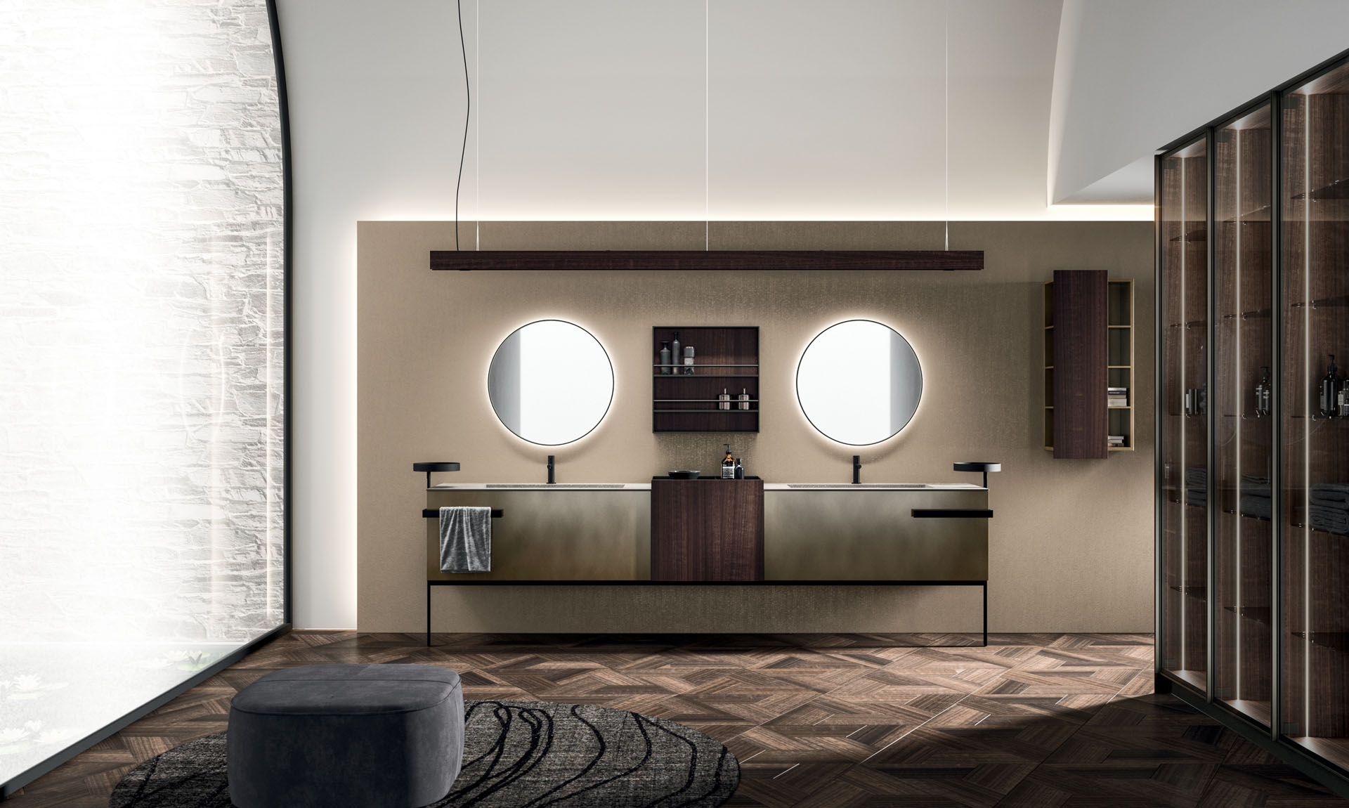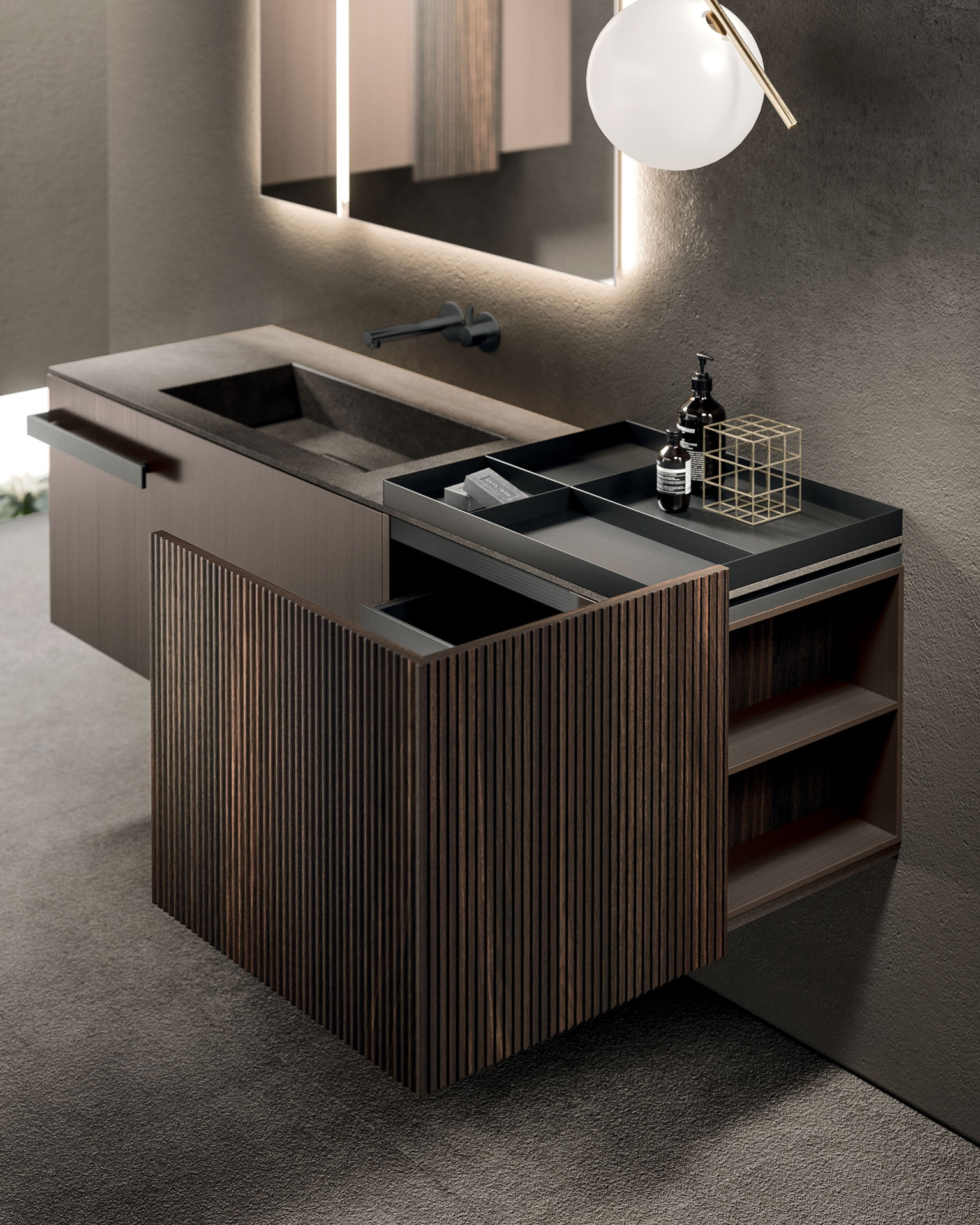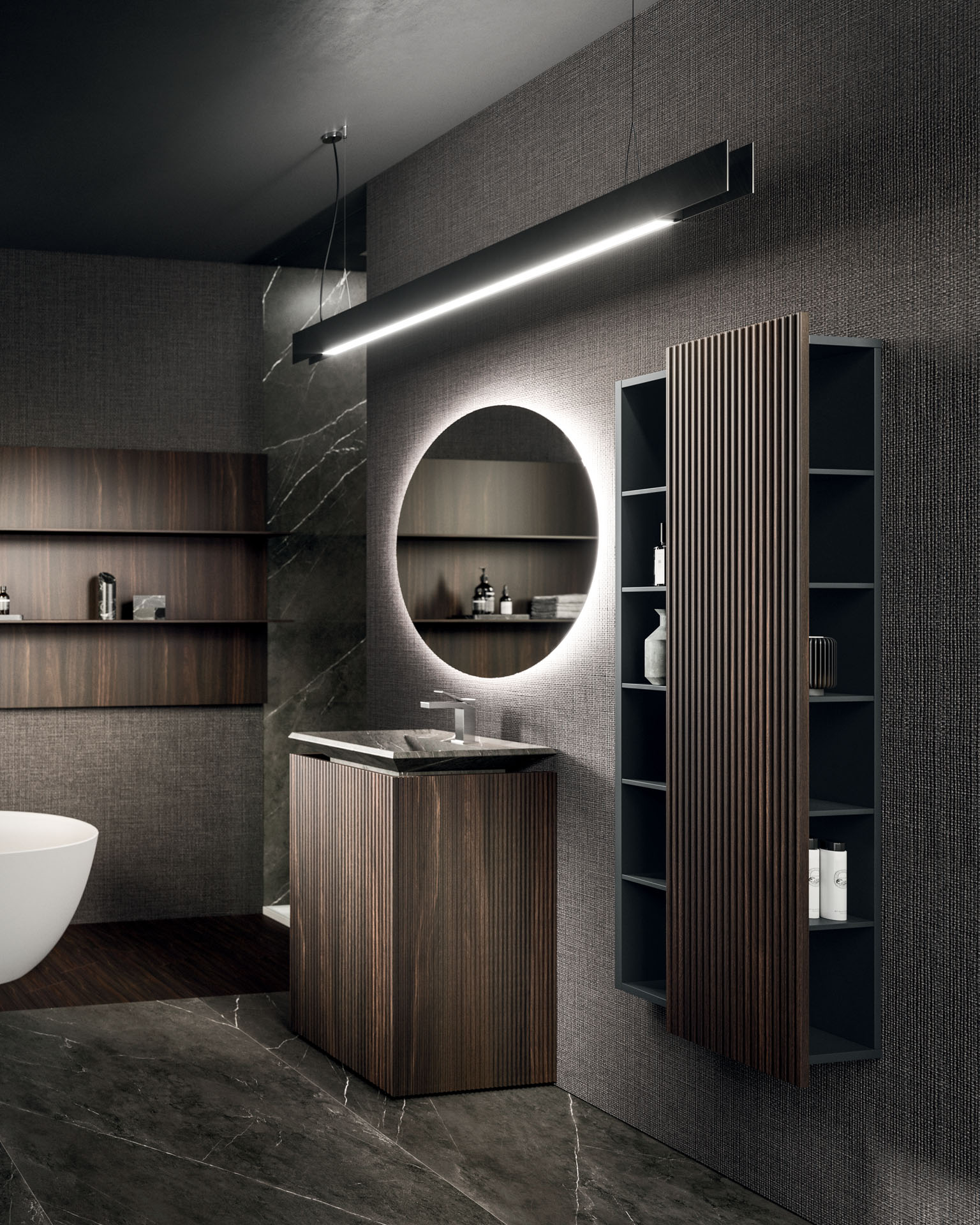 Lympha is a design piece created to meet the needs of a dynamic market where the bathroom environment is all about well-being and self-care. Defined by its stylistic lines, Lympha is proposed in ten different settings and stands out because of its noble materials and refined finishes such as: oxidized lacquers, precious wood – particularly Terra Dogato Oak with 3D processing including thin and vertical staves that characterise some of Lympha’s elements. Among the novelties within Lympha, you can benefit from a new pull-out terminal module through which you can access two distinct storage compartments – one on the front and the other on the back – with a single movement. Other novelties include a practical revolving tray connected to the painted metal basement, shelves for objects and towel holders, and the new opening systems with customisable handles and profiles. What also makes Lympha a special design product is the Lympha lamp, a suspension system with LED lighting, available in different sizes and customisable with a variety of bathroom finishes. Lympha’s new type of mirrors with integrated LED lighting in a wide dimensional range perfectly complete this proposal.