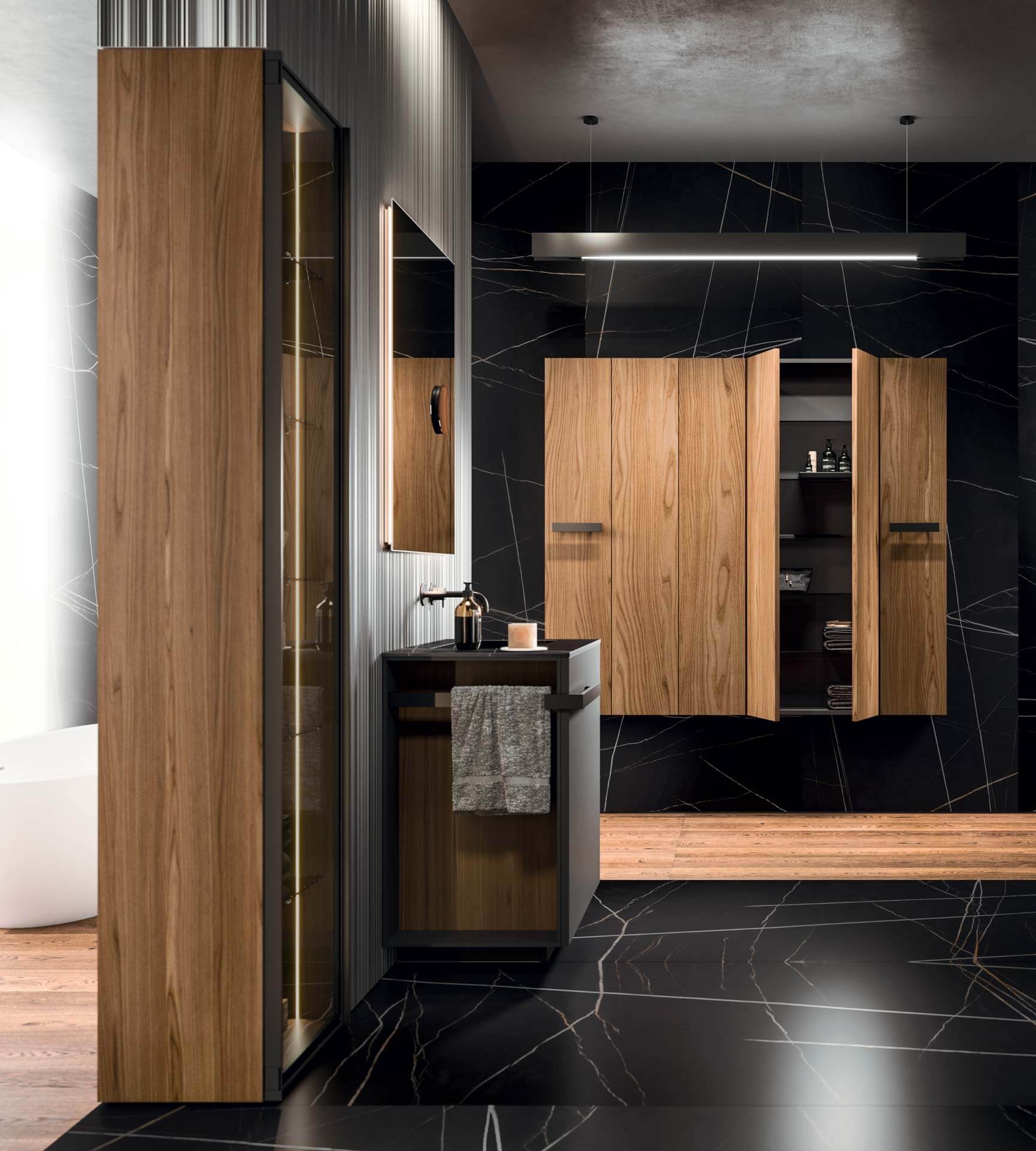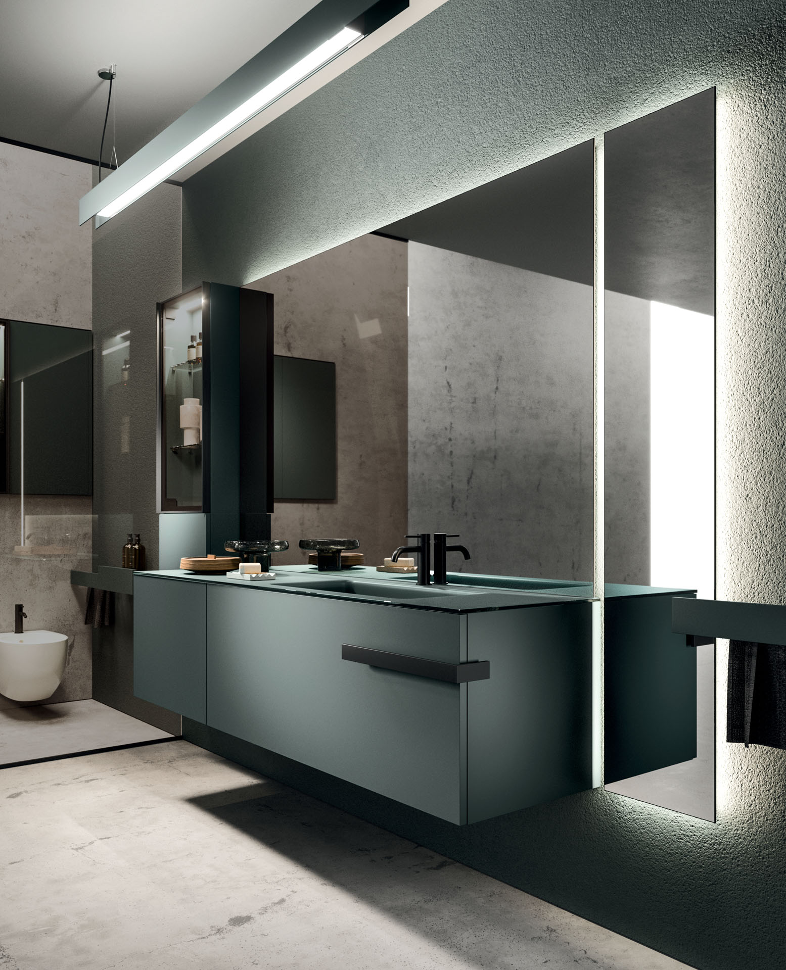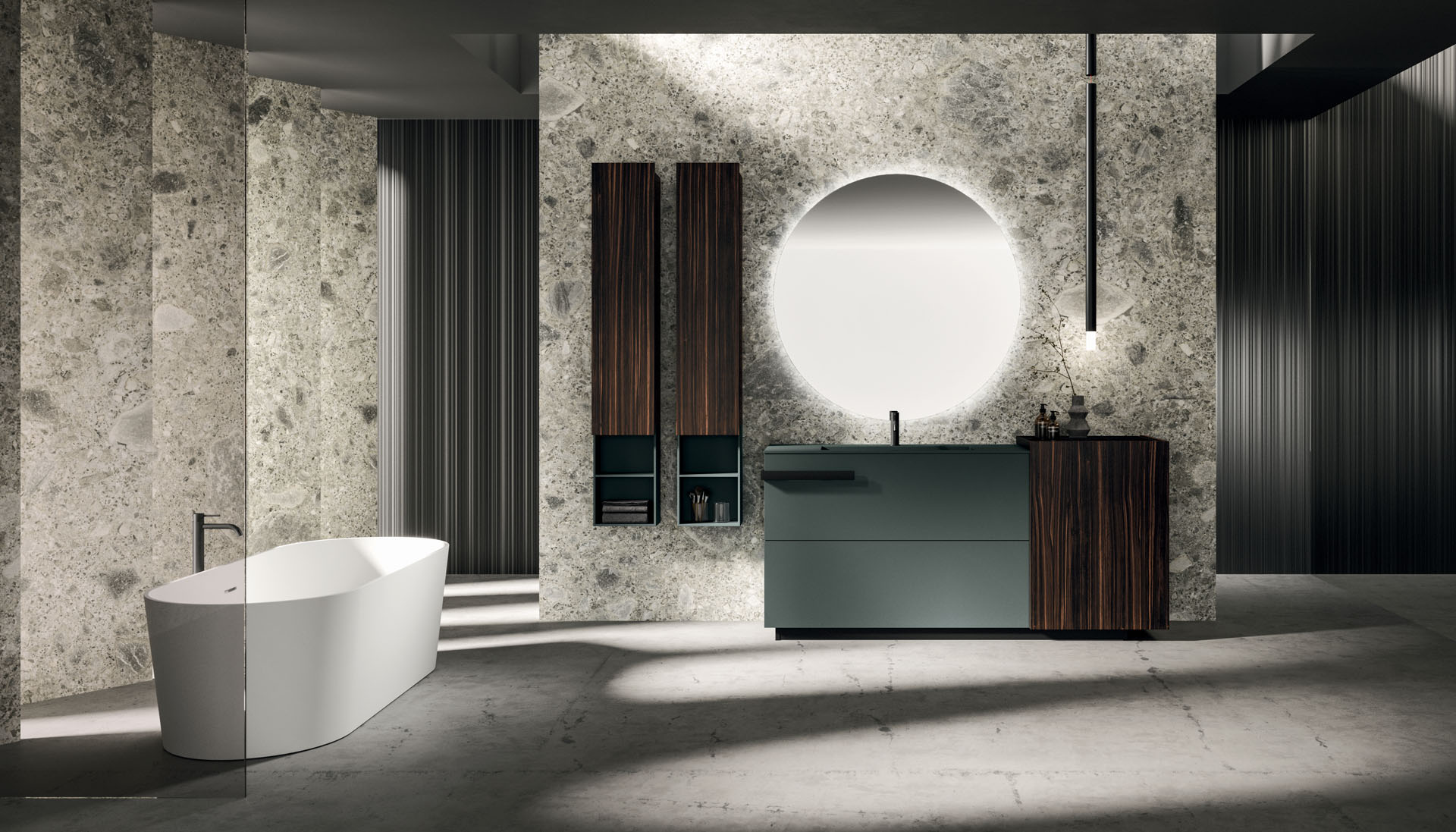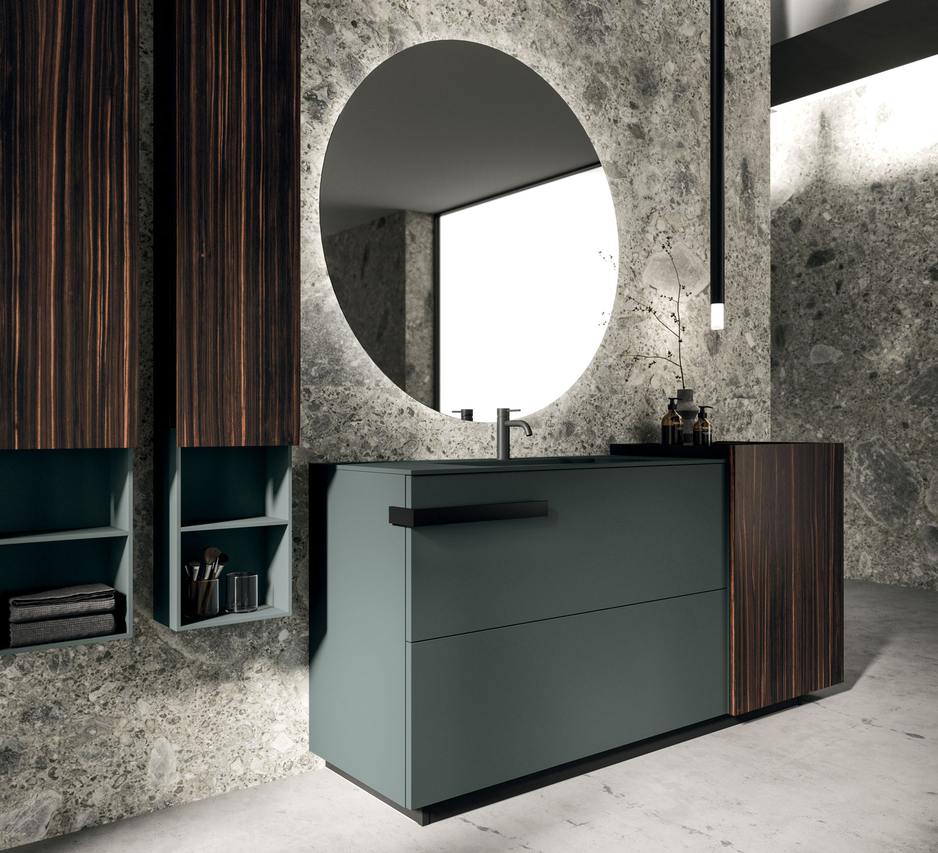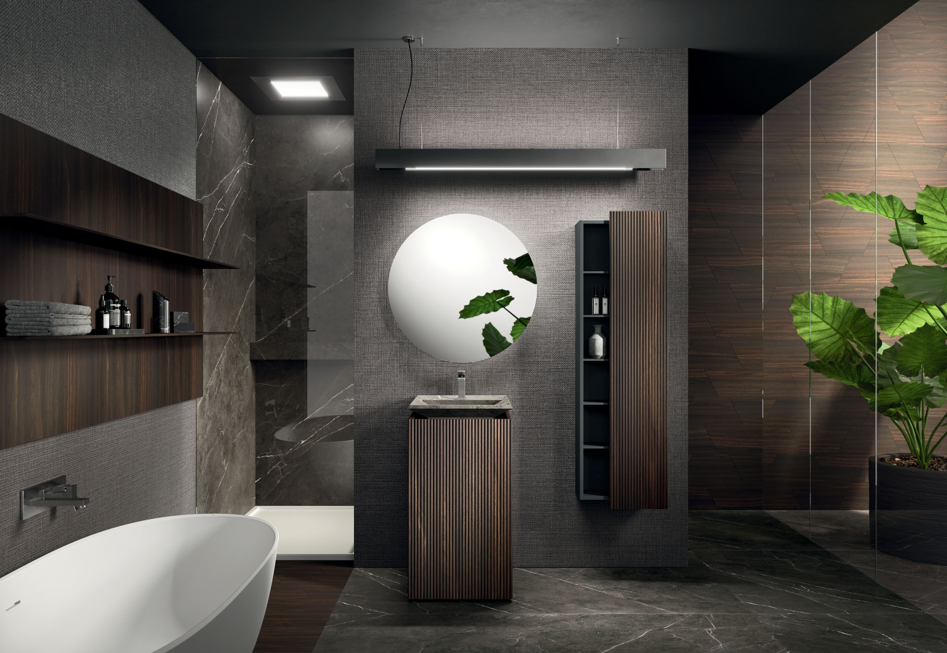 Lympha is a design piece created to meet the needs of a dynamic market where the bathroom environment is all about well-being and self-care. Defined by its stylistic lines, Lympha is proposed in ten different settings and stands out because of its noble materials and refined finishes such as: oxidized lacquers, precious wood – particularly Terra Dogato Oak with 3D processing including thin and vertical staves that characterise some of Lympha’s elements. Among the novelties within Lympha, you can benefit from a new pull-out terminal module through which you can access two distinct storage compartments – one on the front and the other on the back – with a single movement. Other novelties include a practical revolving tray connected to the painted metal basement, shelves for objects and towel holders, and the new opening systems with customisable handles and profiles. What also makes Lympha a special design product is the Lympha lamp, a suspension system with LED lighting, available in different sizes and customisable with a variety of bathroom finishes. Lympha’s new type of mirrors with integrated LED lighting in a wide dimensional range perfectly complete this proposal.