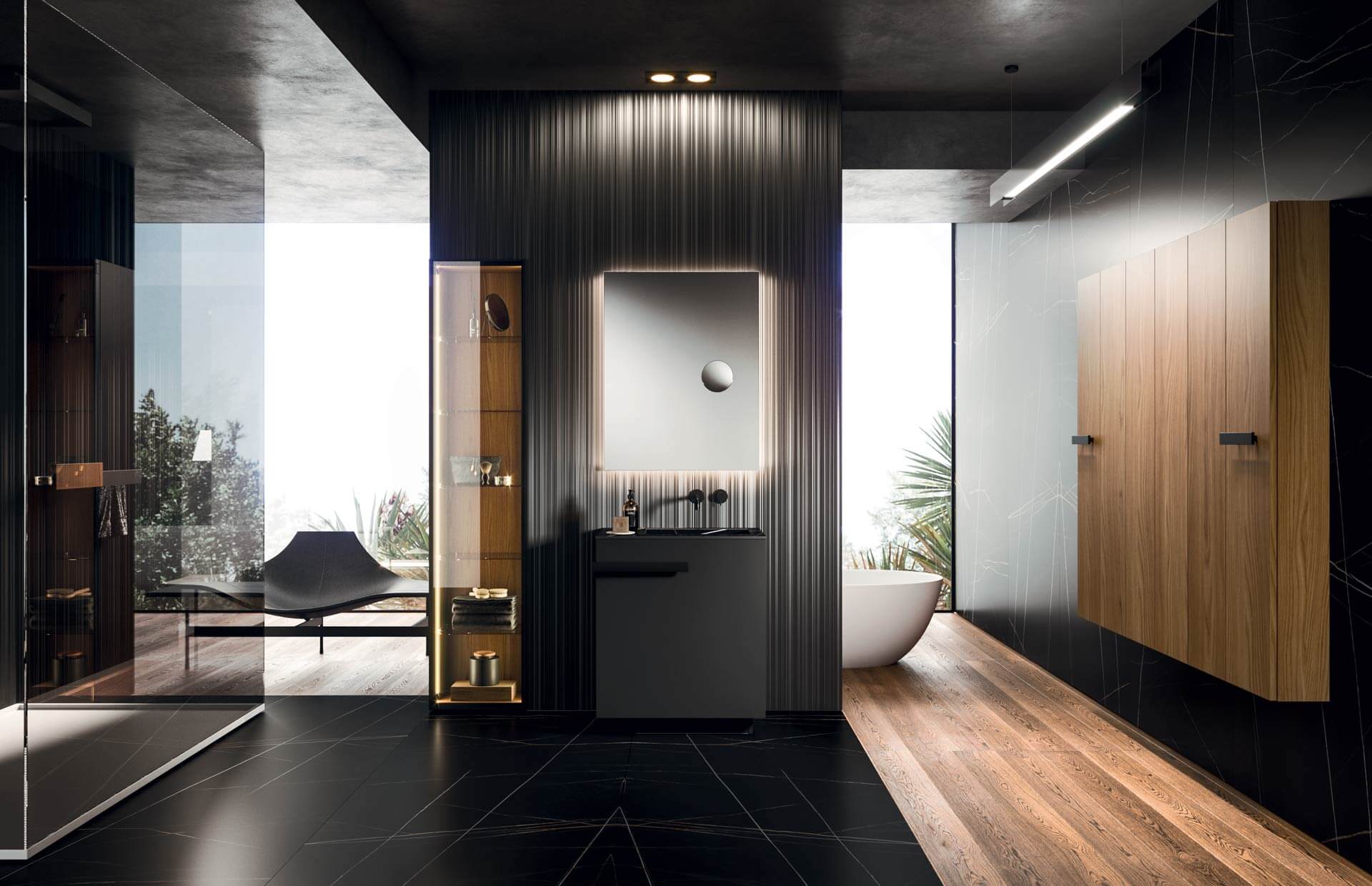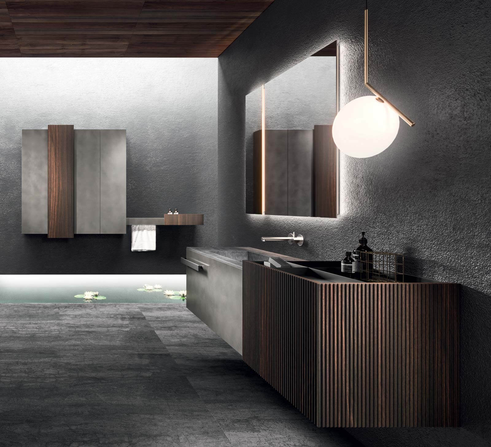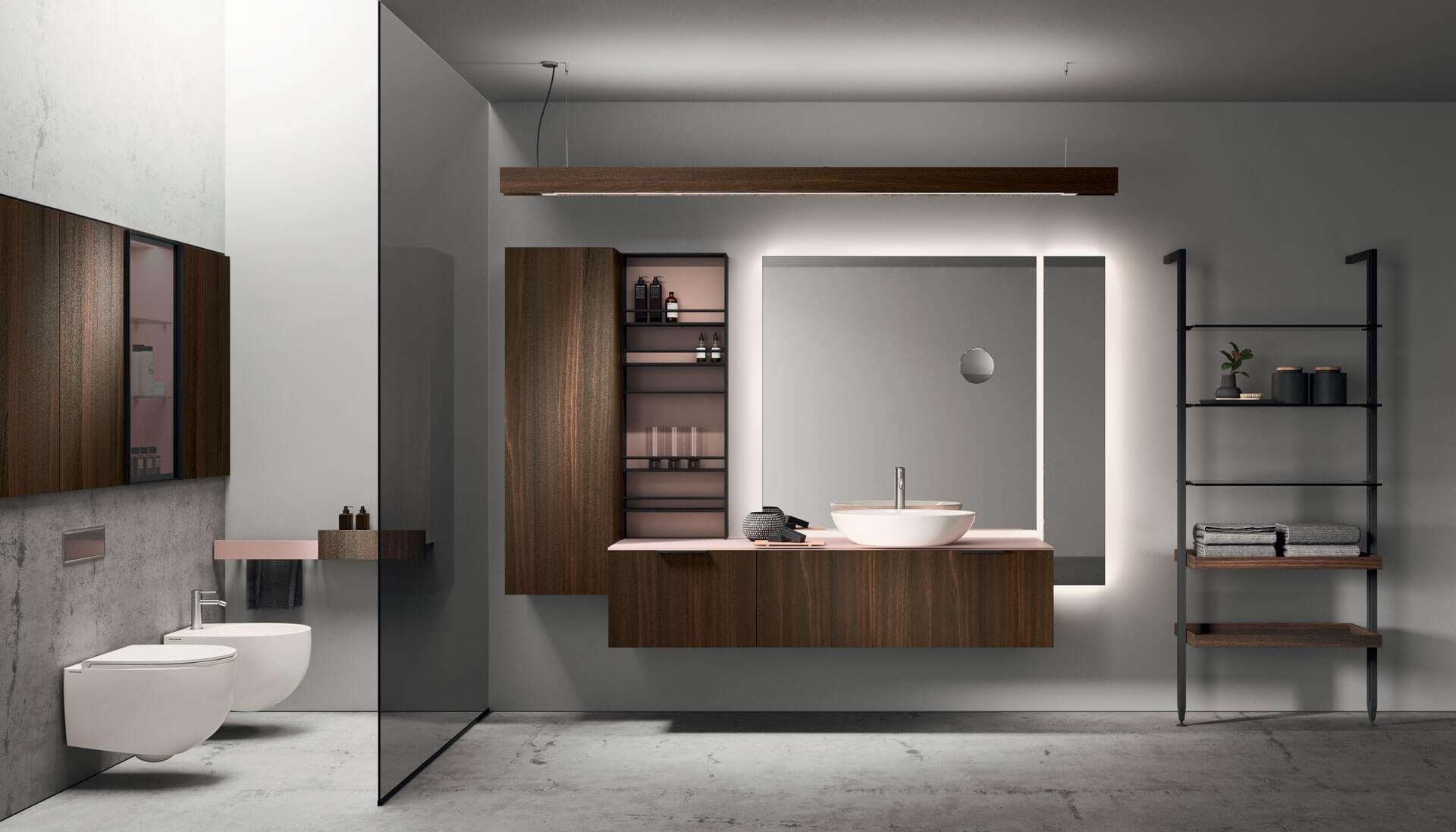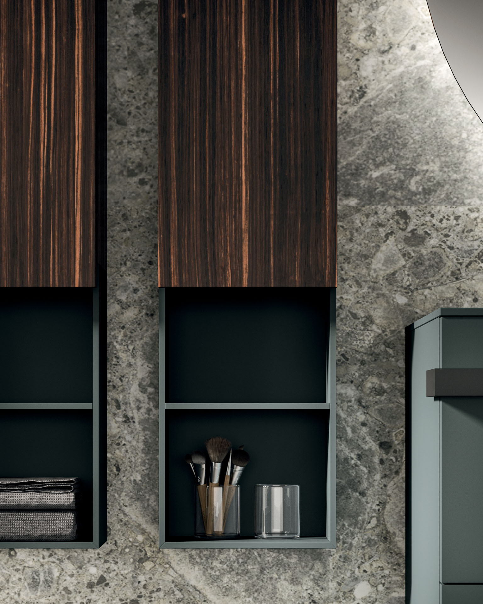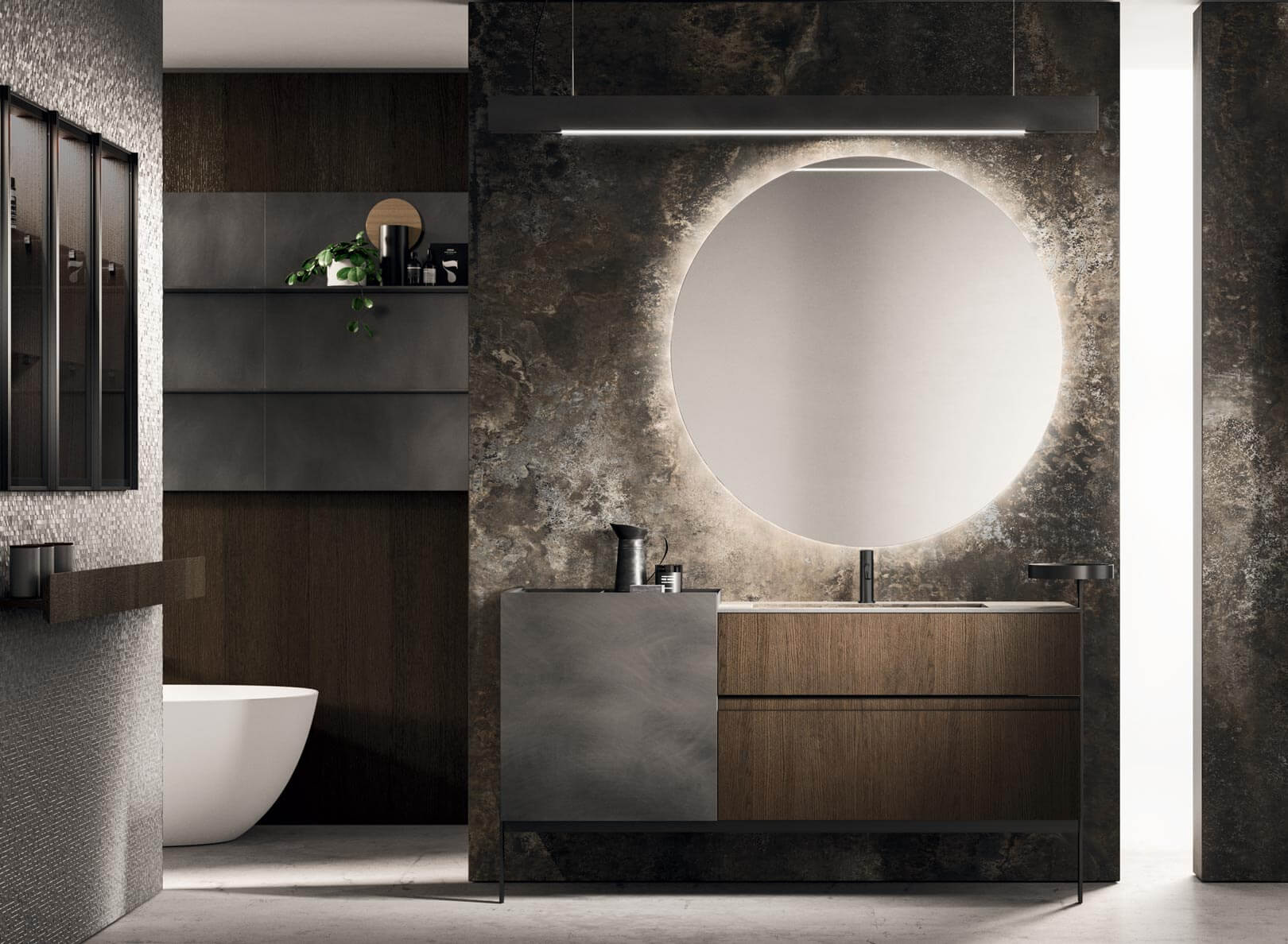 Lympha is a design piece created to meet the needs of a dynamic market where the bathroom environment is all about well-being and self-care. Defined by its stylistic lines, Lympha is proposed in ten different settings and stands out because of its noble materials and refined finishes such as: oxidized lacquers, precious wood – particularly Terra Dogato Oak with 3D processing including thin and vertical staves that characterise some of Lympha’s elements. Among the novelties within Lympha, you can benefit from a new pull-out terminal module through which you can access two distinct storage compartments – one on the front and the other on the back – with a single movement. Other novelties include a practical revolving tray connected to the painted metal basement, shelves for objects and towel holders, and the new opening systems with customisable handles and profiles. What also makes Lympha a special design product is the Lympha lamp, a suspension system with LED lighting, available in different sizes and customisable with a variety of bathroom finishes. Lympha’s new type of mirrors with integrated LED lighting in a wide dimensional range perfectly complete this proposal.