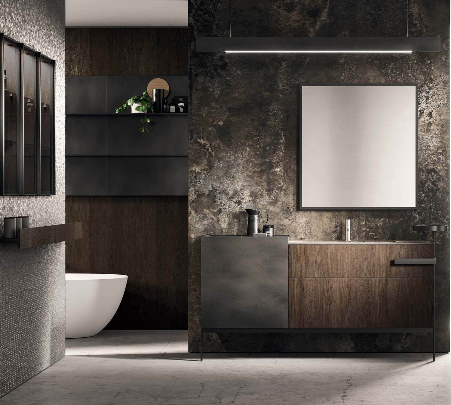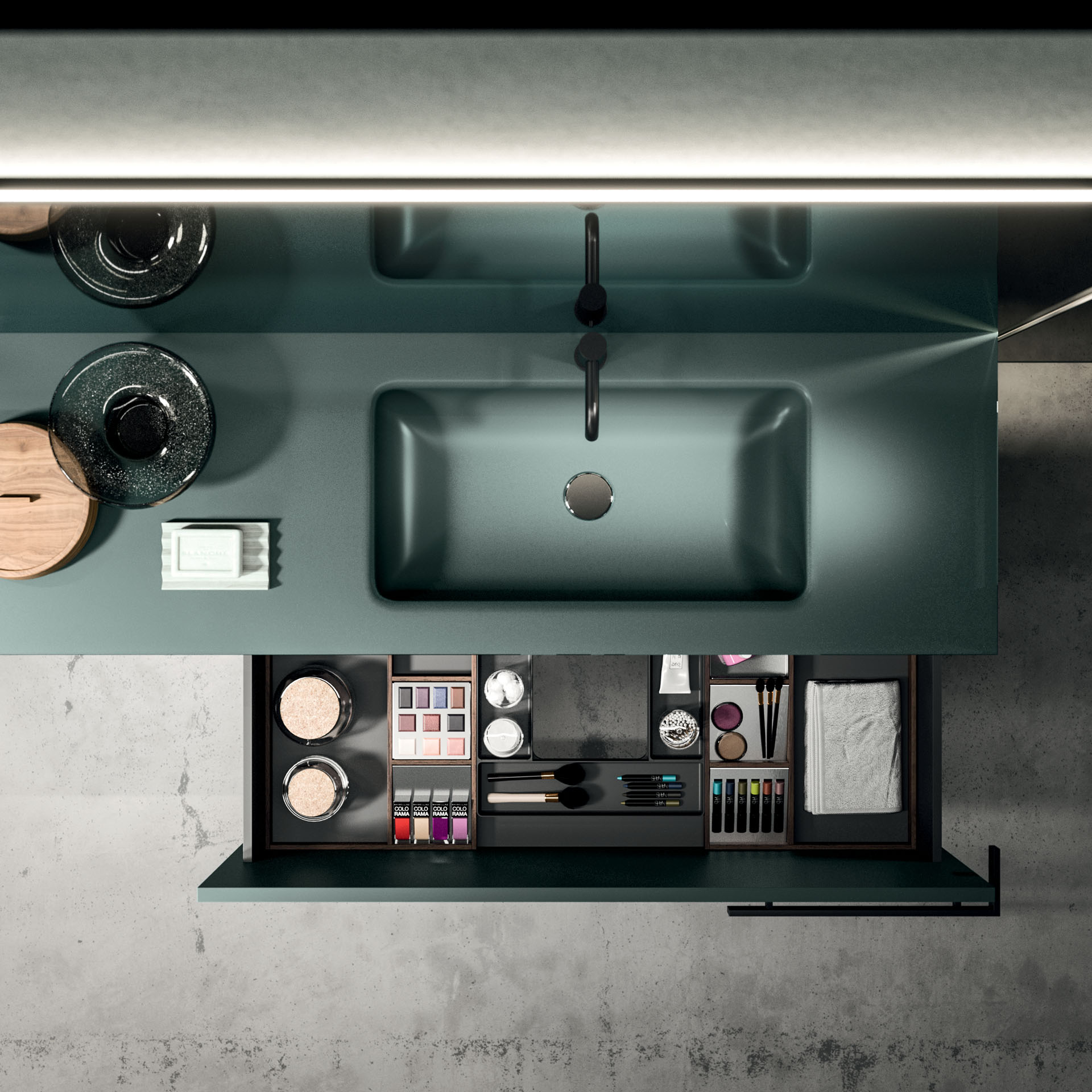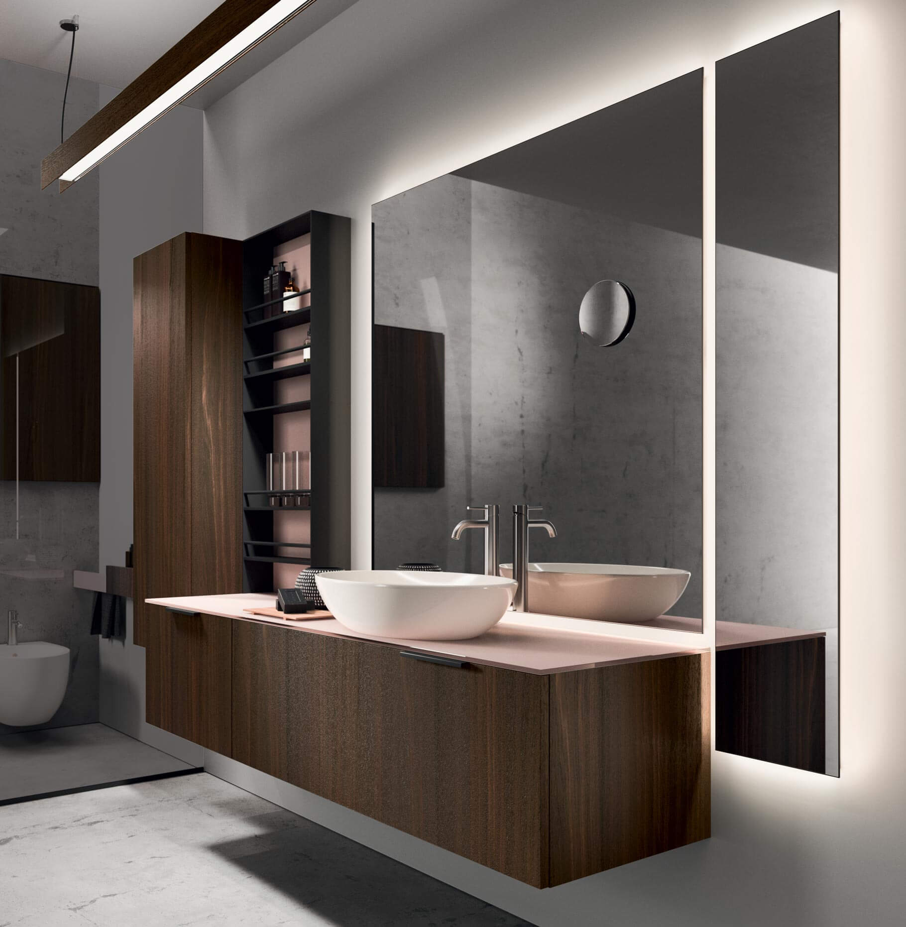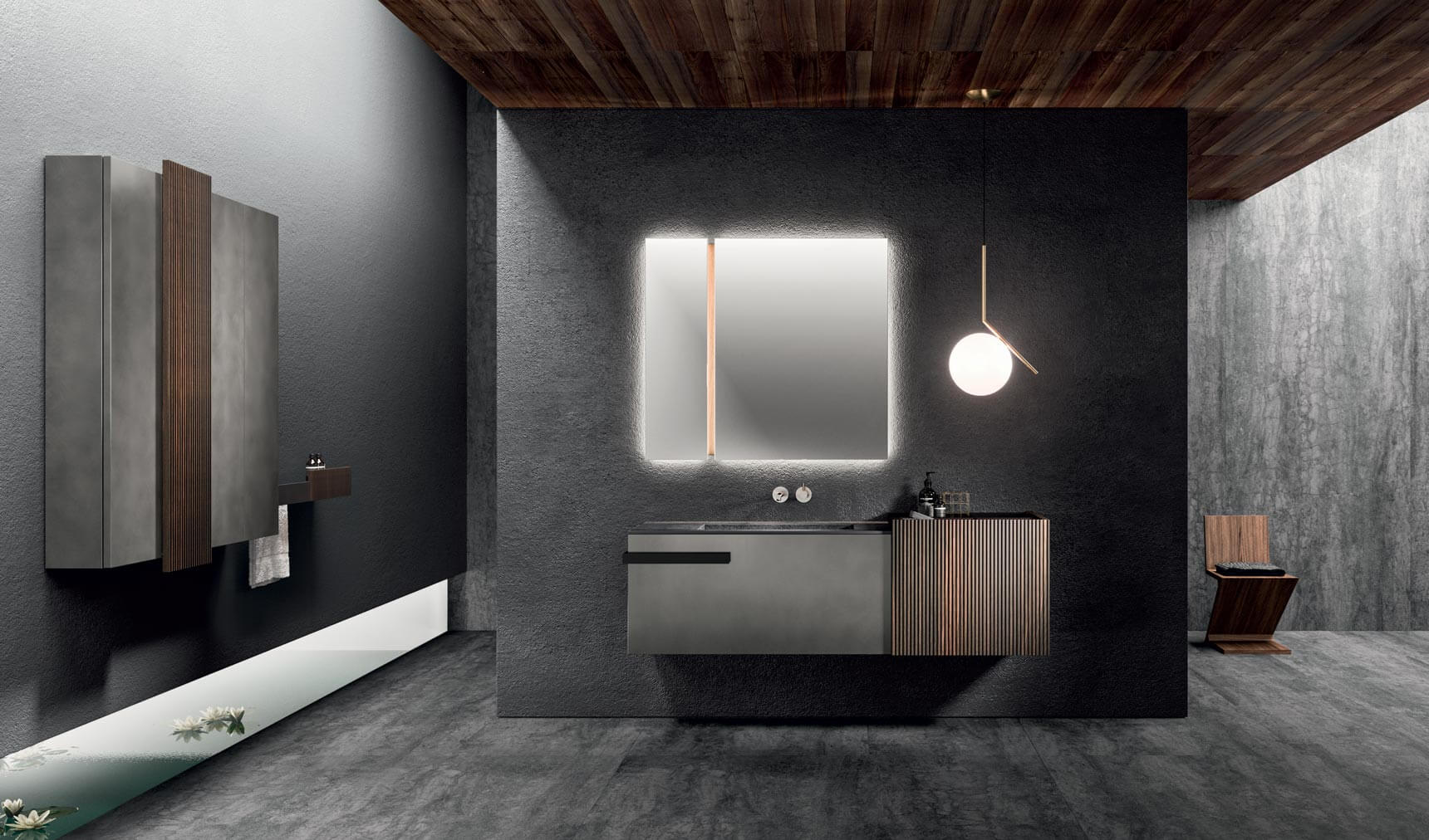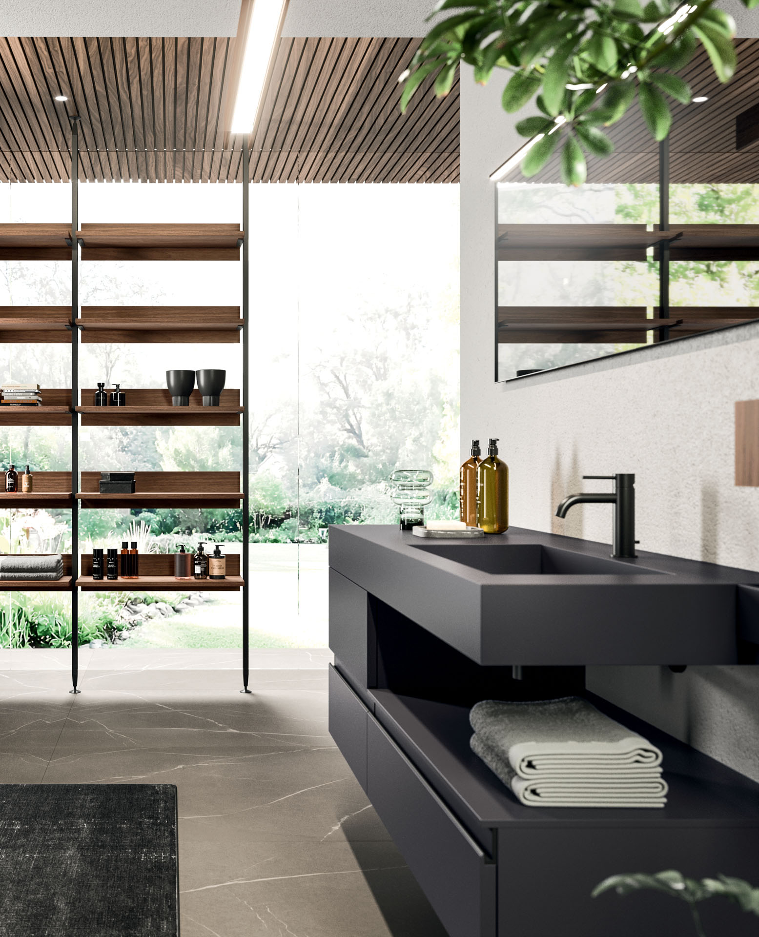 Lympha is a design piece created to meet the needs of a dynamic market where the bathroom environment is all about well-being and self-care. Defined by its stylistic lines, Lympha is proposed in ten different settings and stands out because of its noble materials and refined finishes such as: oxidized lacquers, precious wood – particularly Terra Dogato Oak with 3D processing including thin and vertical staves that characterise some of Lympha’s elements. Among the novelties within Lympha, you can benefit from a new pull-out terminal module through which you can access two distinct storage compartments – one on the front and the other on the back – with a single movement. Other novelties include a practical revolving tray connected to the painted metal basement, shelves for objects and towel holders, and the new opening systems with customisable handles and profiles. What also makes Lympha a special design product is the Lympha lamp, a suspension system with LED lighting, available in different sizes and customisable with a variety of bathroom finishes. Lympha’s new type of mirrors with integrated LED lighting in a wide dimensional range perfectly complete this proposal.