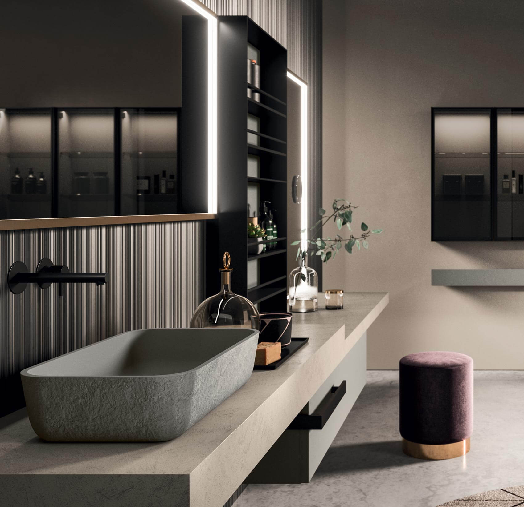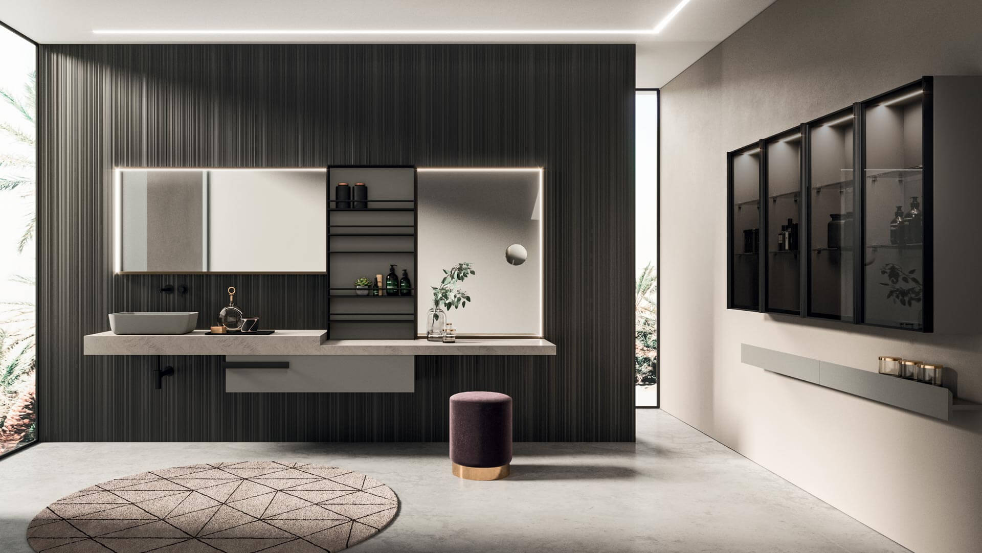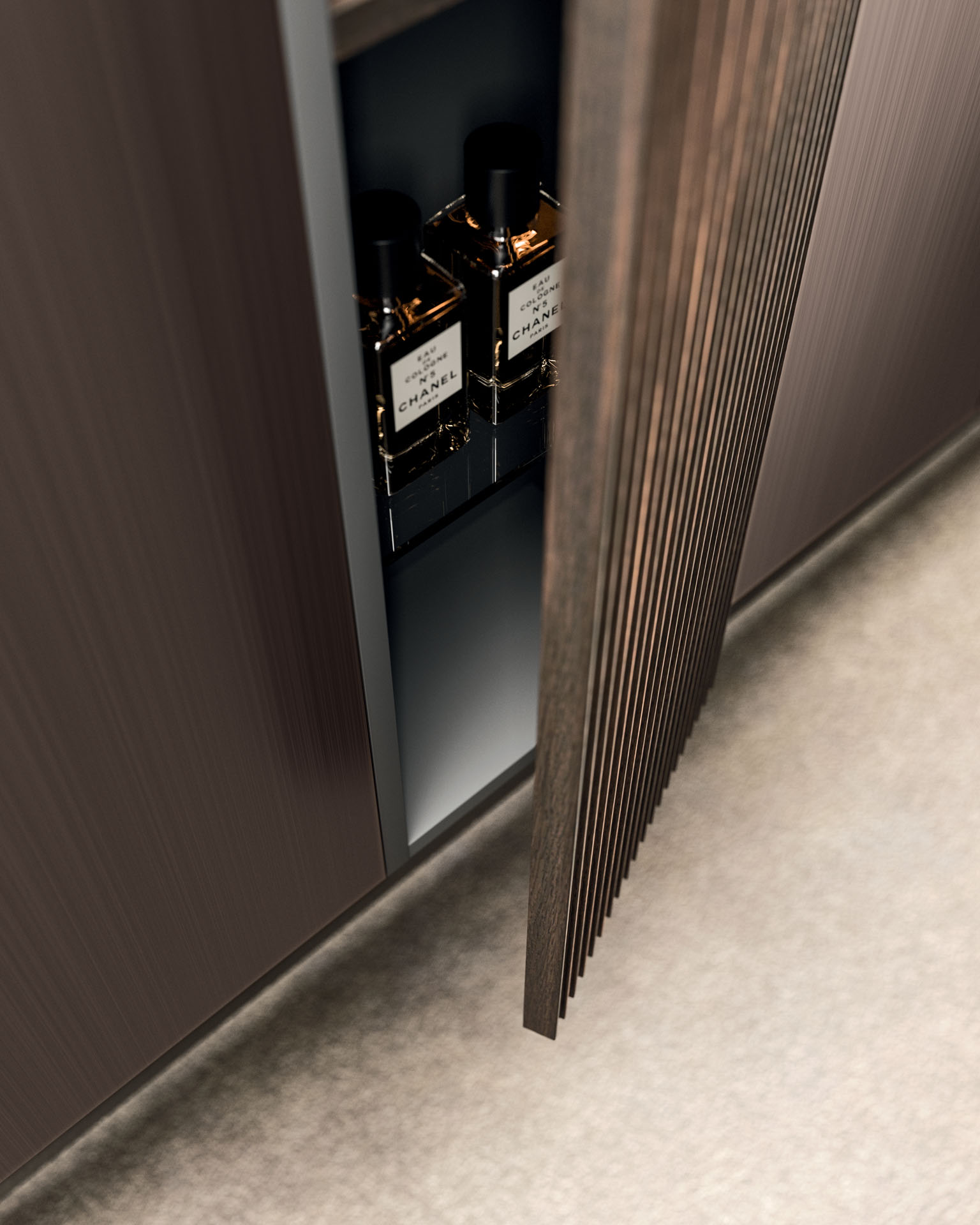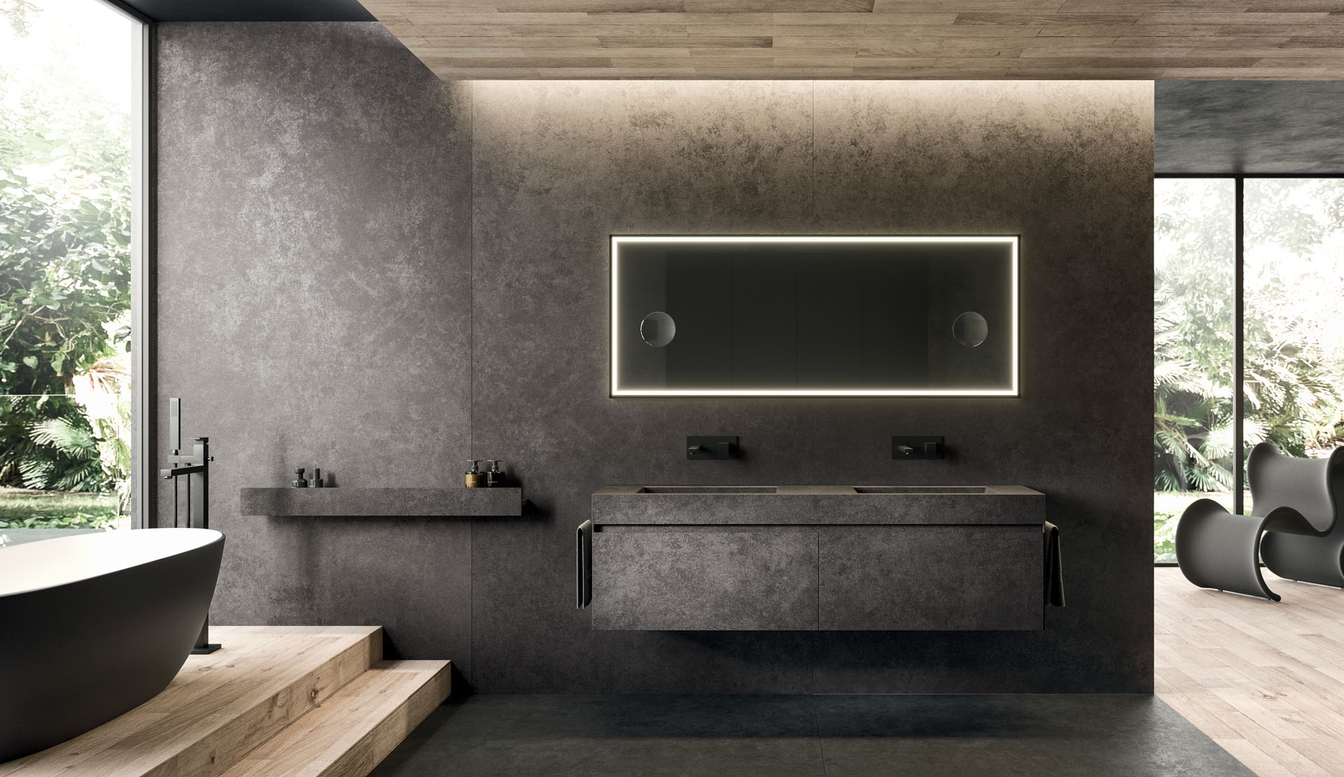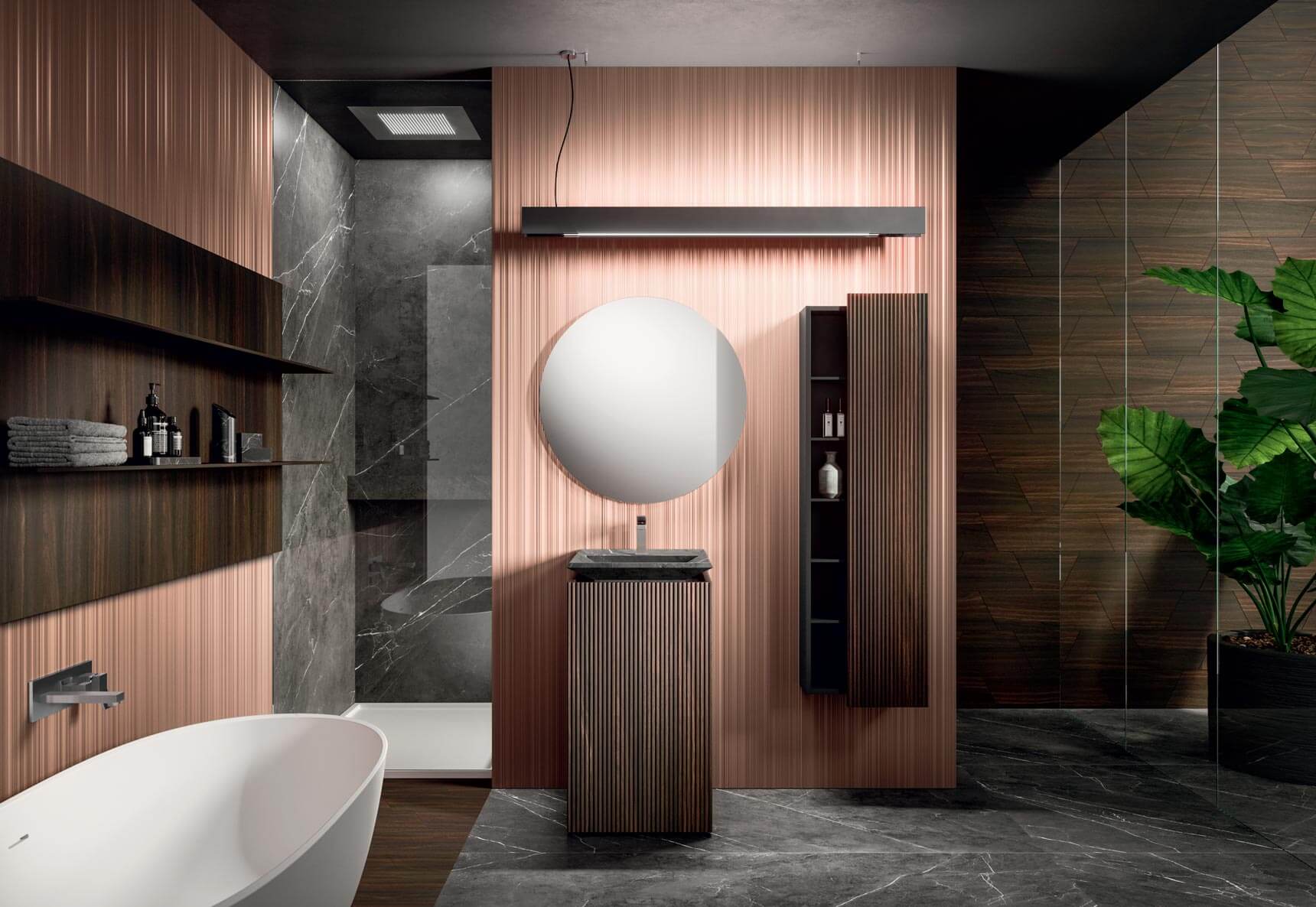 Lympha is a design piece created to meet the needs of a dynamic market where the bathroom environment is all about well-being and self-care. Defined by its stylistic lines, Lympha is proposed in ten different settings and stands out because of its noble materials and refined finishes such as: oxidized lacquers, precious wood – particularly Terra Dogato Oak with 3D processing including thin and vertical staves that characterise some of Lympha’s elements. Among the novelties within Lympha, you can benefit from a new pull-out terminal module through which you can access two distinct storage compartments – one on the front and the other on the back – with a single movement. Other novelties include a practical revolving tray connected to the painted metal basement, shelves for objects and towel holders, and the new opening systems with customisable handles and profiles. What also makes Lympha a special design product is the Lympha lamp, a suspension system with LED lighting, available in different sizes and customisable with a variety of bathroom finishes. Lympha’s new type of mirrors with integrated LED lighting in a wide dimensional range perfectly complete this proposal.