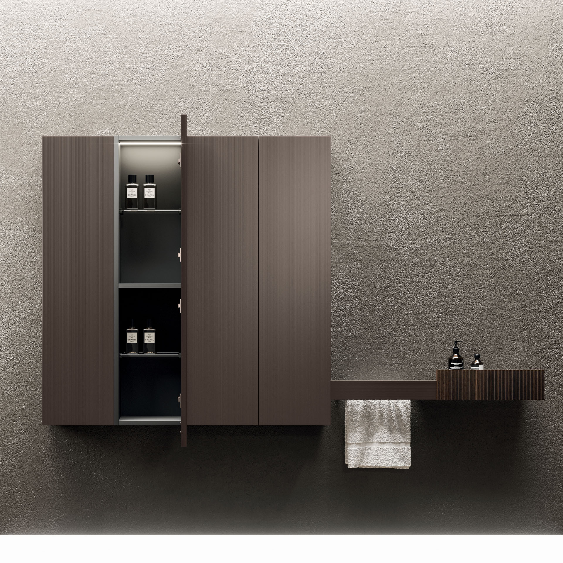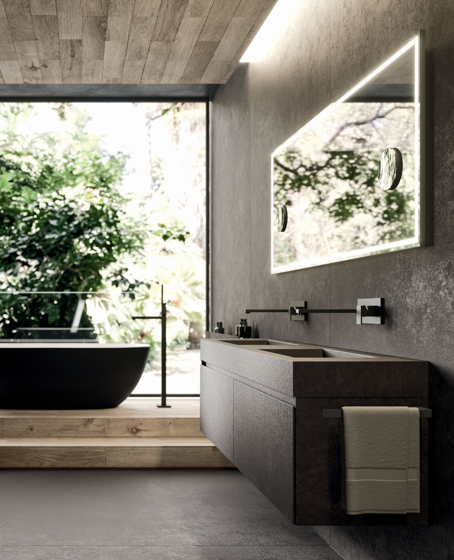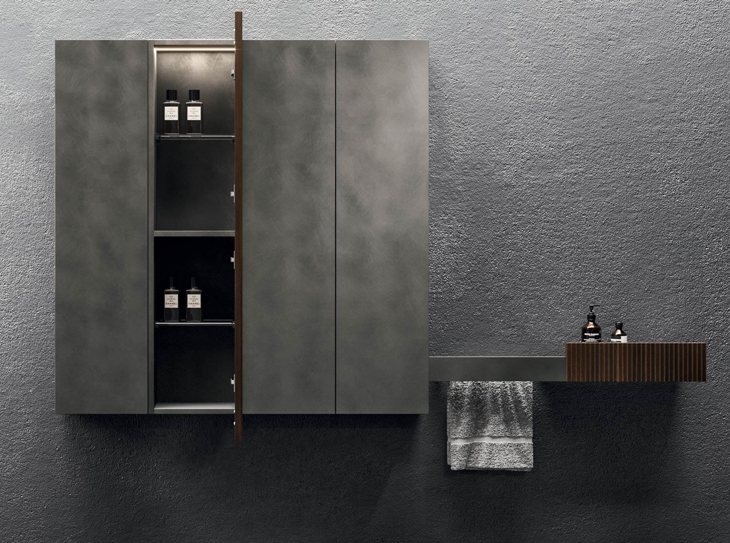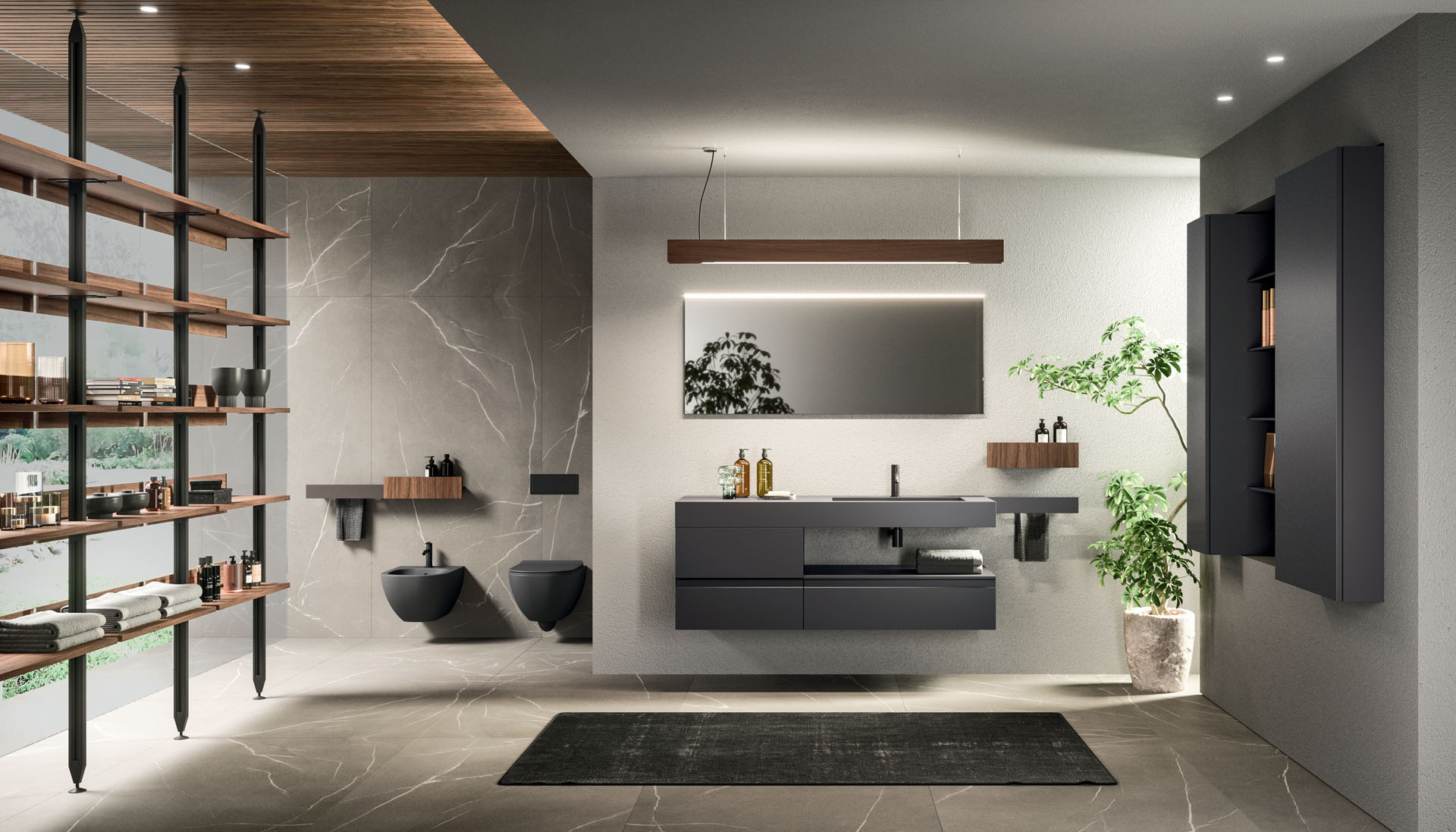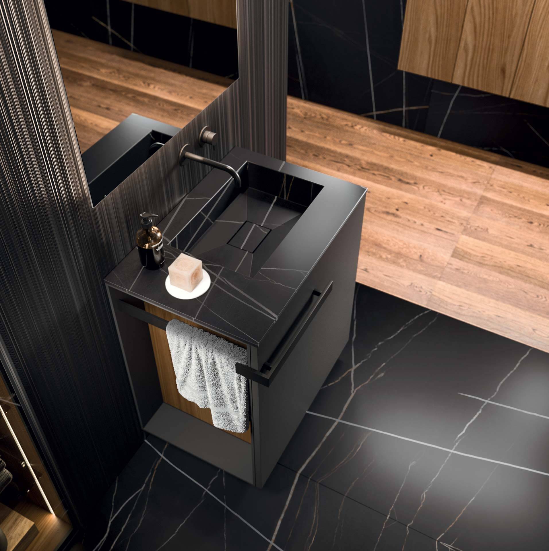 Lympha is a design piece created to meet the needs of a dynamic market where the bathroom environment is all about well-being and self-care. Defined by its stylistic lines, Lympha is proposed in ten different settings and stands out because of its noble materials and refined finishes such as: oxidized lacquers, precious wood – particularly Terra Dogato Oak with 3D processing including thin and vertical staves that characterise some of Lympha’s elements. Among the novelties within Lympha, you can benefit from a new pull-out terminal module through which you can access two distinct storage compartments – one on the front and the other on the back – with a single movement. Other novelties include a practical revolving tray connected to the painted metal basement, shelves for objects and towel holders, and the new opening systems with customisable handles and profiles. What also makes Lympha a special design product is the Lympha lamp, a suspension system with LED lighting, available in different sizes and customisable with a variety of bathroom finishes. Lympha’s new type of mirrors with integrated LED lighting in a wide dimensional range perfectly complete this proposal.