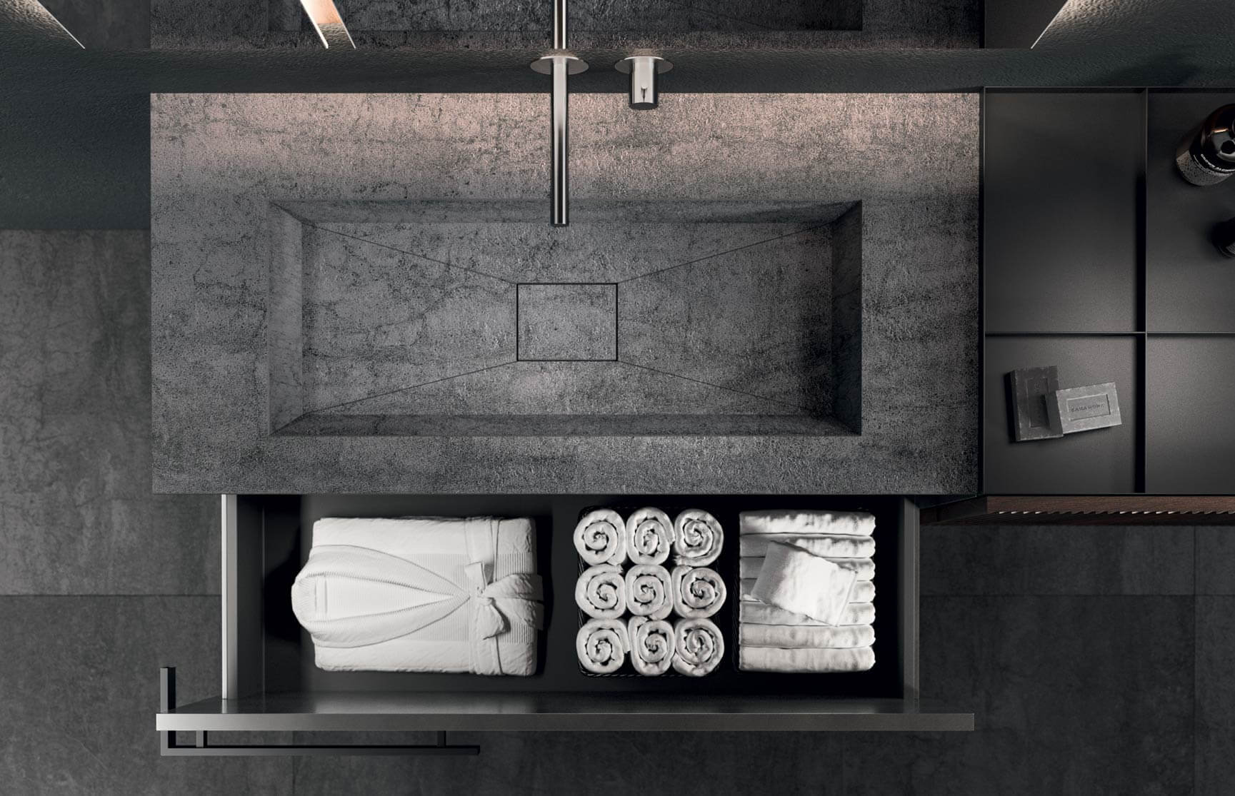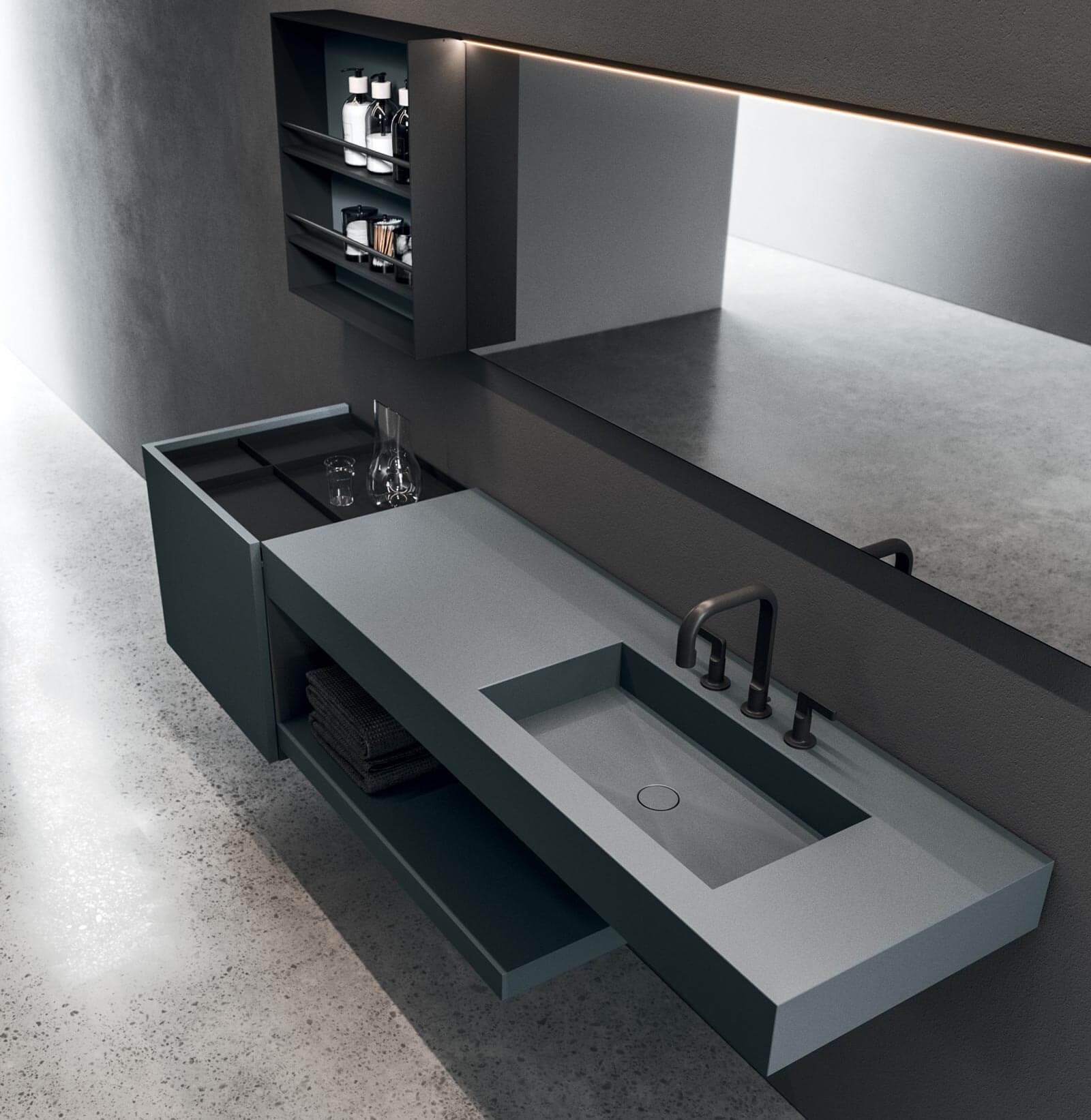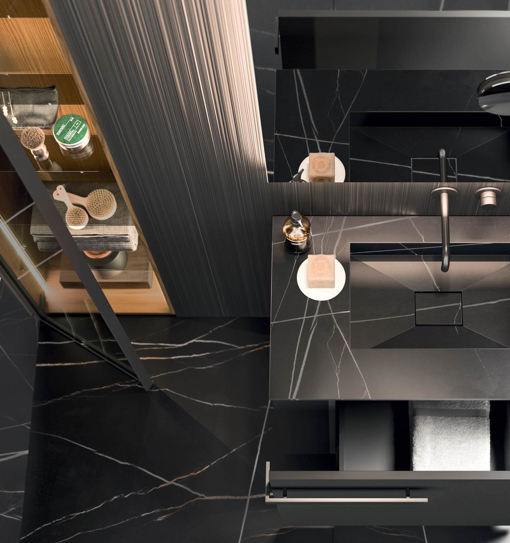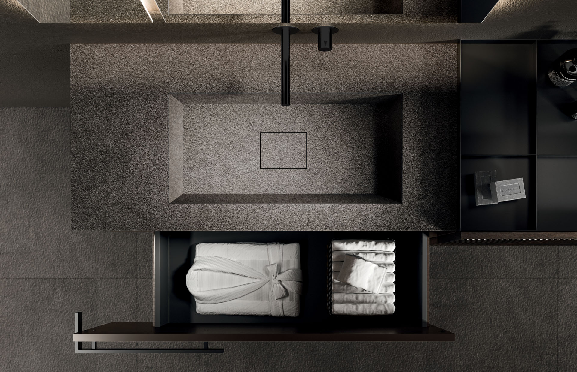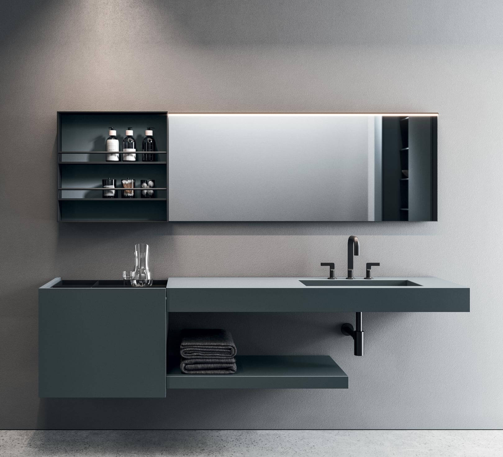 Lympha is a design piece created to meet the needs of a dynamic market where the bathroom environment is all about well-being and self-care. Defined by its stylistic lines, Lympha is proposed in ten different settings and stands out because of its noble materials and refined finishes such as: oxidized lacquers, precious wood – particularly Terra Dogato Oak with 3D processing including thin and vertical staves that characterise some of Lympha’s elements. Among the novelties within Lympha, you can benefit from a new pull-out terminal module through which you can access two distinct storage compartments – one on the front and the other on the back – with a single movement. Other novelties include a practical revolving tray connected to the painted metal basement, shelves for objects and towel holders, and the new opening systems with customisable handles and profiles. What also makes Lympha a special design product is the Lympha lamp, a suspension system with LED lighting, available in different sizes and customisable with a variety of bathroom finishes. Lympha’s new type of mirrors with integrated LED lighting in a wide dimensional range perfectly complete this proposal.