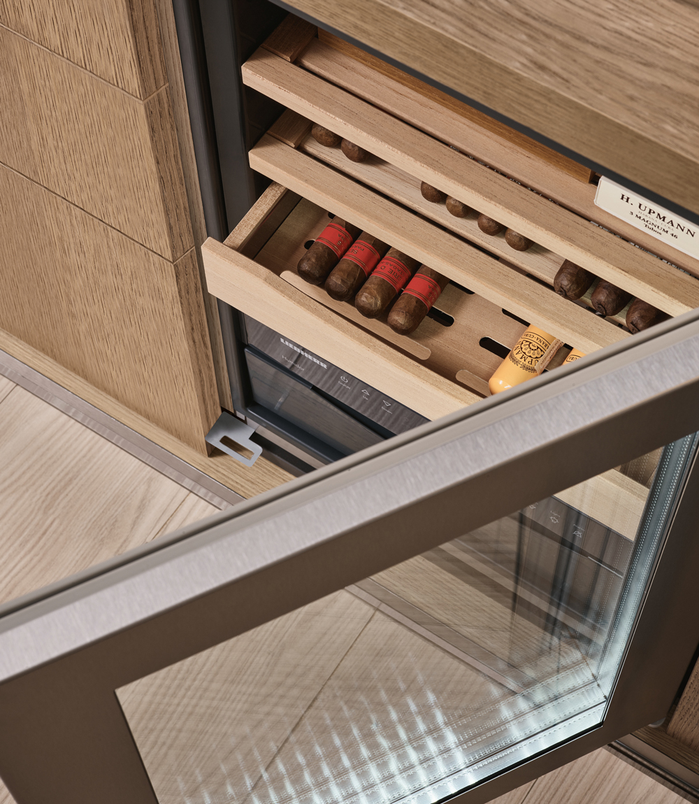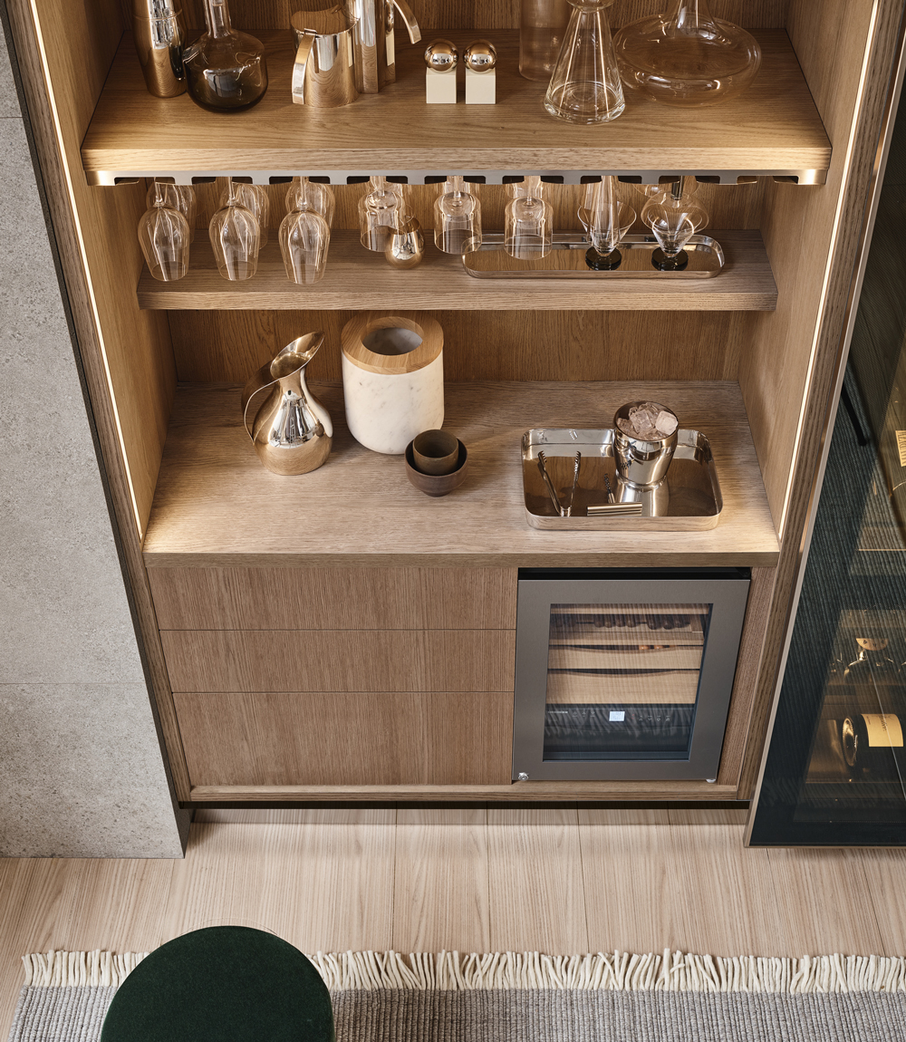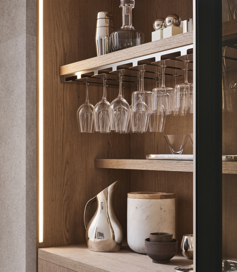 Epicure: Glass holders and drawers in solid wood.