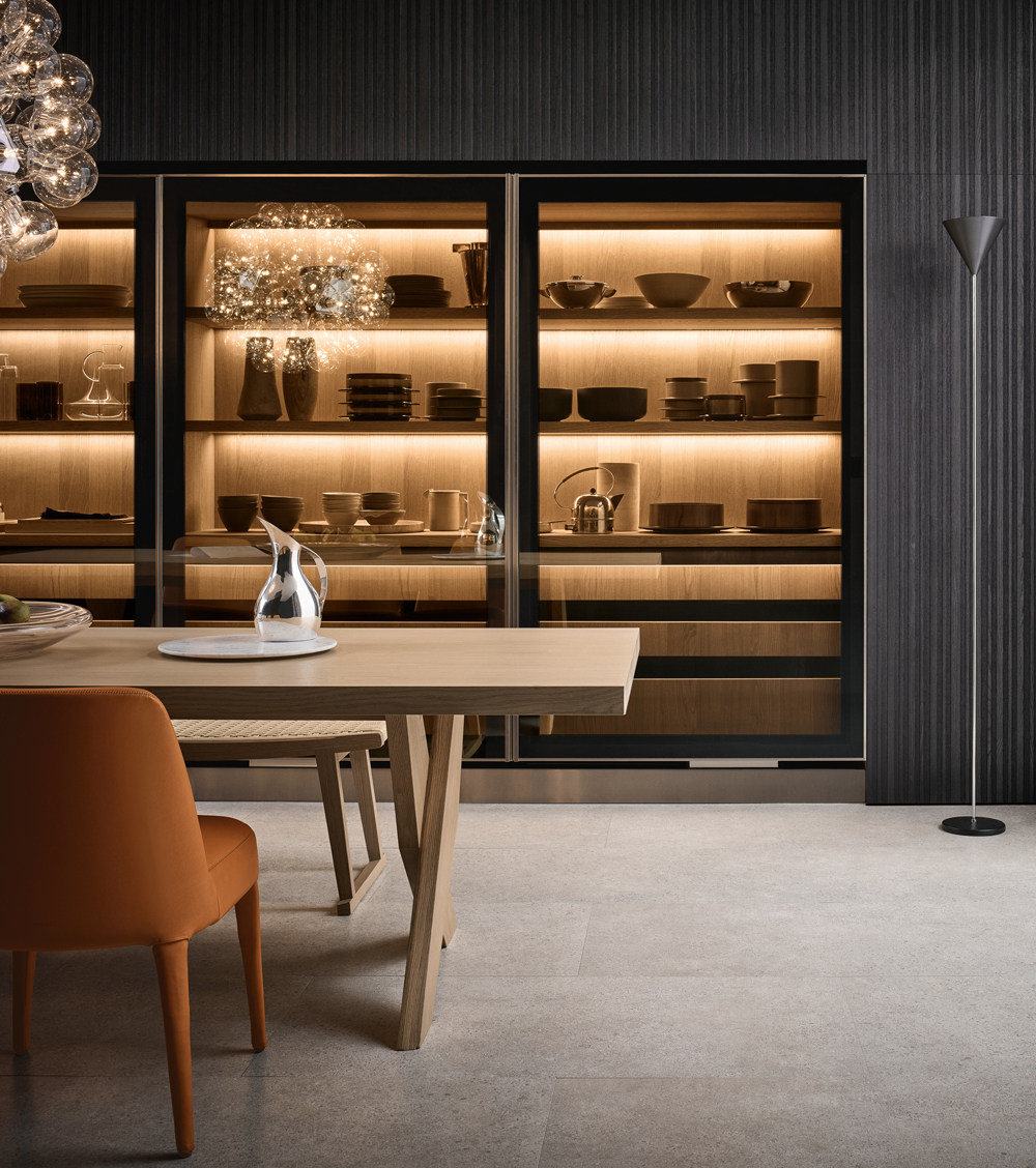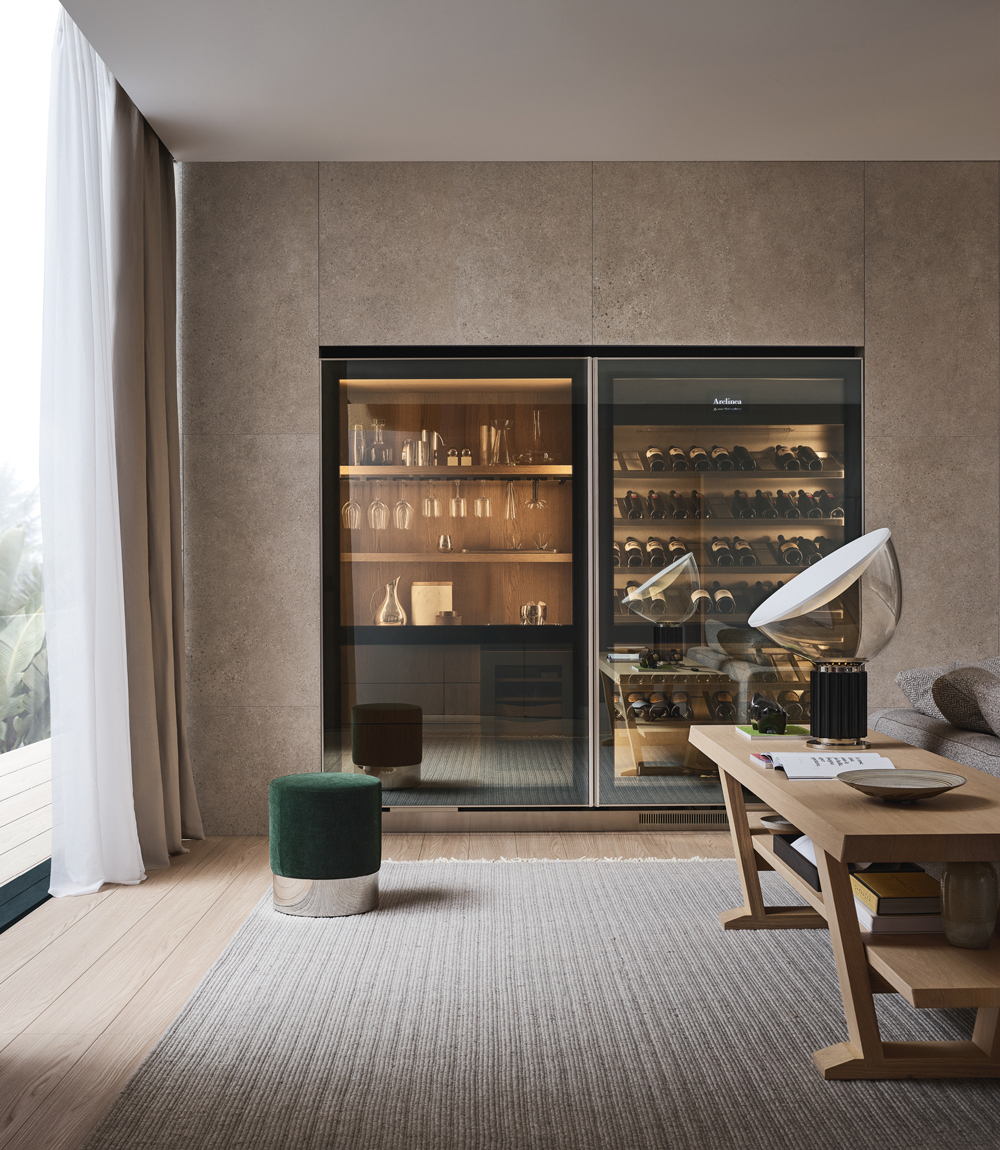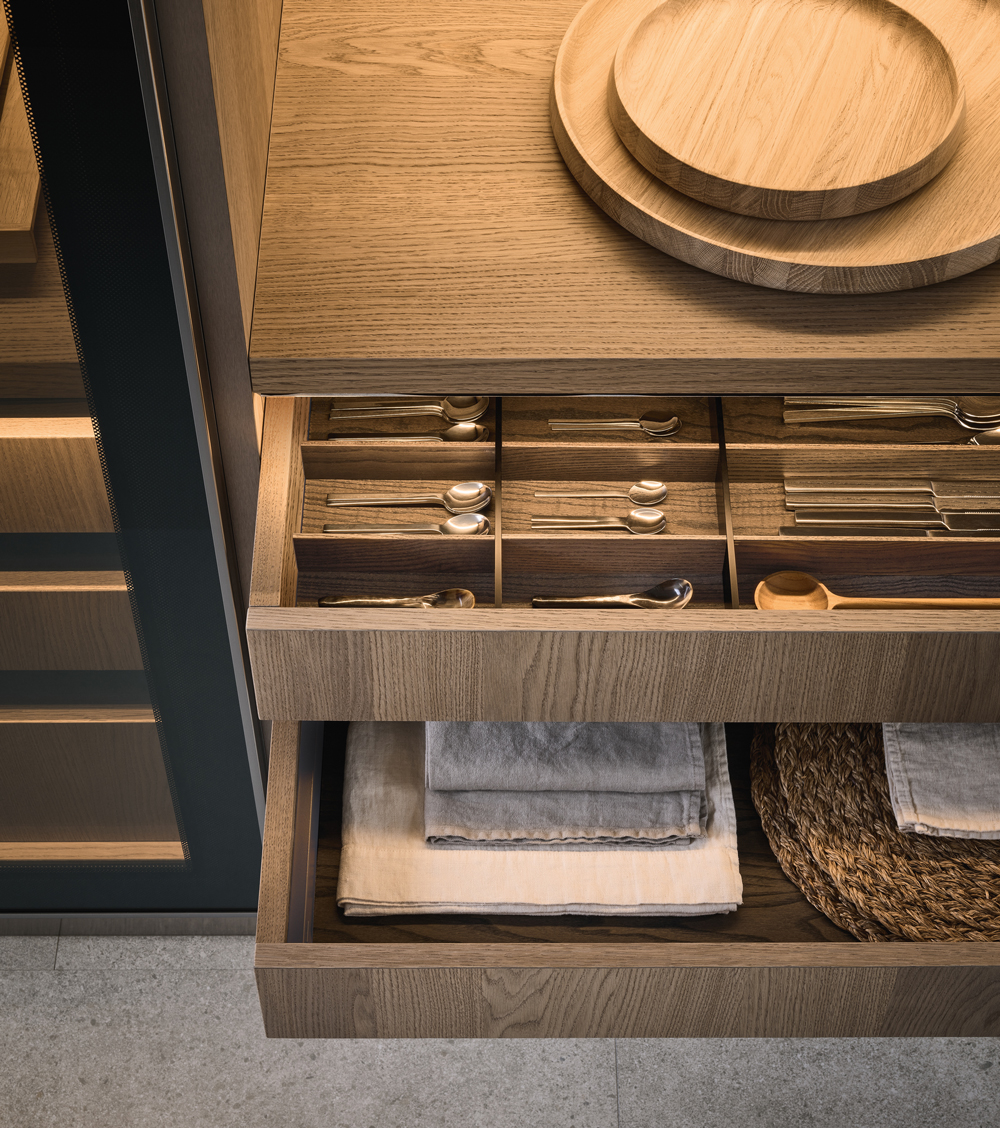 Epicure: Glass holders and drawers in solid wood.