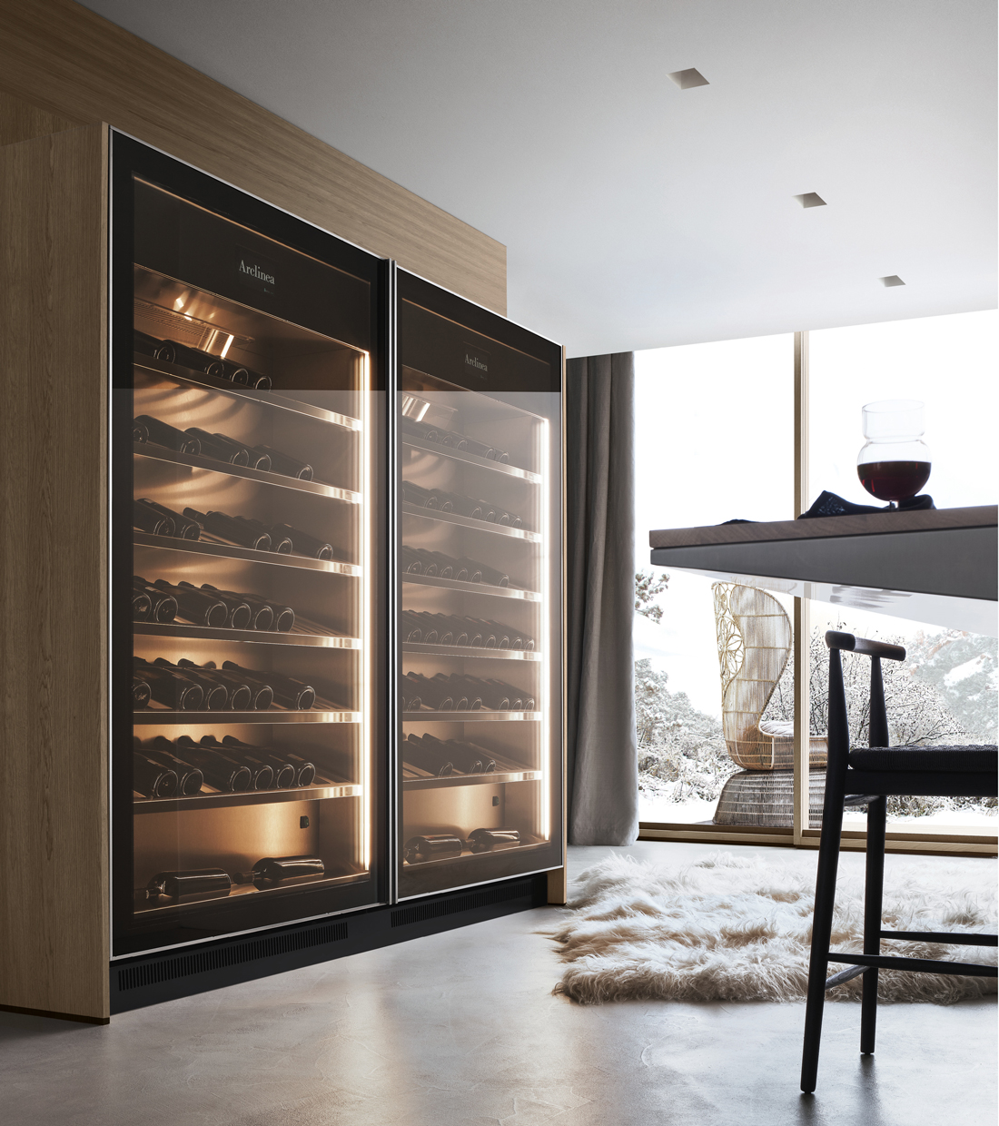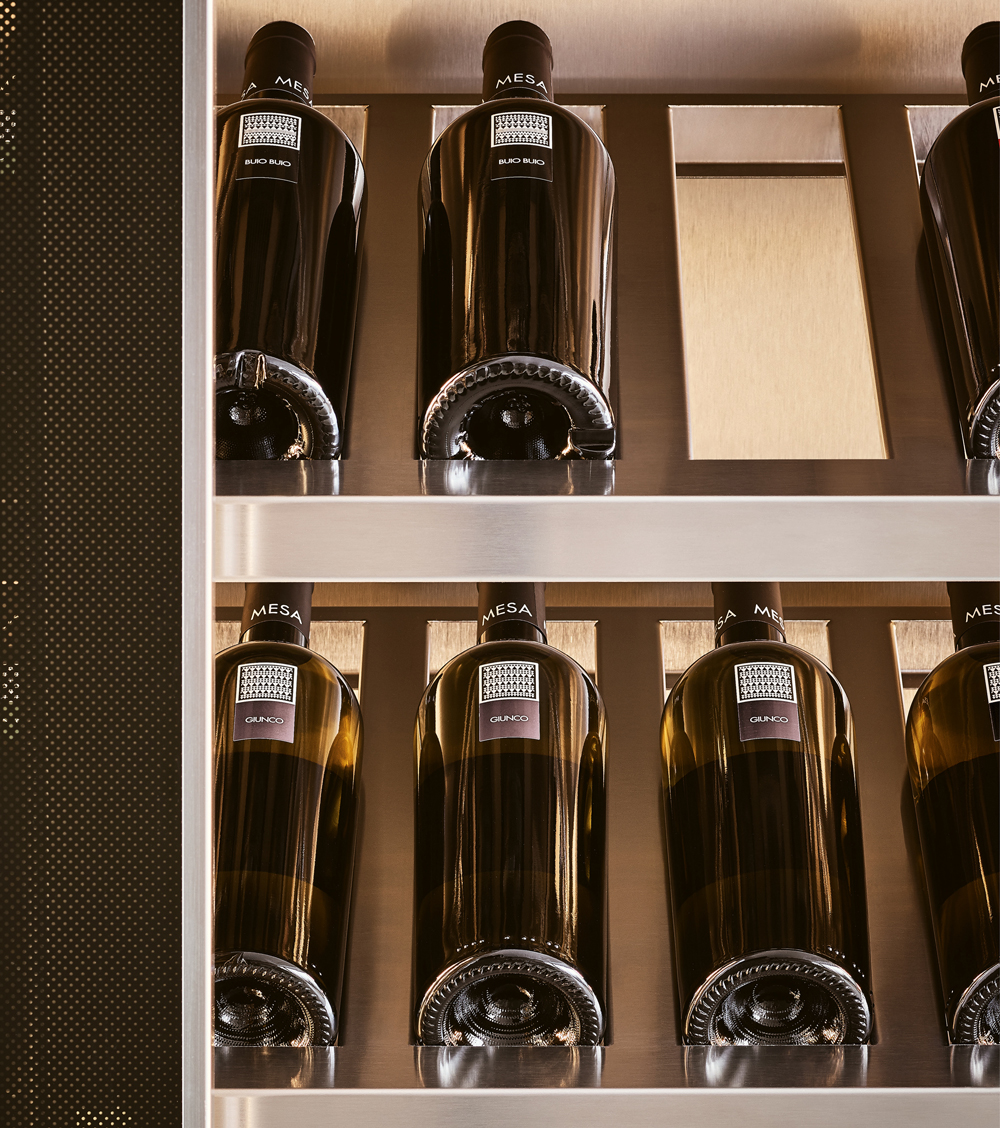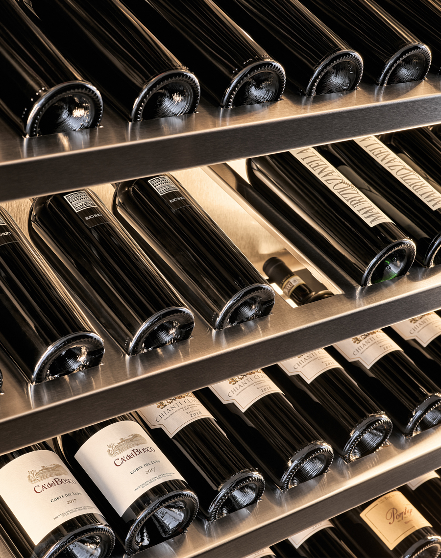 Vina: Wine storage with single/dual zones (12–18°C and 5–12°C), LED lighting, and sleek stainless interiors.