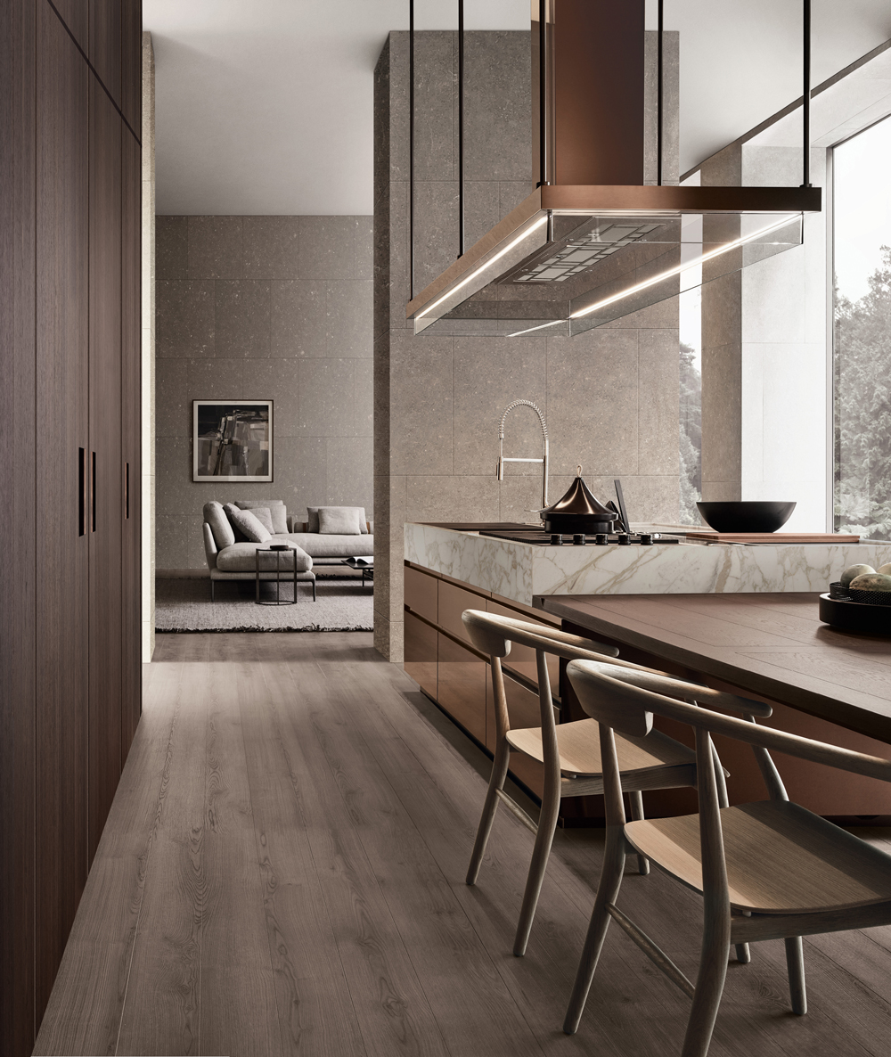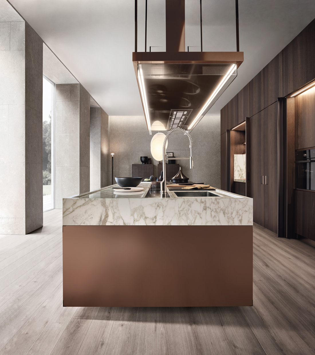 The Convivium Island Hood redefines functional design with its expansive format—available in 120 cm, 180 cm, and 240 cm widths. With finishes in stainless, vintage, and PVD steel, a refined glass border, 3000K LED lighting, and 900 m³/h of extraction power, it's ideal for statement kitchens with high air quality standards.