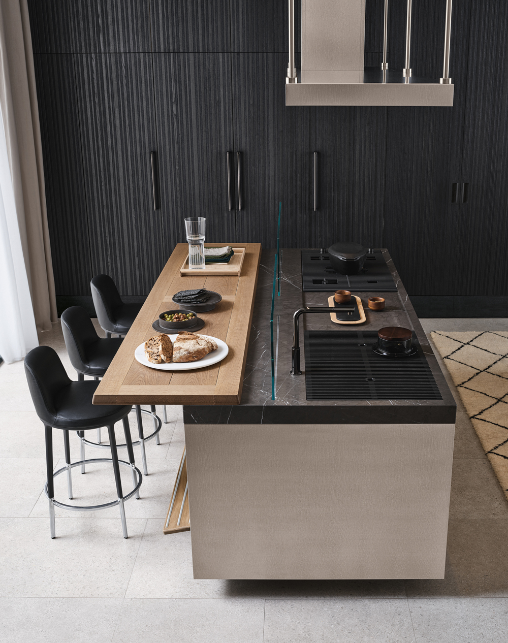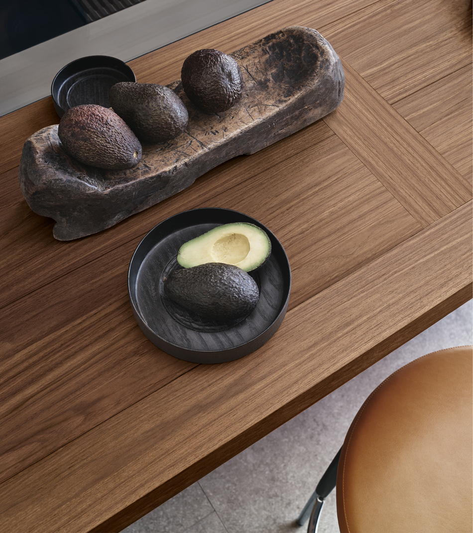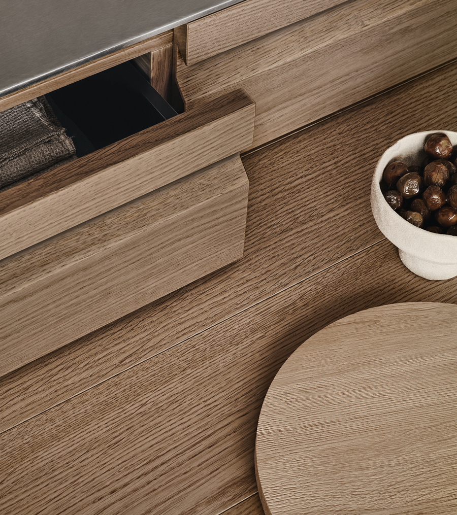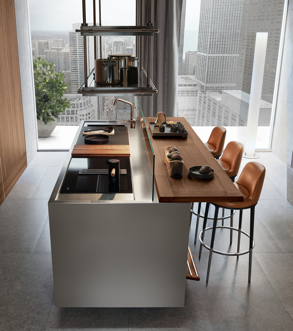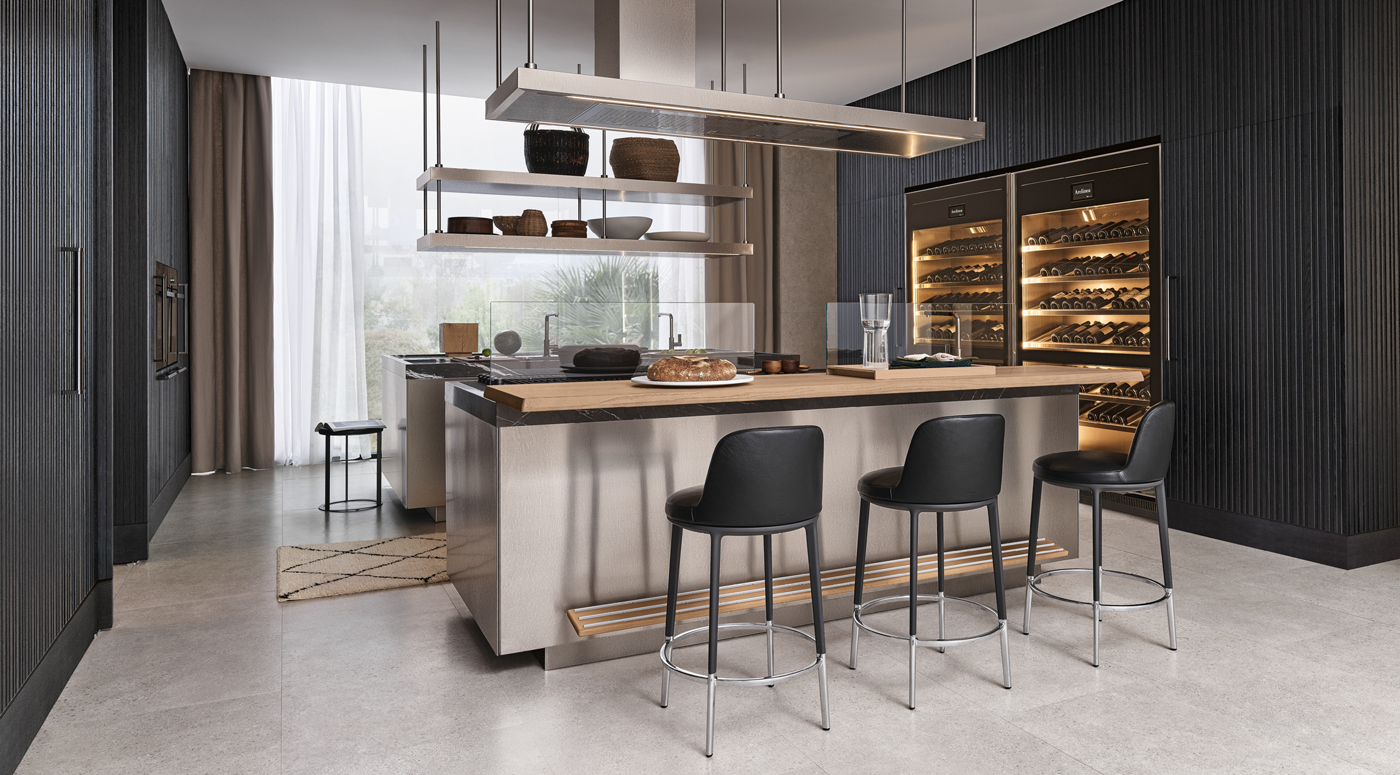Designed for flexibility, the Era Table and Snack Bar collection offers built-in wooden tables and counters that attach seamlessly to base units. With various configurations and premium finishes, these versatile surfaces create functional social hubs within island, peninsula, or linear kitchens.