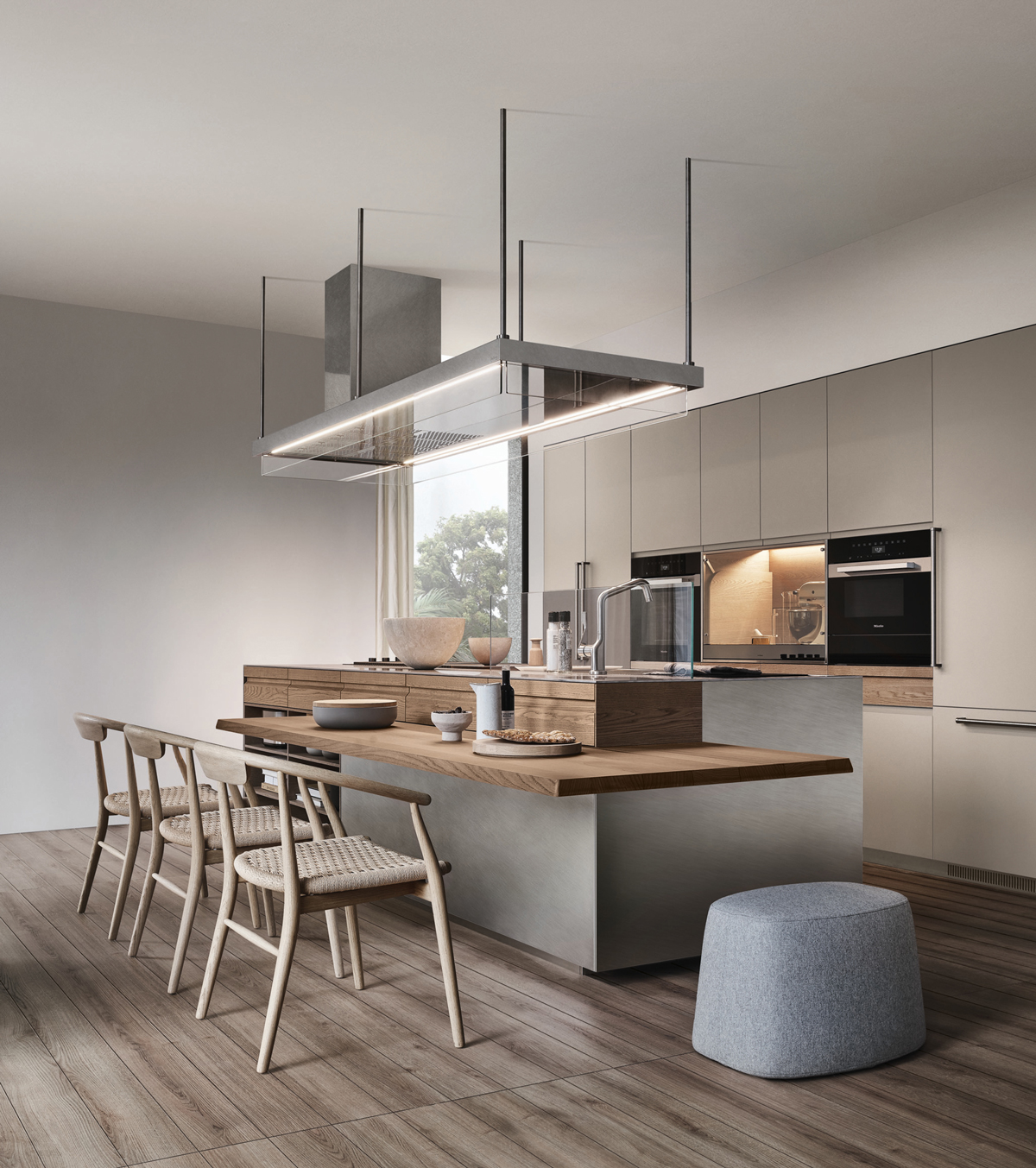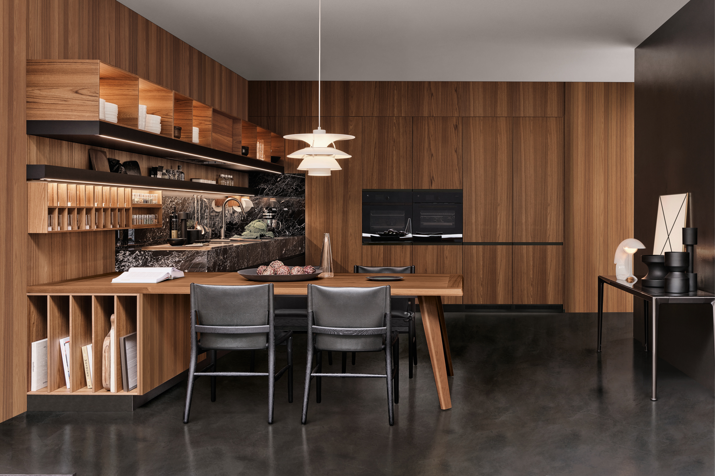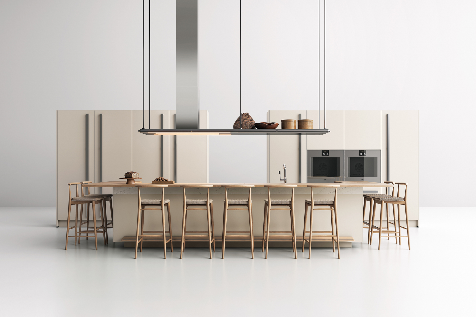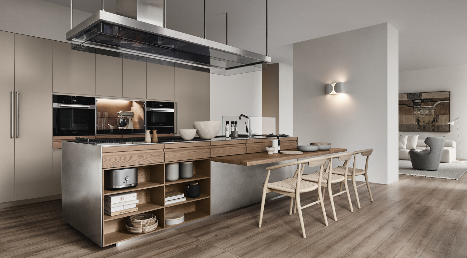 Designed for flexibility, the Era Table and Snack Bar collection offers built-in wooden tables and counters that attach seamlessly to base units. With various configurations and premium finishes, these versatile surfaces create functional social hubs within island, peninsula, or linear kitchens.