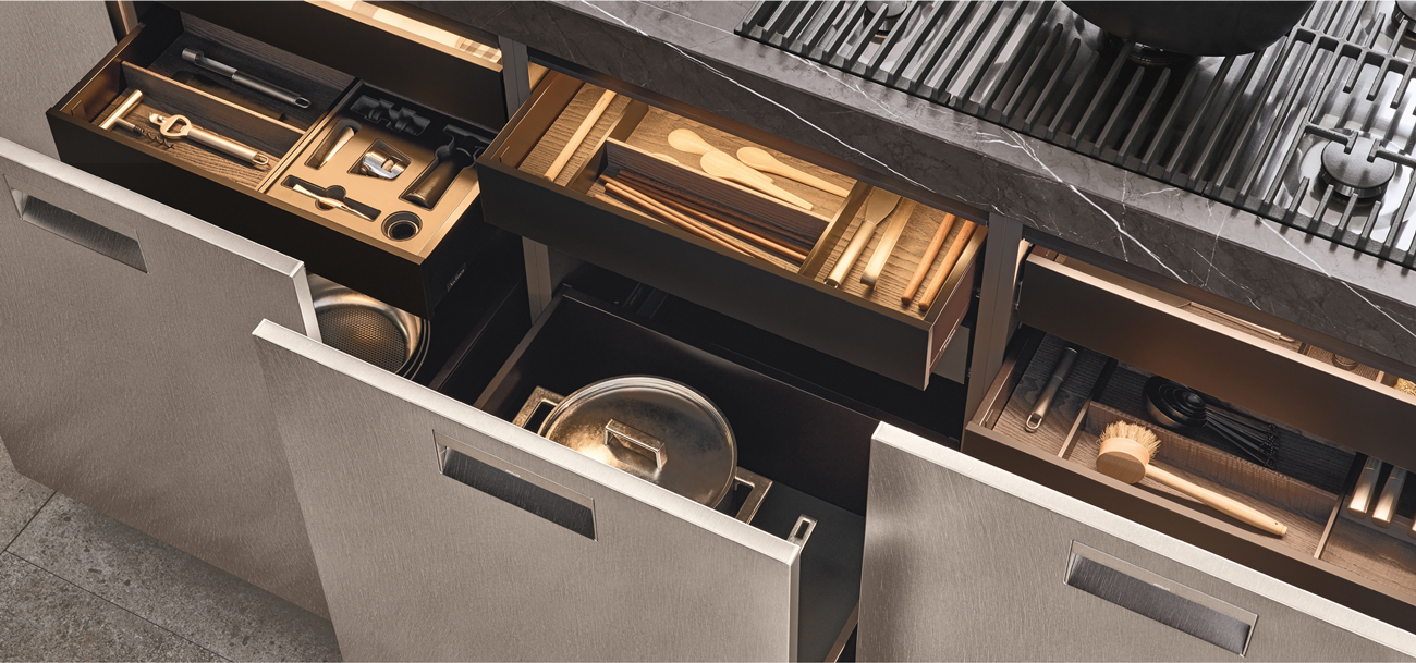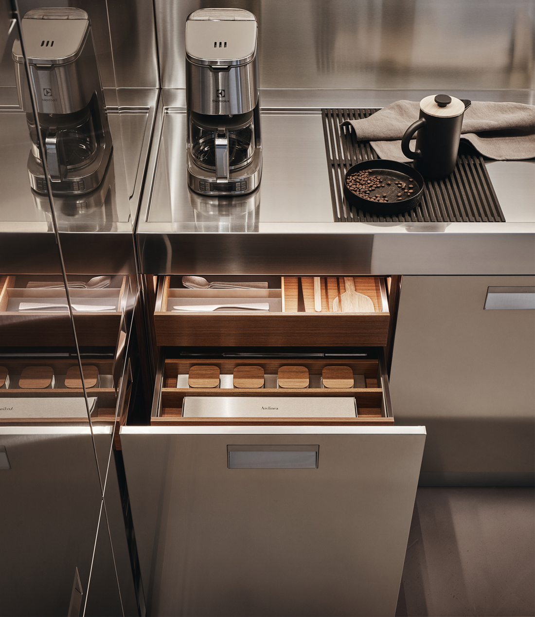The architect Antonio Citterio started his collaboration with Arclinea in 1986 and in 1988 The ITALIA kitchen was born, the first professional kitchen to be adapted for domestic use. Its generously sized steel worktops alongside spacious tall units for storage and appliances, separate washing and cleaning areas, a functional island and patented recessed handle door design. Perfect for home chefs who want to experience restaurant-style performance, this benchmark project for Arclinea, Italia embraces cutting-edge new finishes and the most up-to-date innovative and practical solutions.