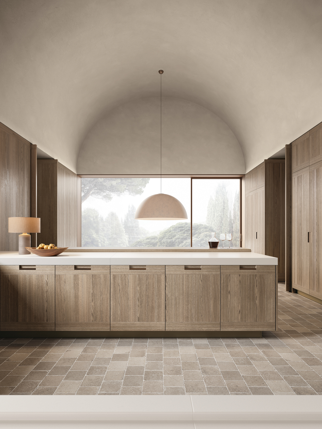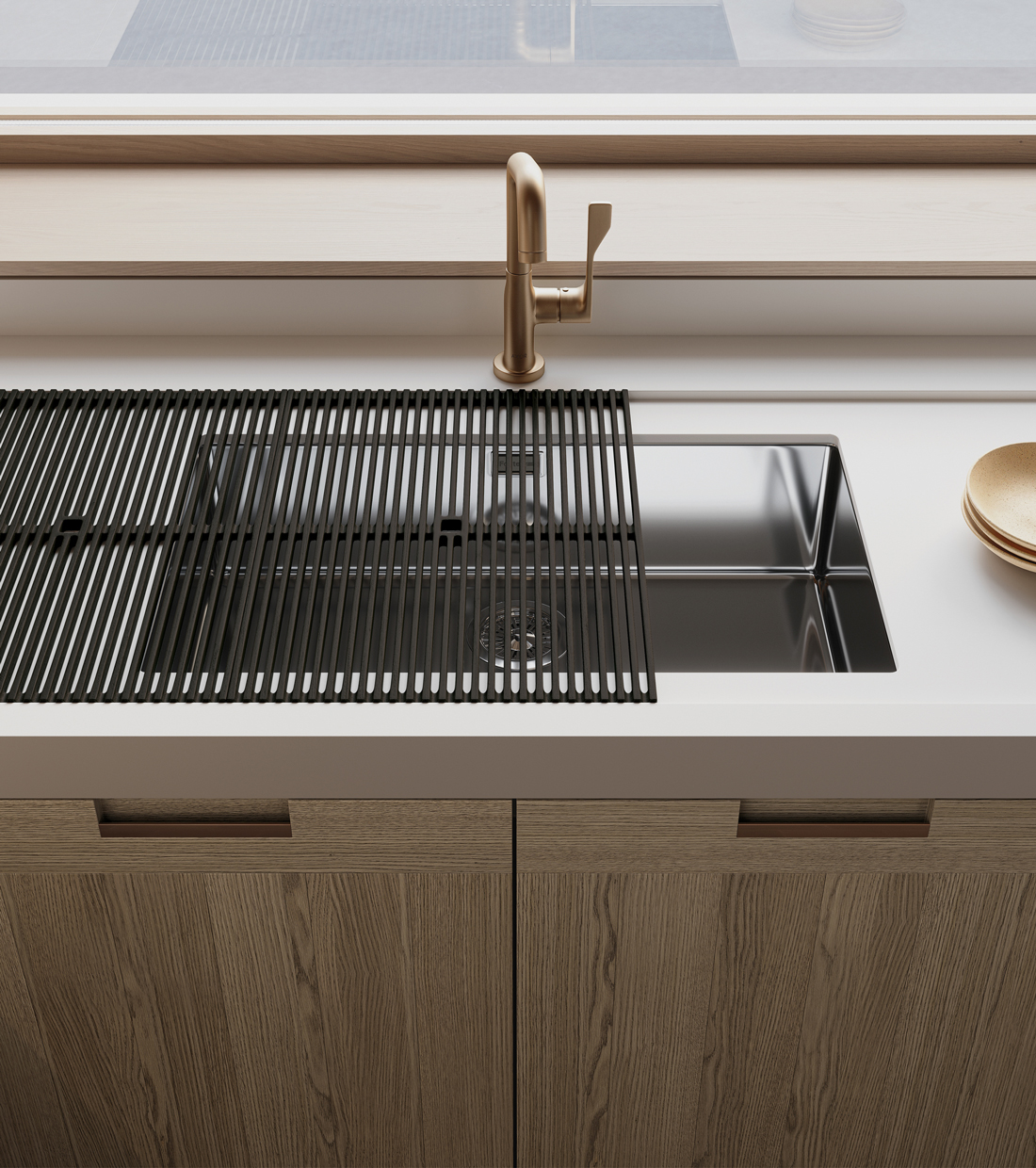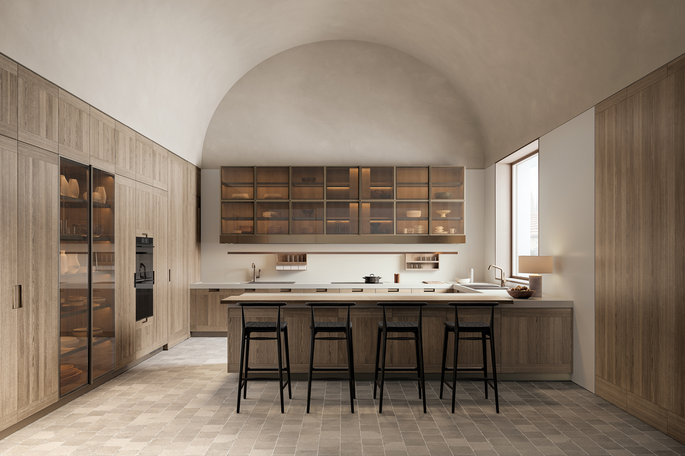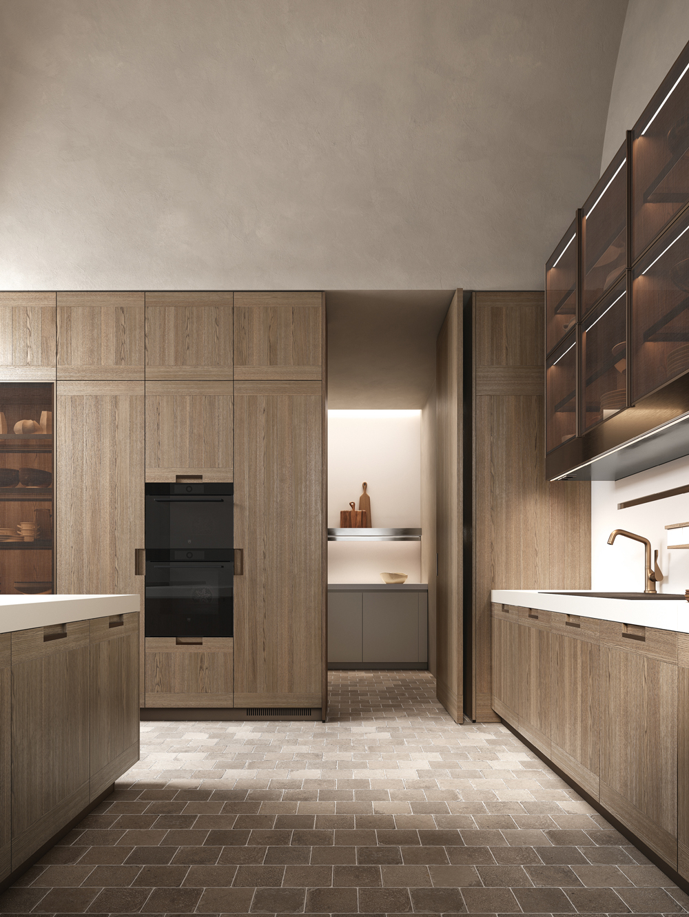 Eurocucina 2016 exhibits the new Arclinea concept kitchen by Antonio Citterio PRINCIPIA. PRINCIPIA teams a grained wood in a “rough” finish with stainless steel in the innovative colours generated with the PVD (Physical Vapour Deposition) technological process. Natural materials, innovative production and artisan detailing combine and the resulting new units, freestanding dressers and dedicated storage units are then developed internally to become true work zones.