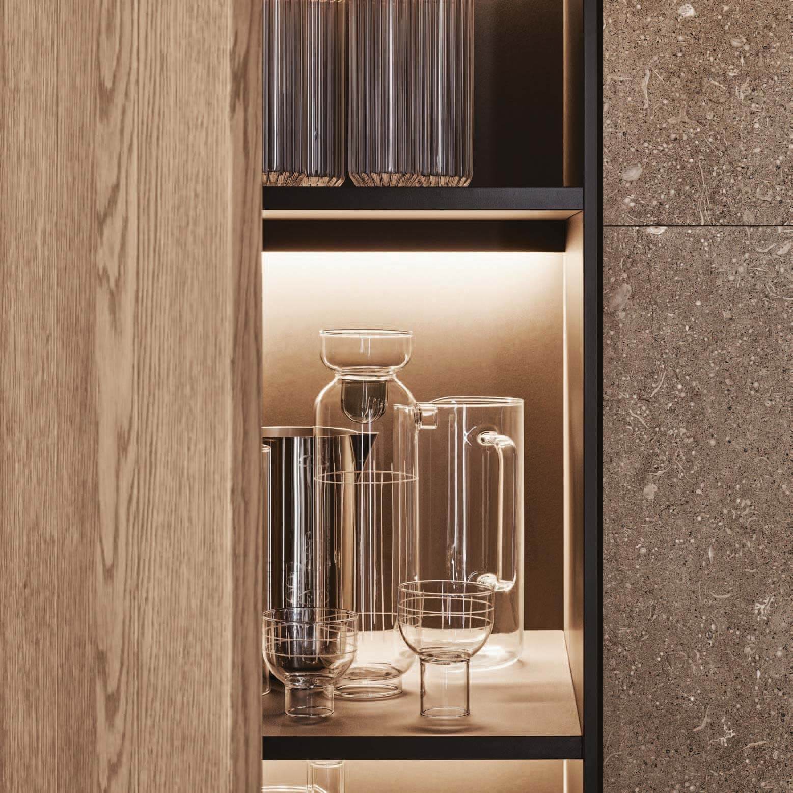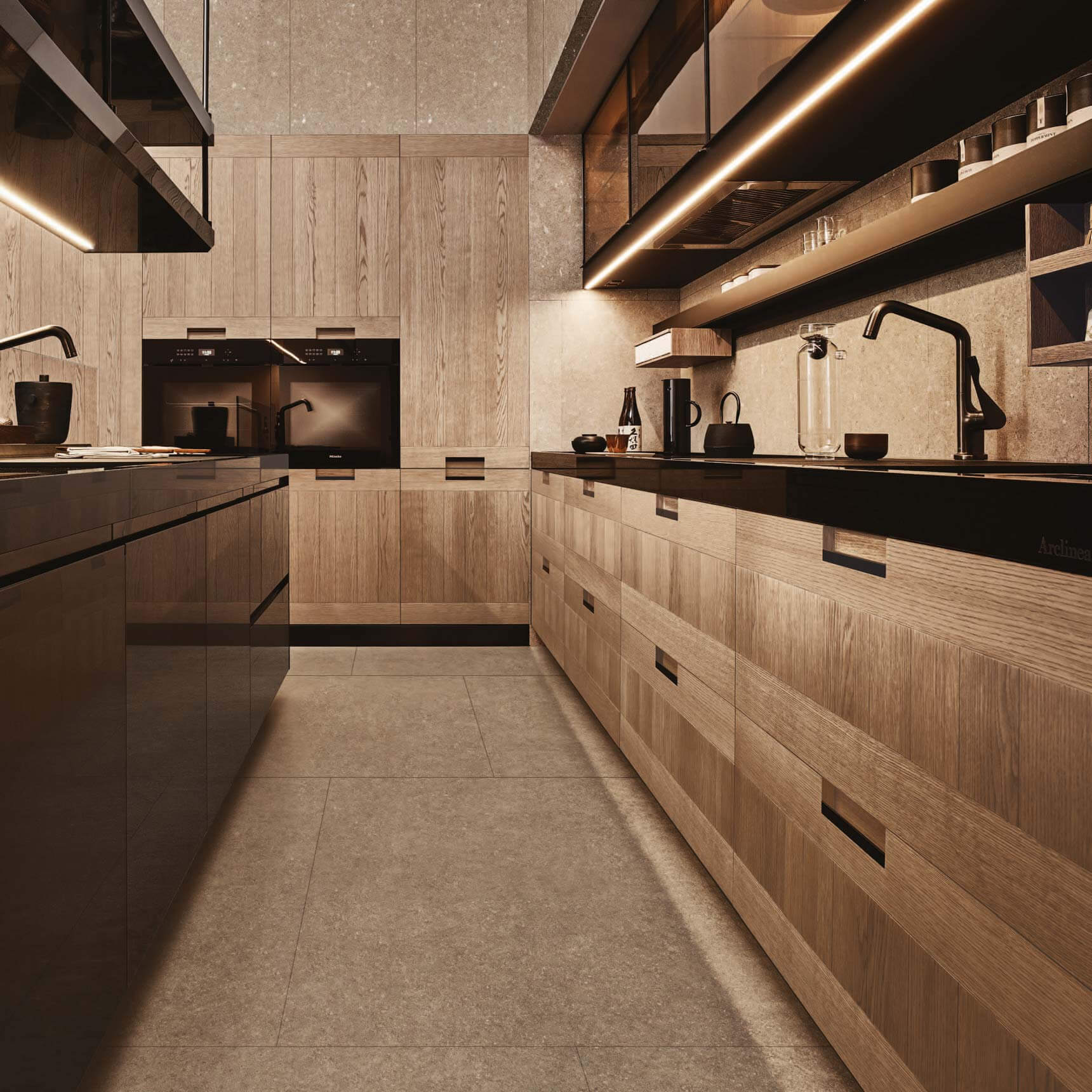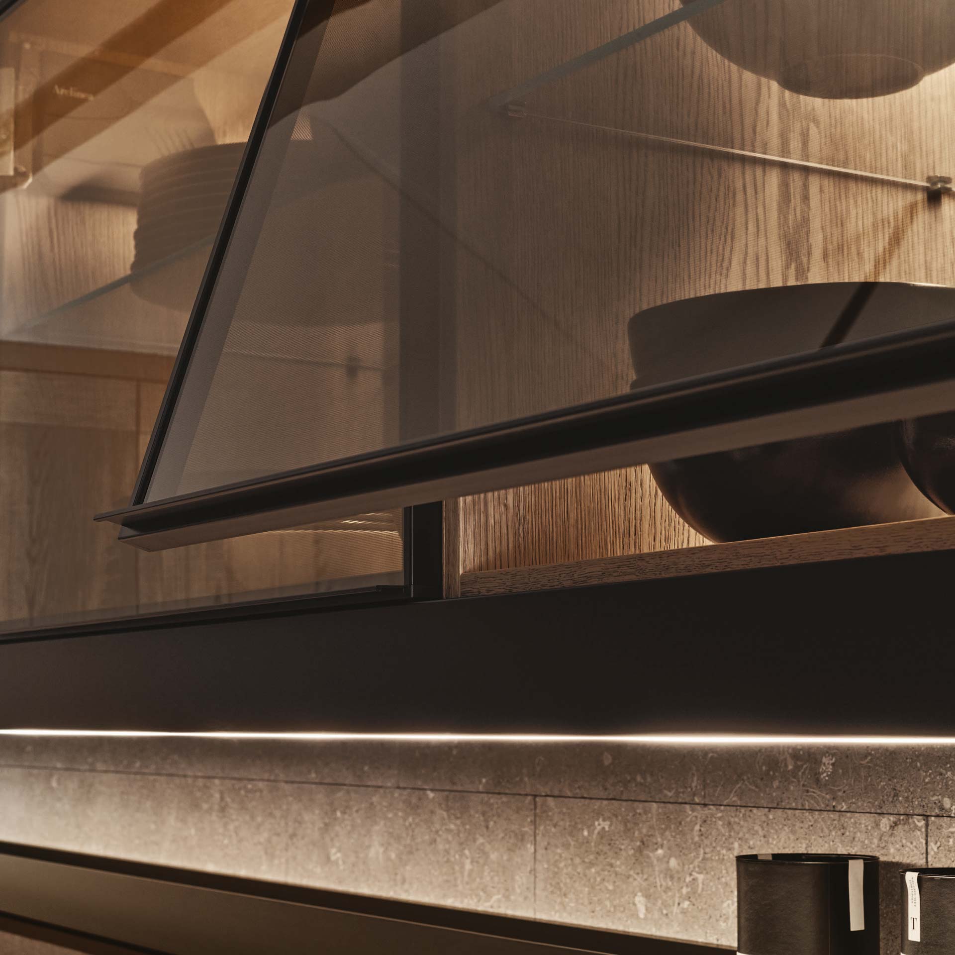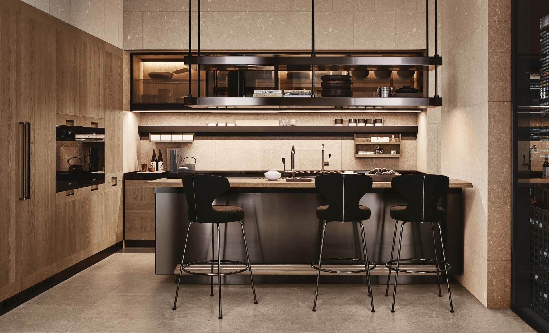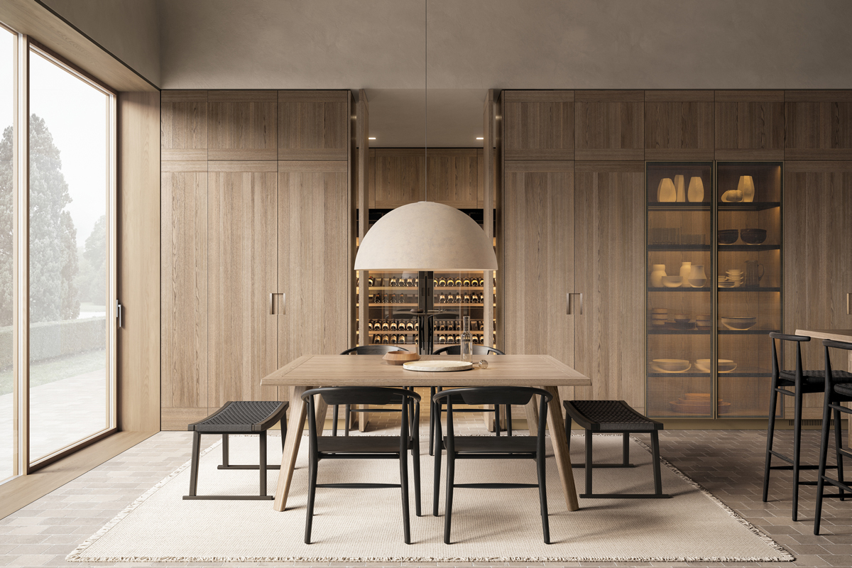 Eurocucina 2016 exhibits the new Arclinea concept kitchen by Antonio Citterio PRINCIPIA. PRINCIPIA teams a grained wood in a “rough” finish with stainless steel in the innovative colours generated with the PVD (Physical Vapour Deposition) technological process. Natural materials, innovative production and artisan detailing combine and the resulting new units, freestanding dressers and dedicated storage units are then developed internally to become true work zones.