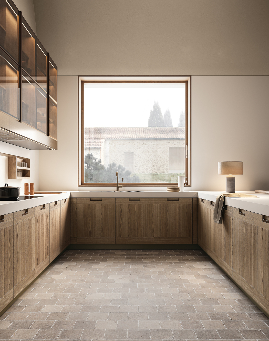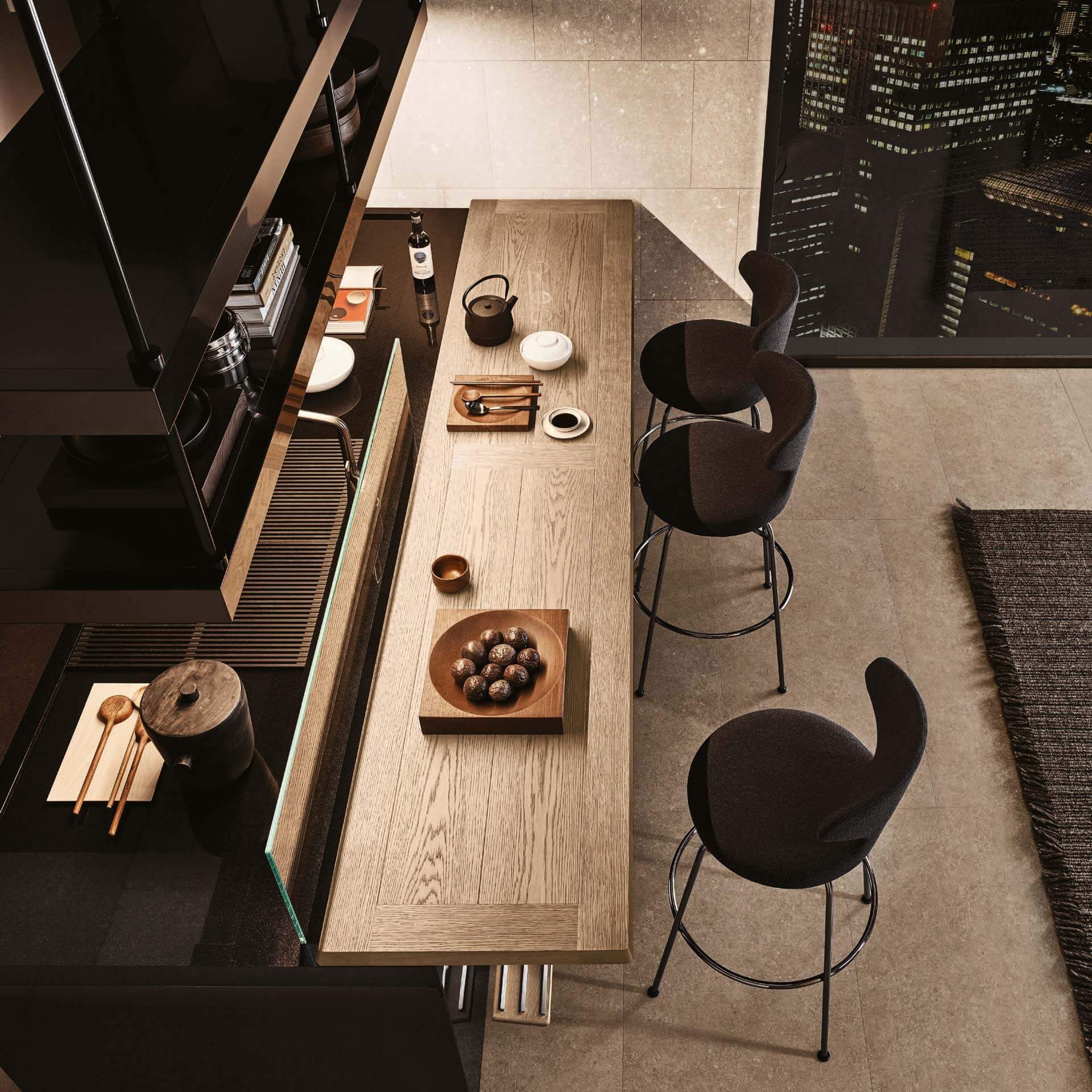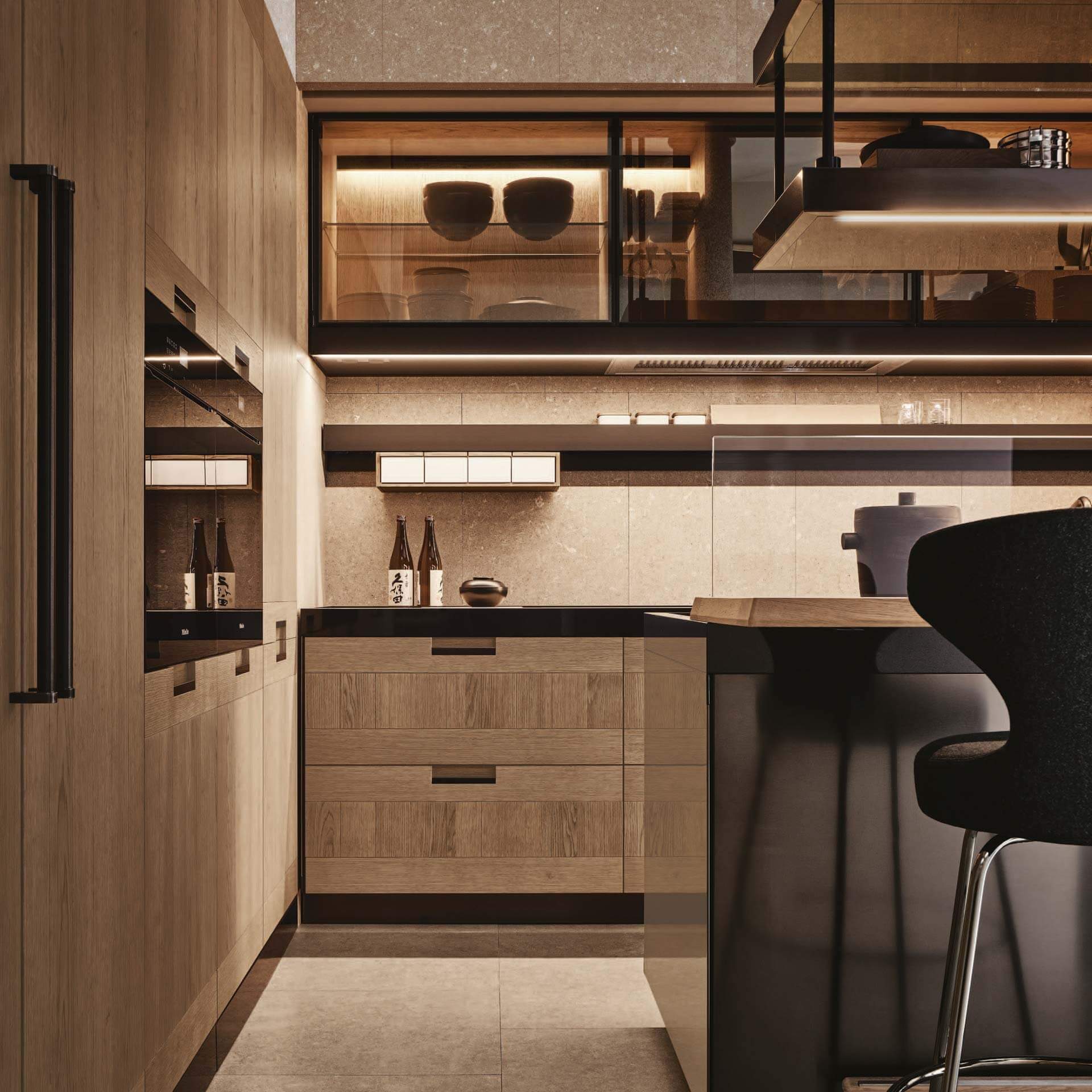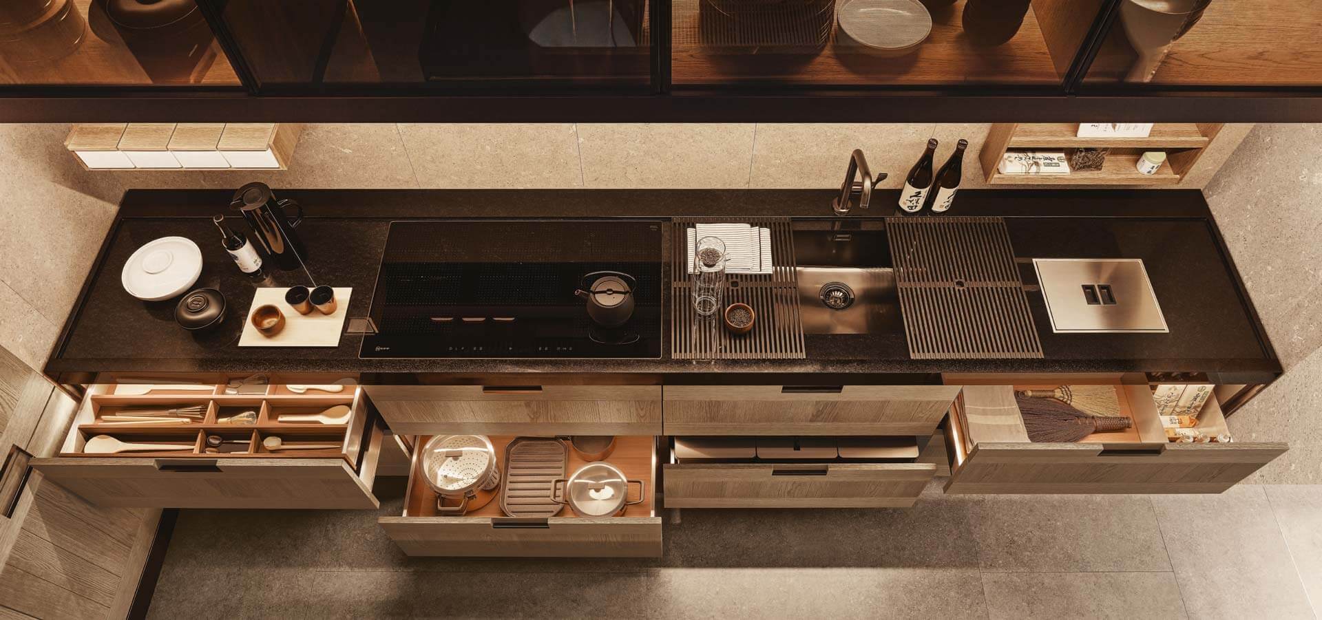 Eurocucina 2016 exhibits the new Arclinea concept kitchen by Antonio Citterio PRINCIPIA. PRINCIPIA teams a grained wood in a “rough” finish with stainless steel in the innovative colours generated with the PVD (Physical Vapour Deposition) technological process. Natural materials, innovative production and artisan detailing combine and the resulting new units, freestanding dressers and dedicated storage units are then developed internally to become true work zones.