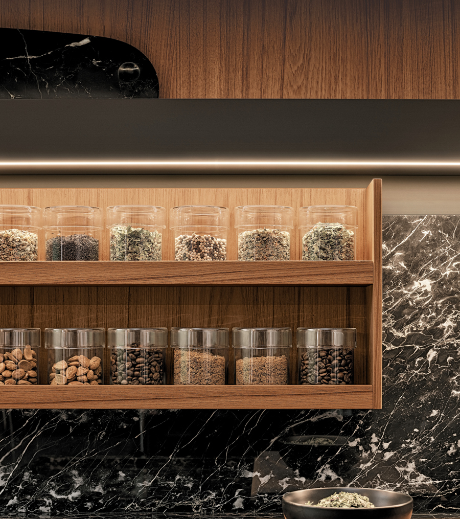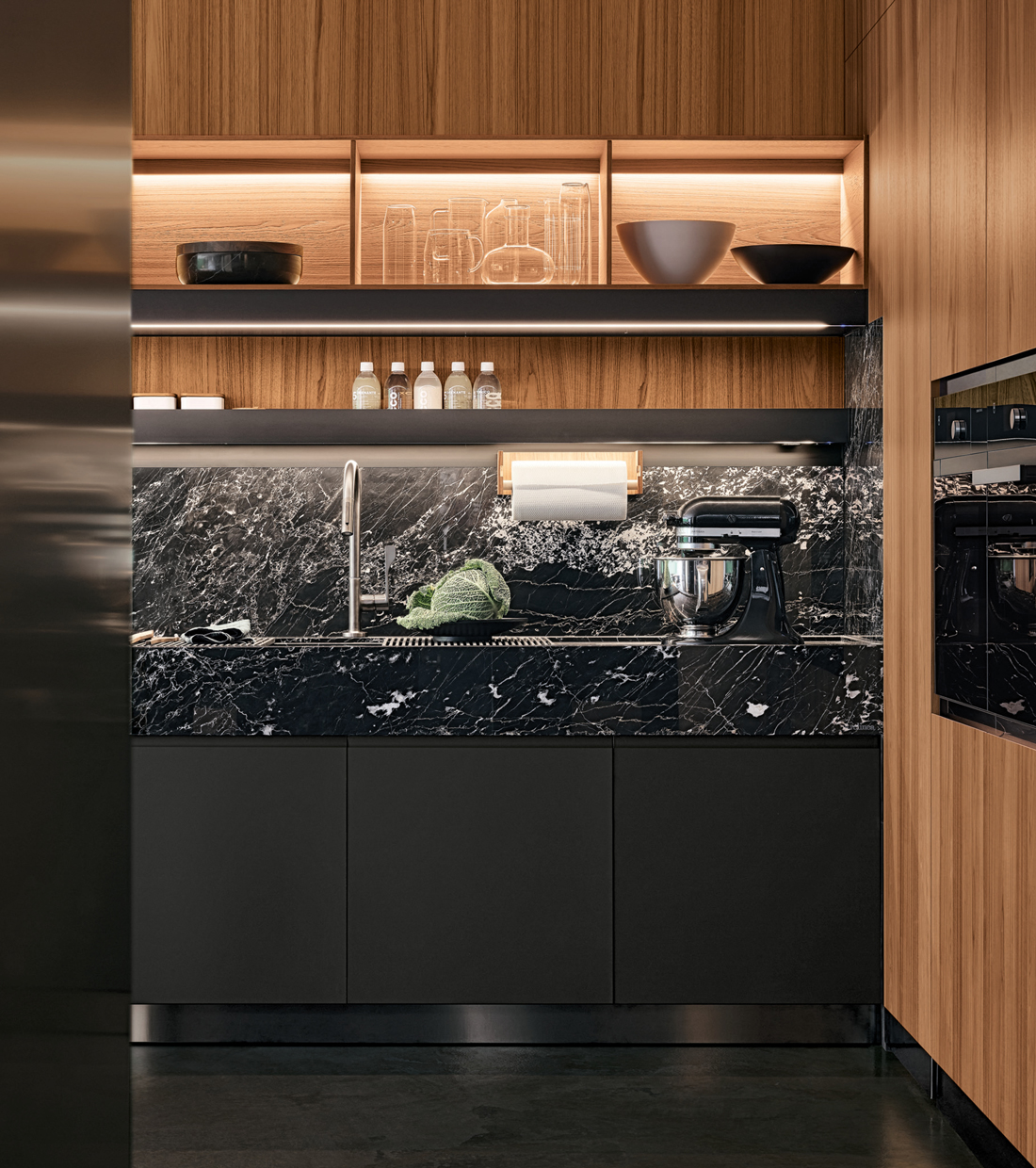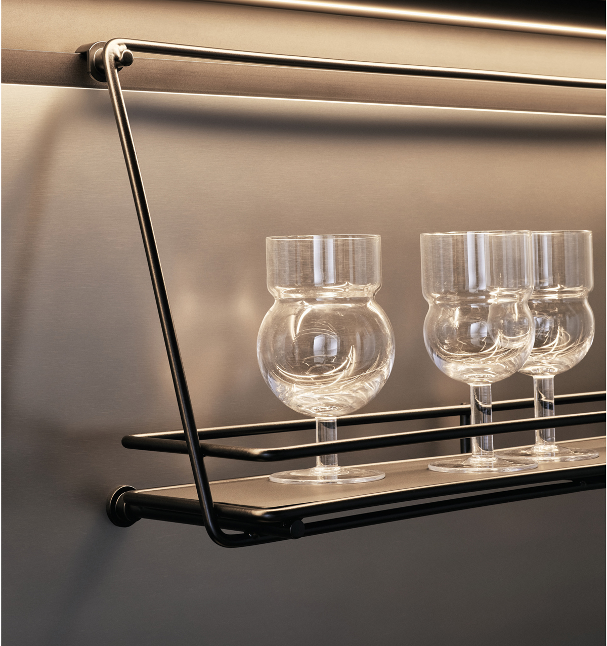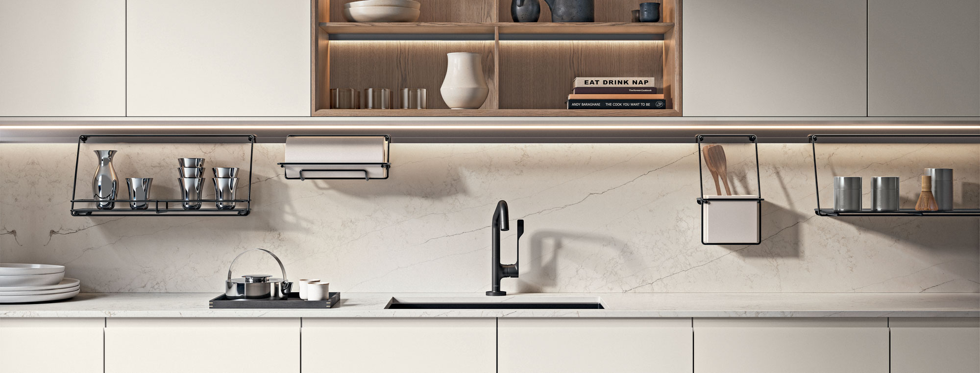 The Accessory Rails Collection—including the 7.8 cm Accessory Rail and Thea Rail—enhances the space between base and wall units. Made in aluminum with stainless or black anodised finish, these customizable rails can integrate sockets, ceramic inserts, and LED lighting.