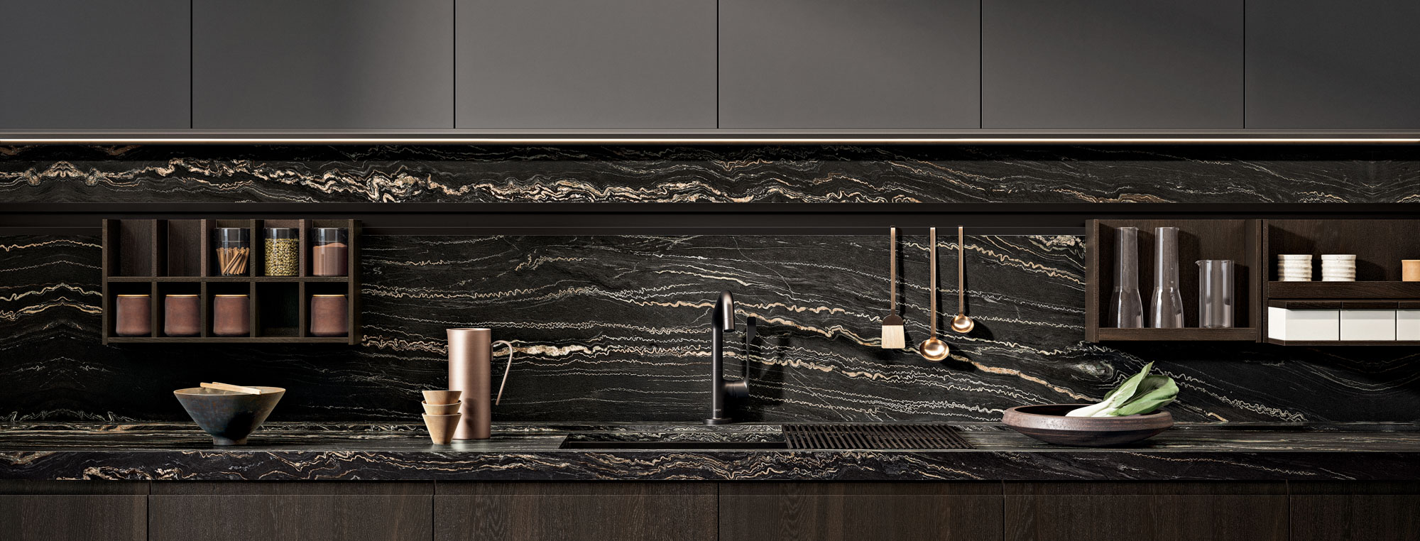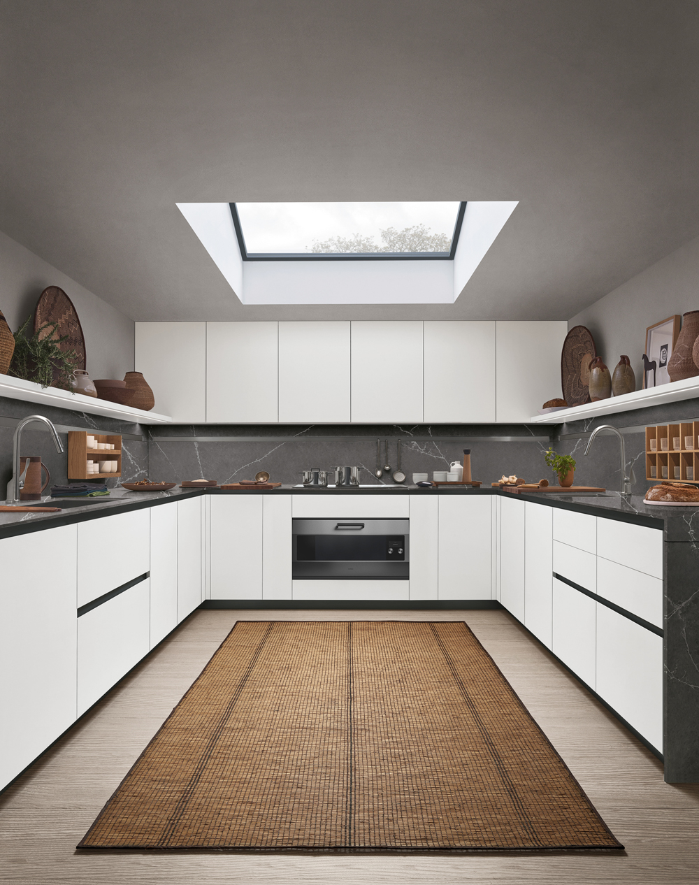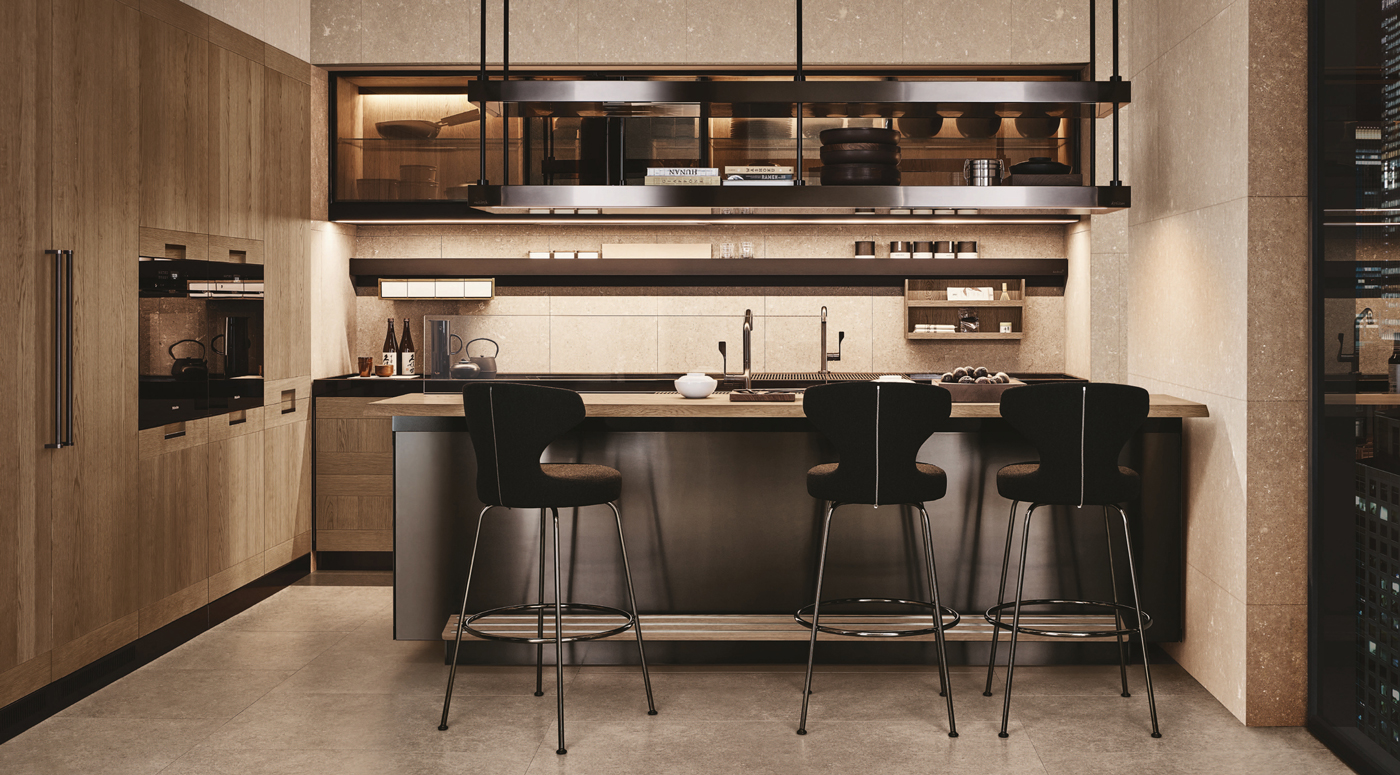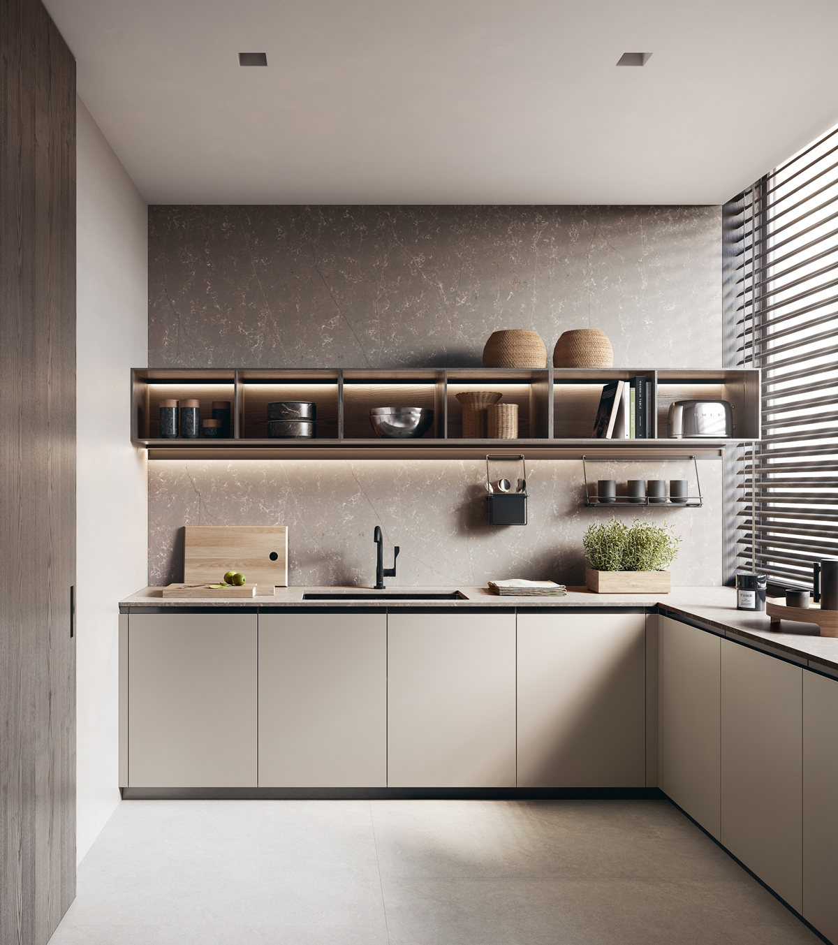 The Accessory Rails Collection—including the 7.8 cm Accessory Rail and Thea Rail—enhances the space between base and wall units. Made in aluminum with stainless or black anodised finish, these customizable rails can integrate sockets, ceramic inserts, and LED lighting.