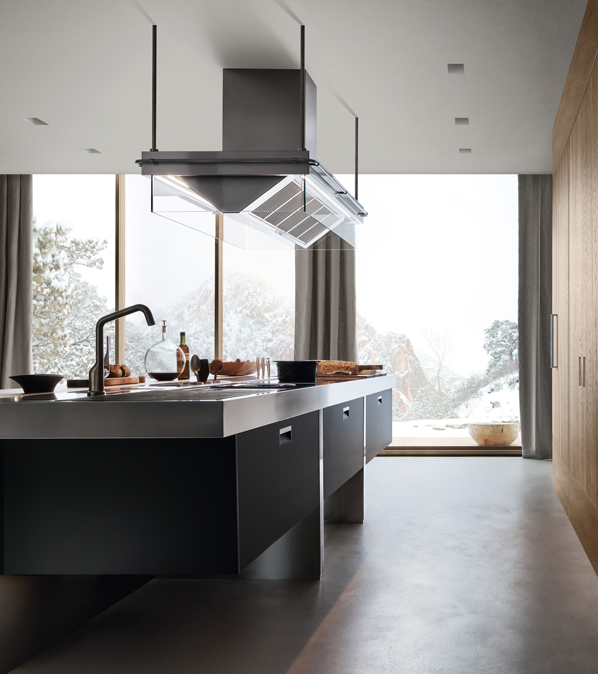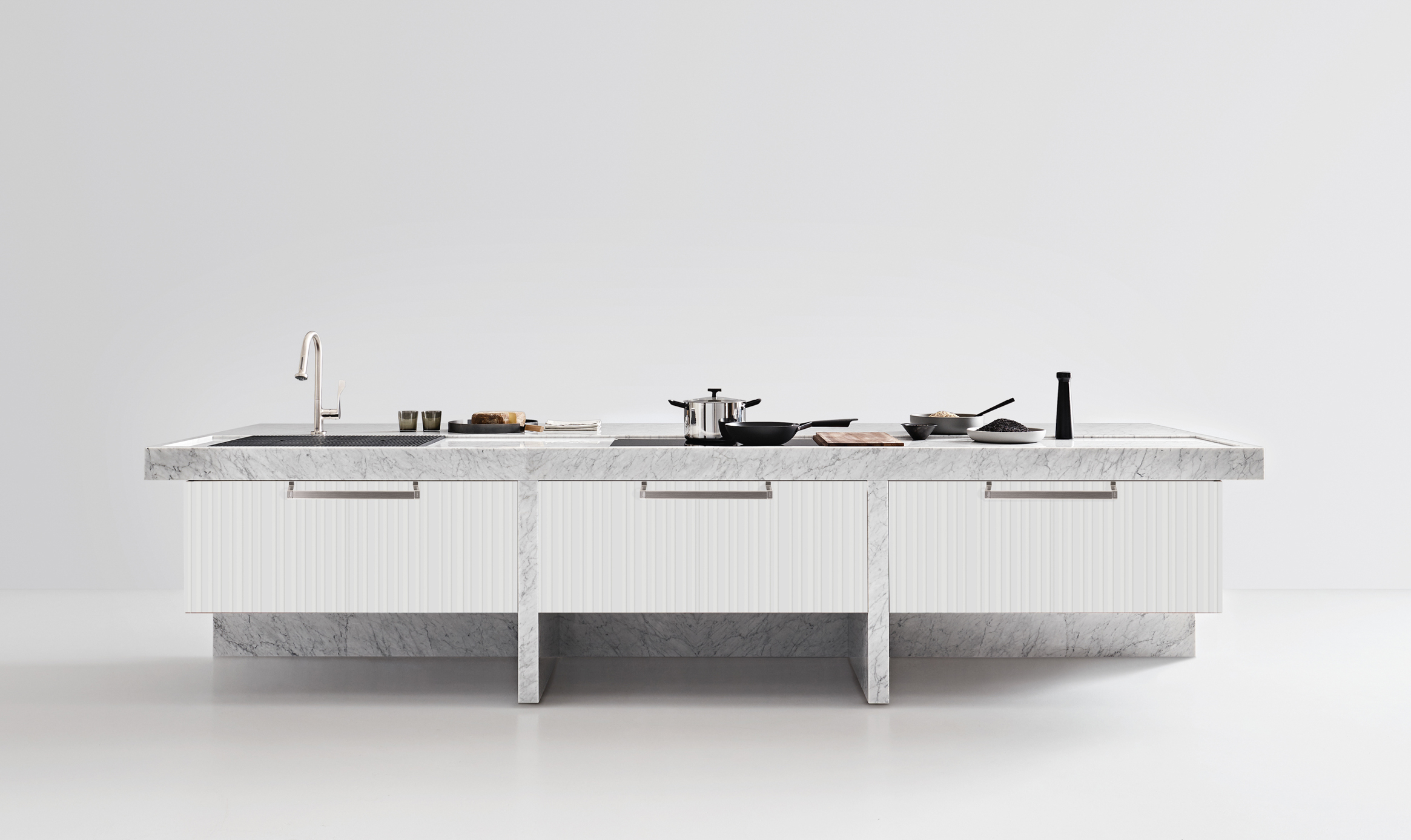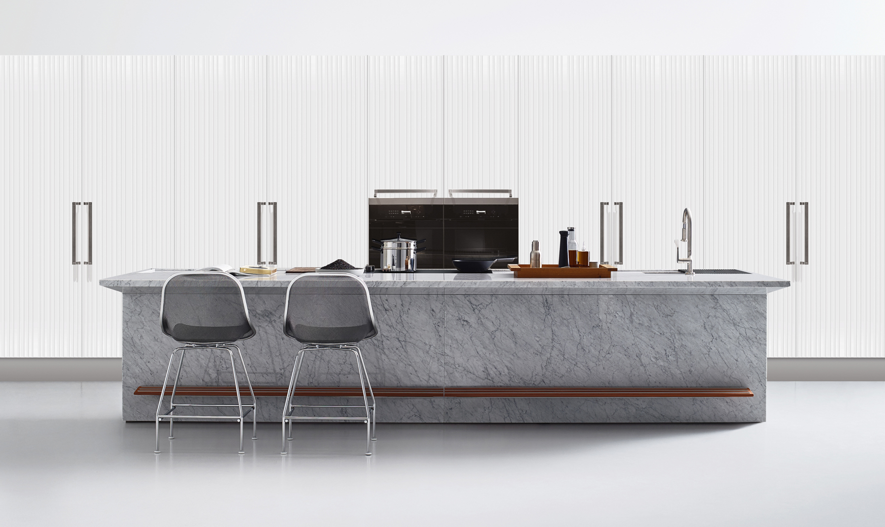 The Lapis Island is a multifunctional cooking and hosting station. It features premium worktops, integrated sinks, cooktops, and suspended base cabinets. Matching slatted wall panels extend functionality and visual cohesion into adjoining spaces.