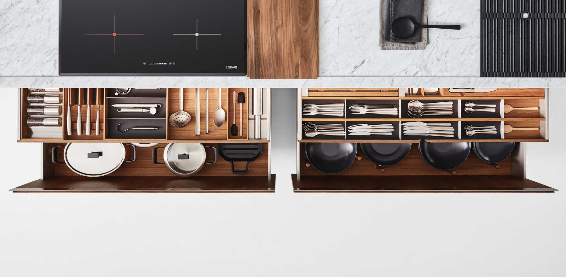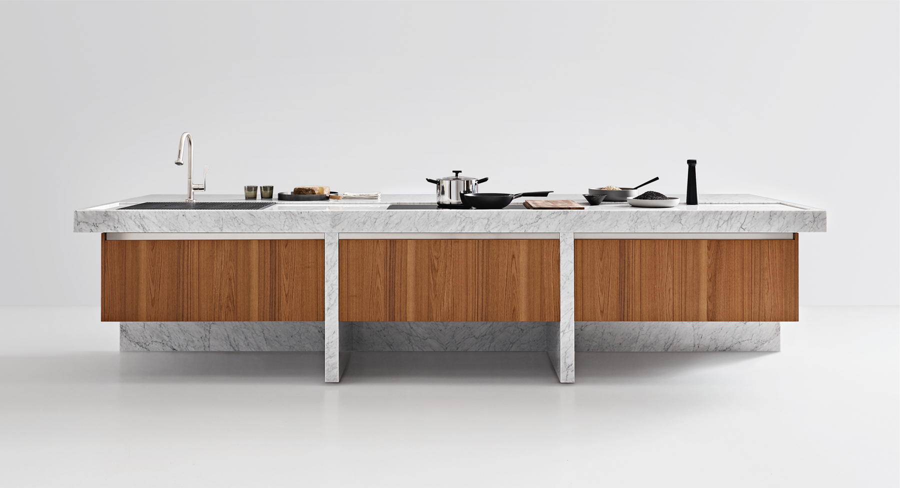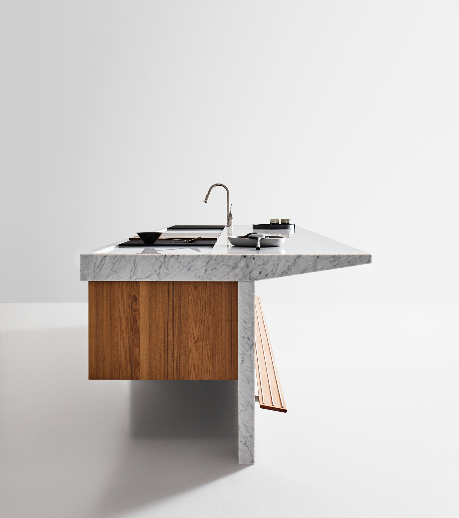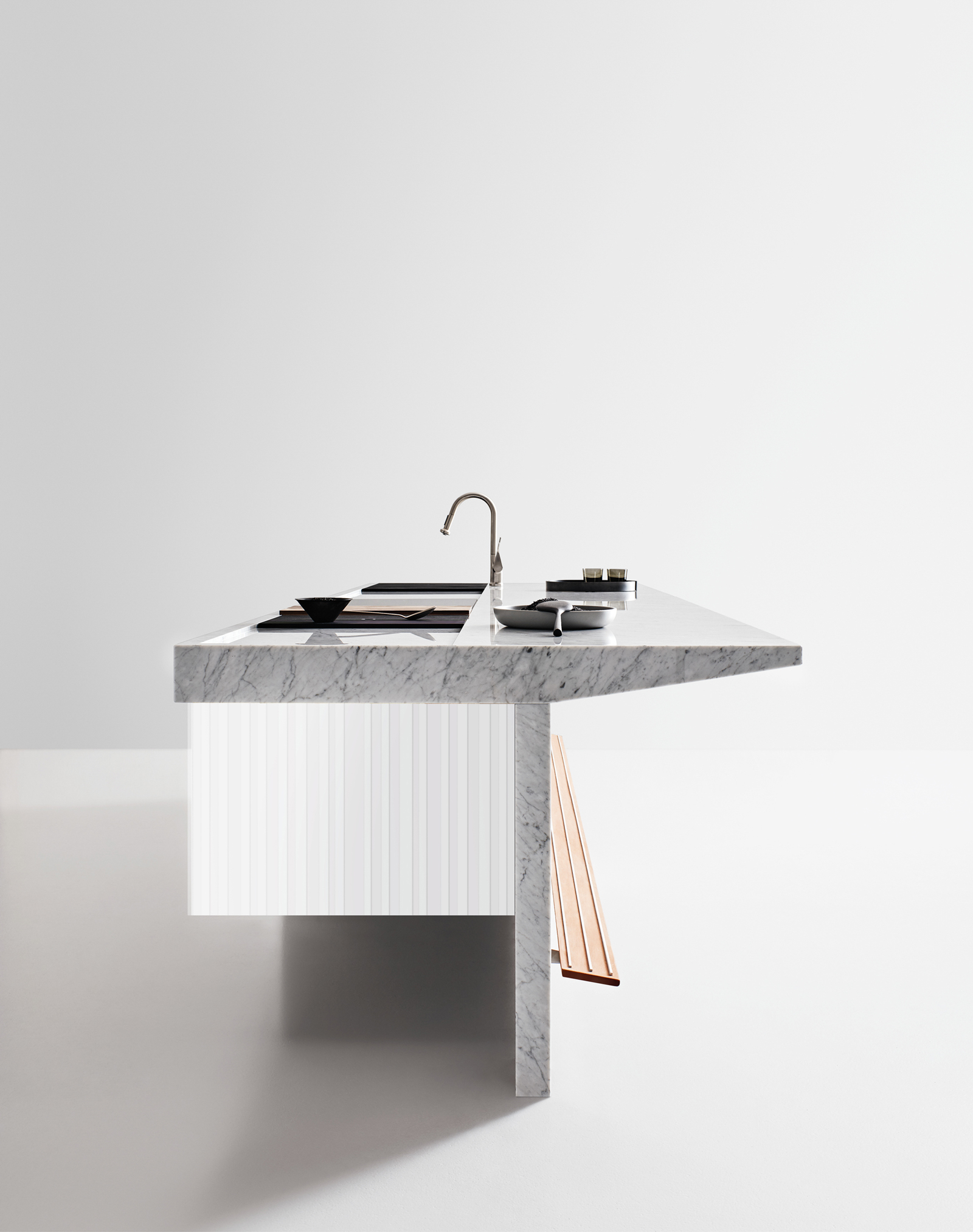 The Lapis Island is a multifunctional cooking and hosting station. It features premium worktops, integrated sinks, cooktops, and suspended base cabinets. Matching slatted wall panels extend functionality and visual cohesion into adjoining spaces.