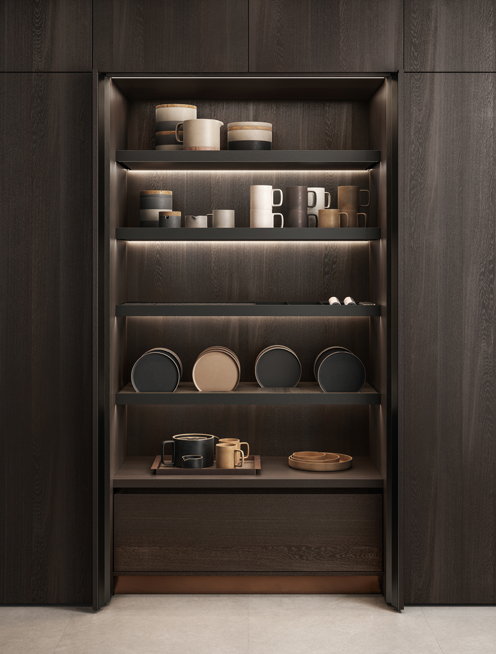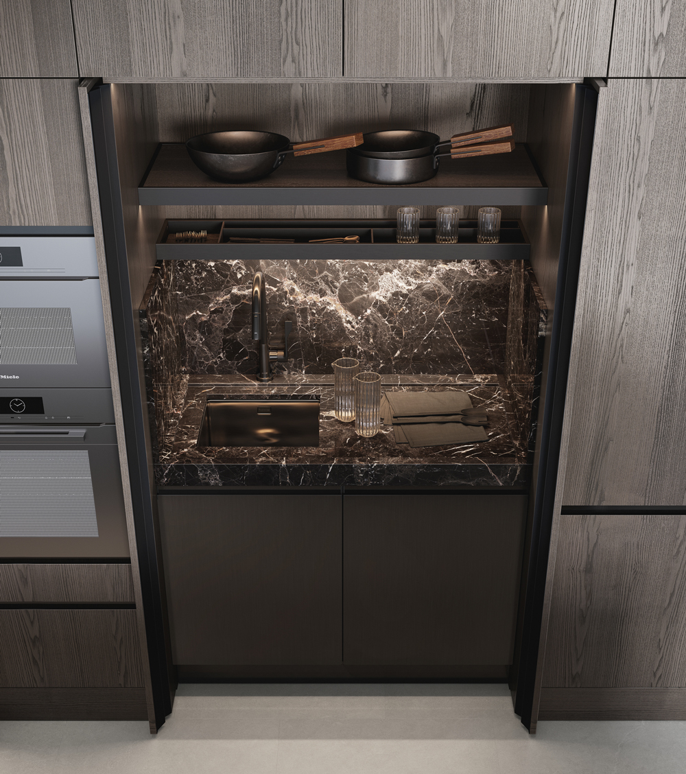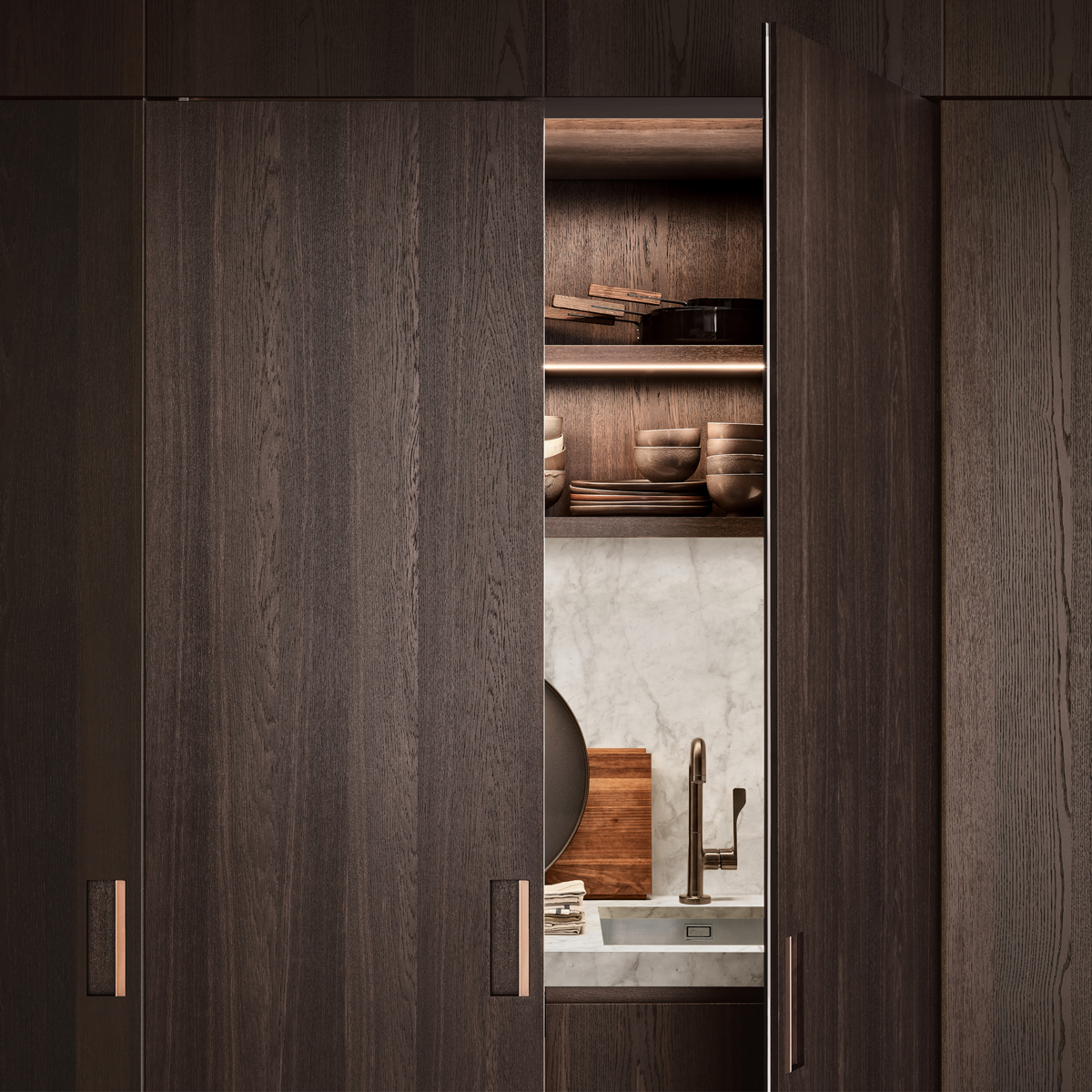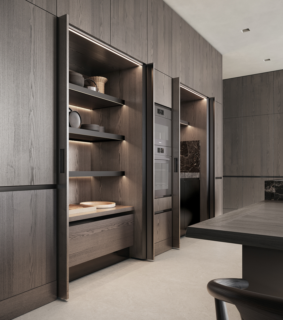 The Pocket Door Systems are designed to hide and reveal workspaces. Ideal for modular kitchens, the doors slide away for full access and close to create a clean finish. Customizable in function and finish.