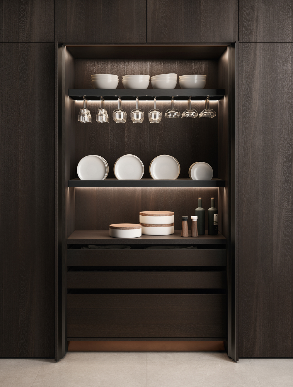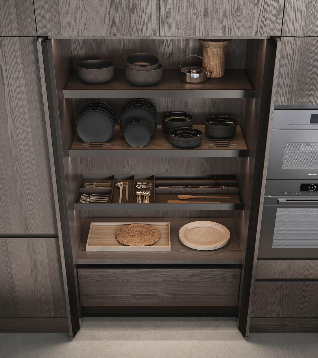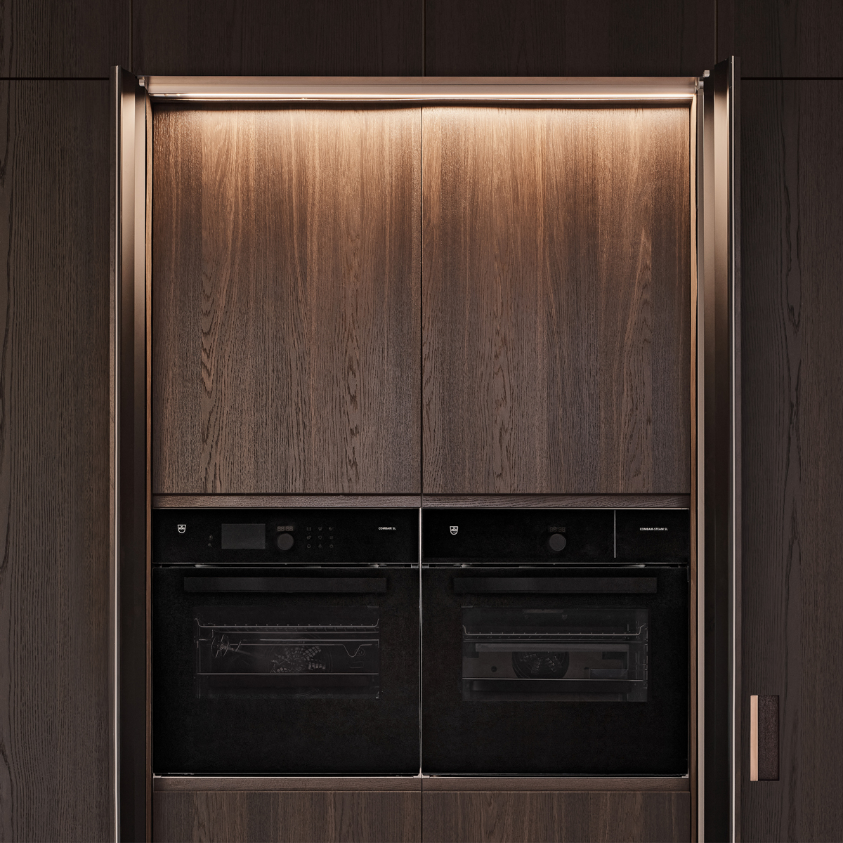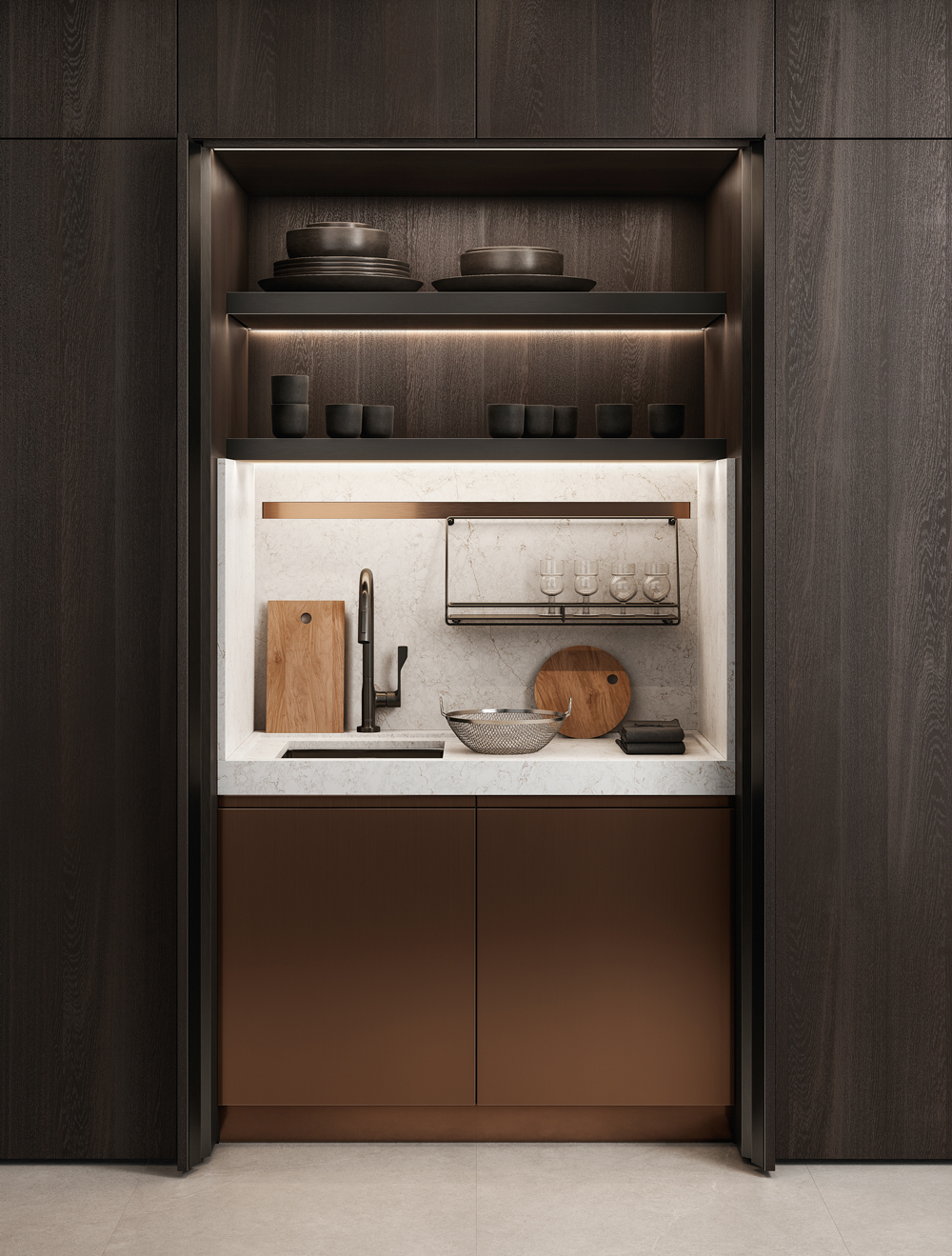 The Pocket Door Systems are designed to hide and reveal workspaces. Ideal for modular kitchens, the doors slide away for full access and close to create a clean finish. Customizable in function and finish.
