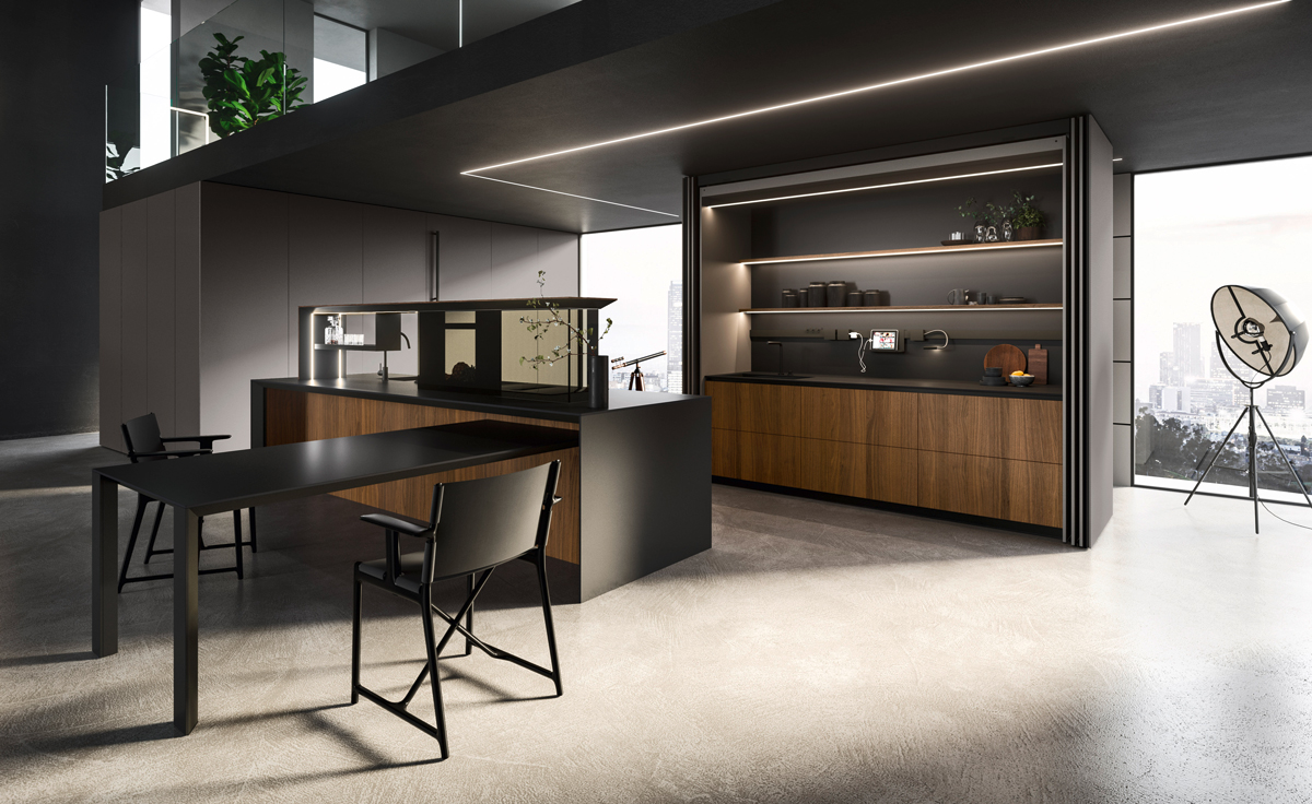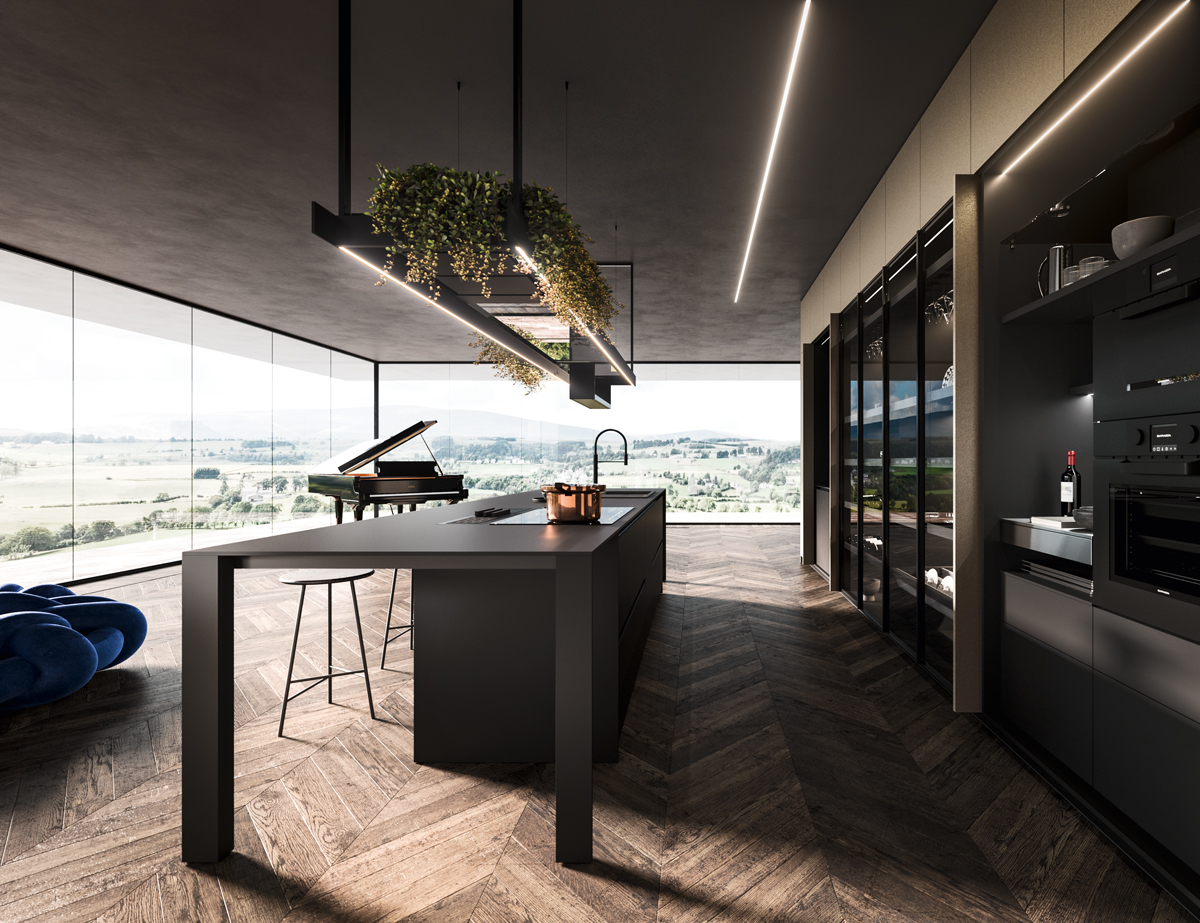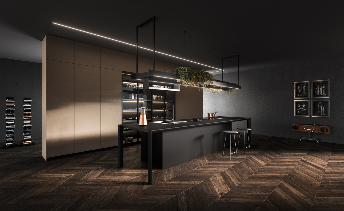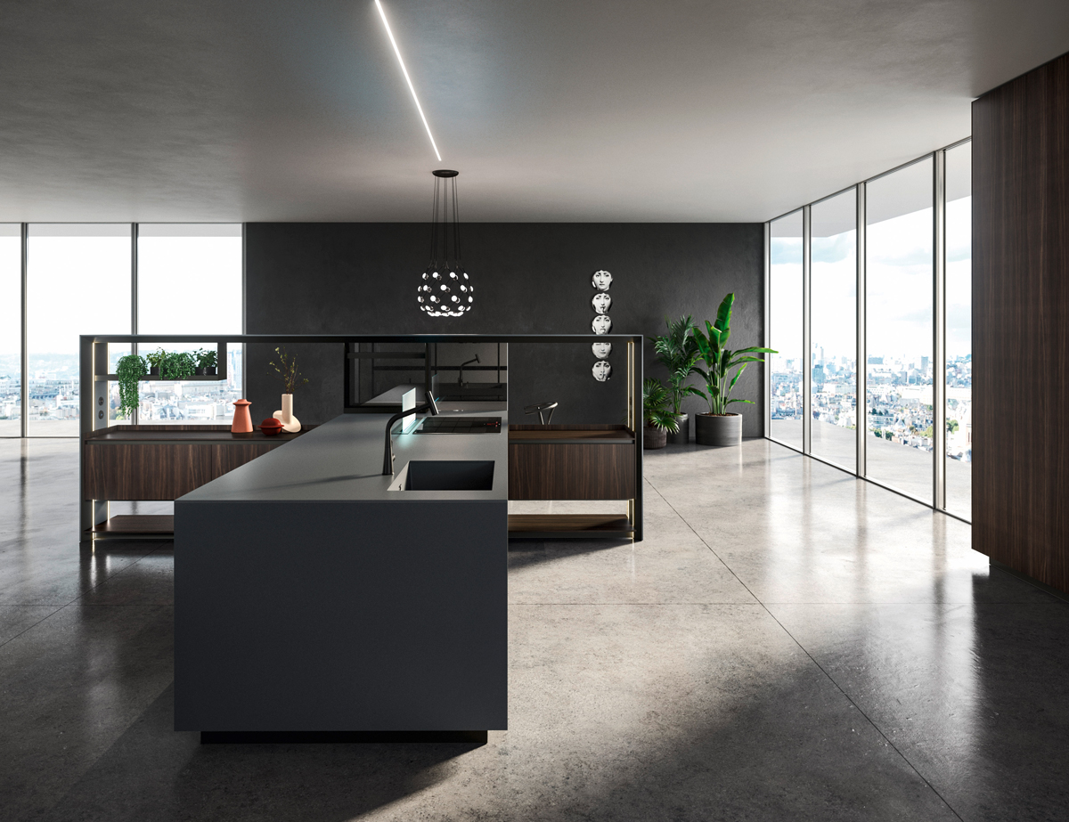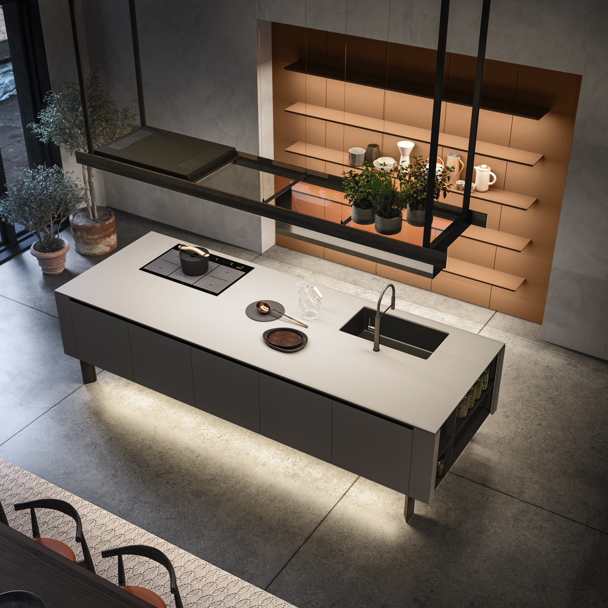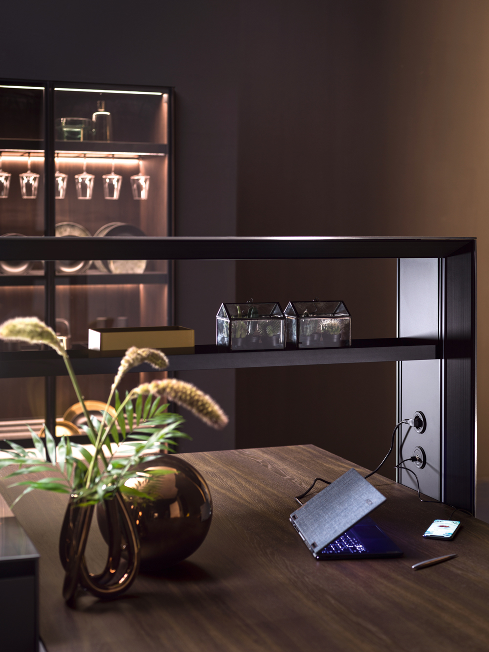 Alu_Project is the defining feature of the collection, characterised by its sleek black anodised aluminium profile. Serving as both structure and connector, it integrates effortlessly across suspended units, tables, workstations, and partitions. Its versatility enables limitless design configurations, bringing visual coherence and a bold architectural identity to every space.