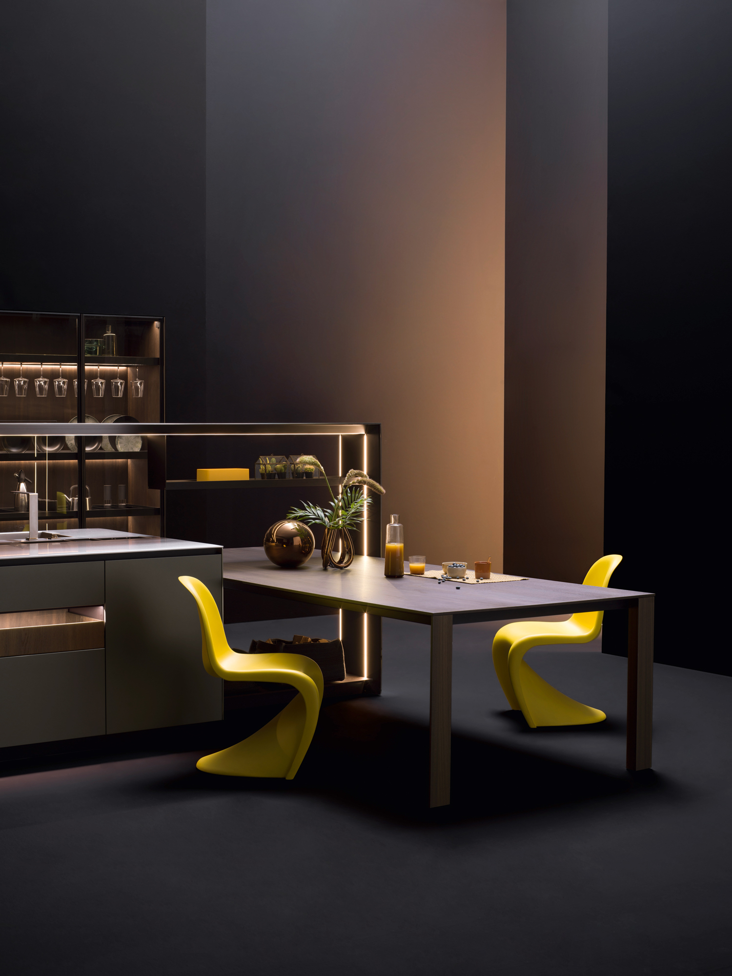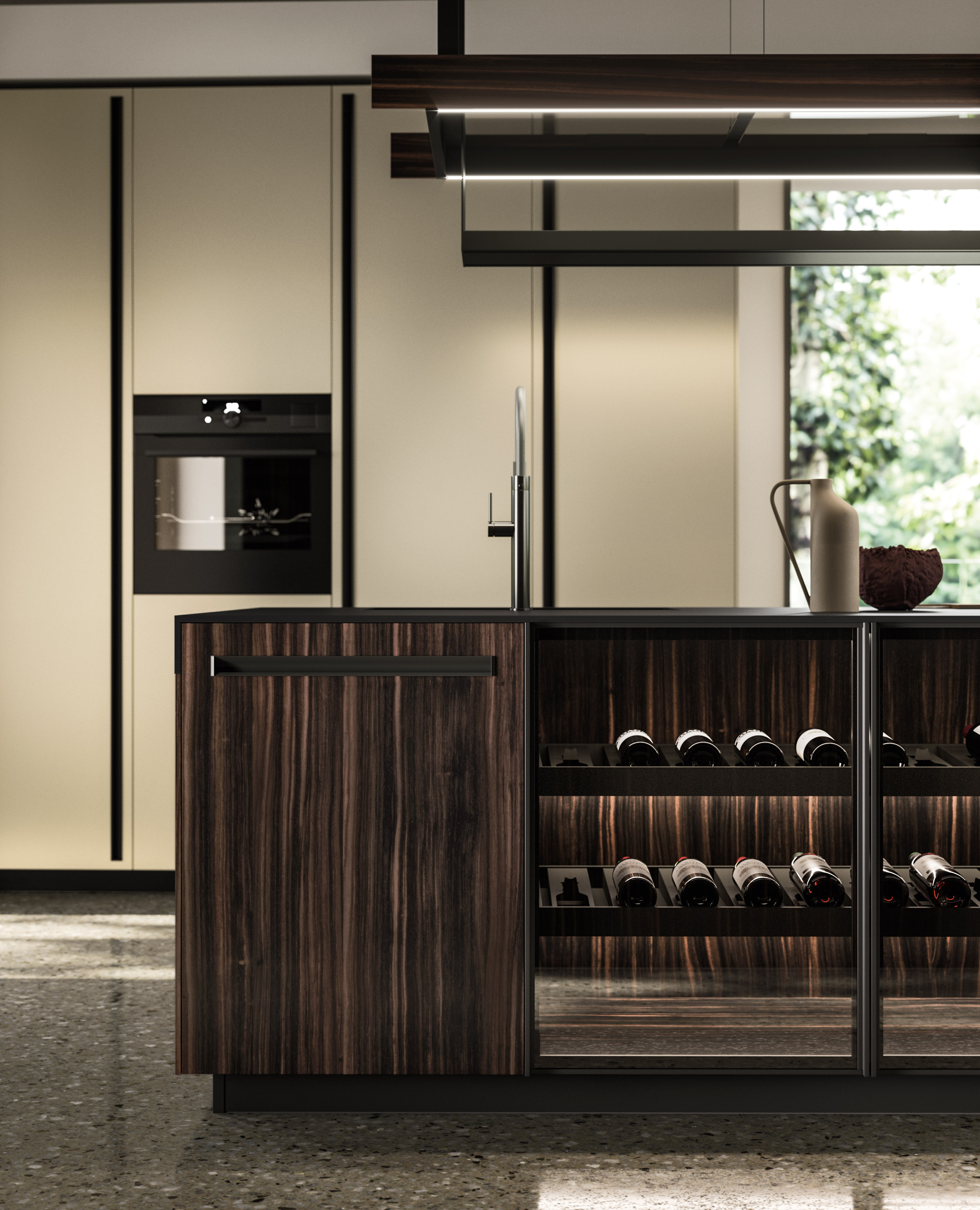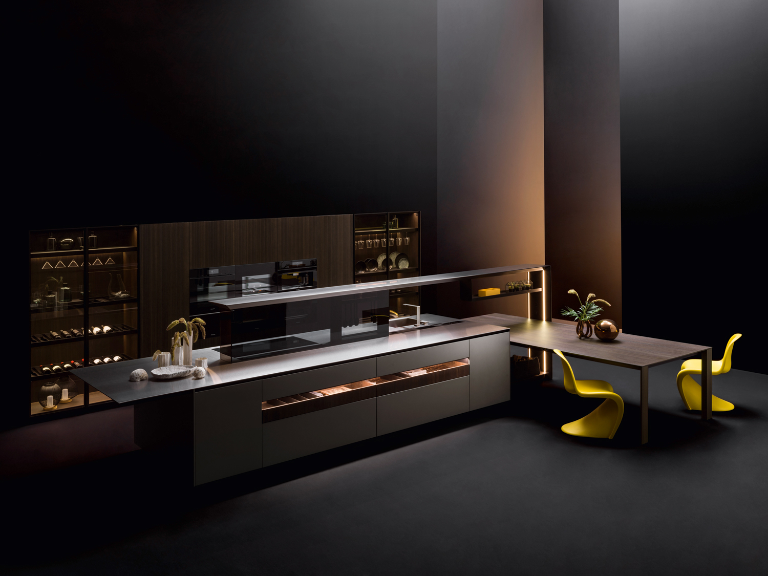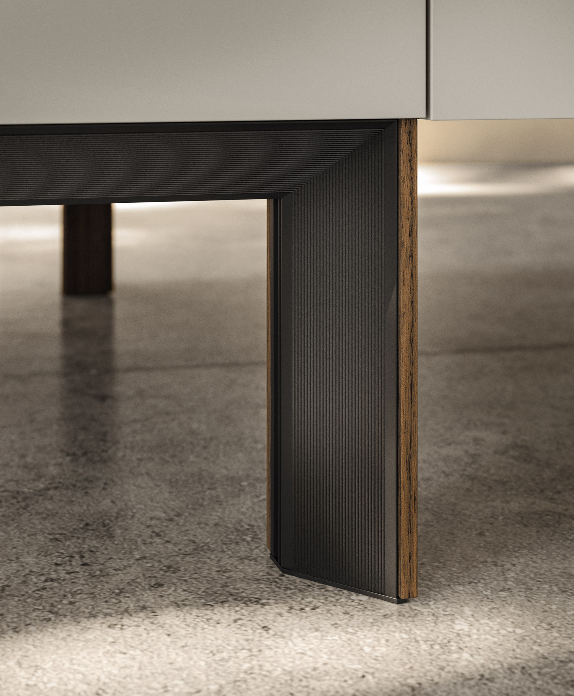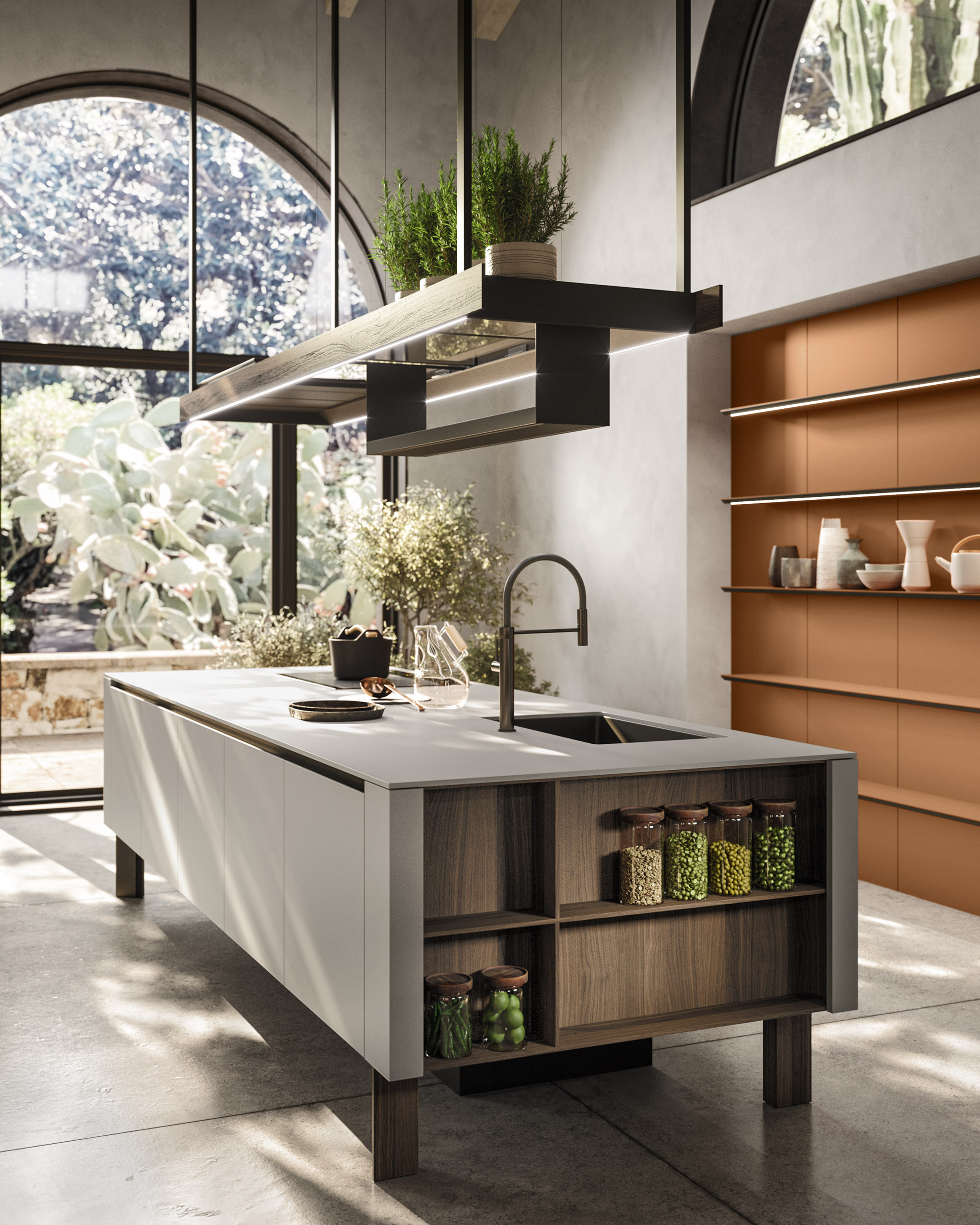 Alu_Project is the defining feature of the collection, characterised by its sleek black anodised aluminium profile. Serving as both structure and connector, it integrates effortlessly across suspended units, tables, workstations, and partitions. Its versatility enables limitless design configurations, bringing visual coherence and a bold architectural identity to every space.